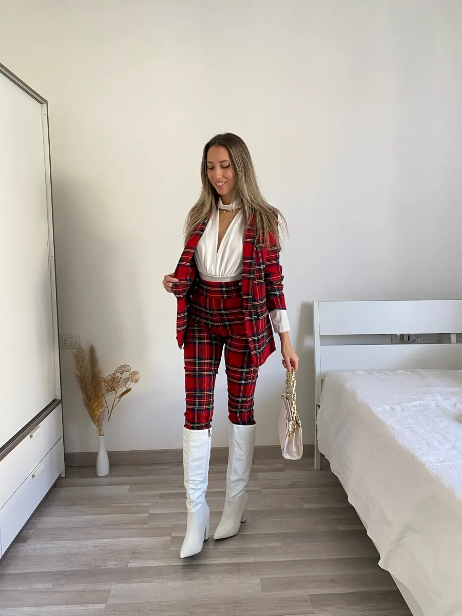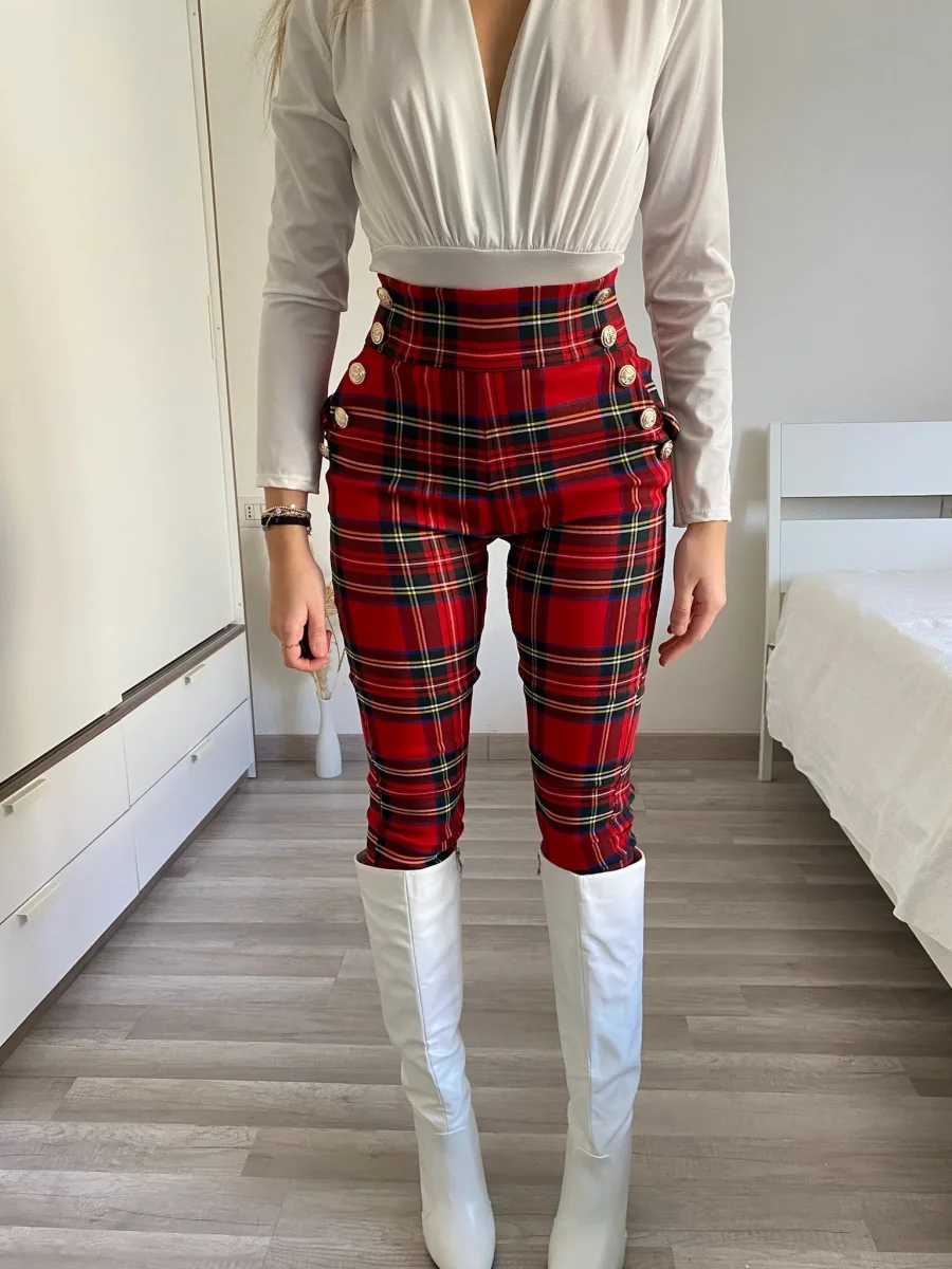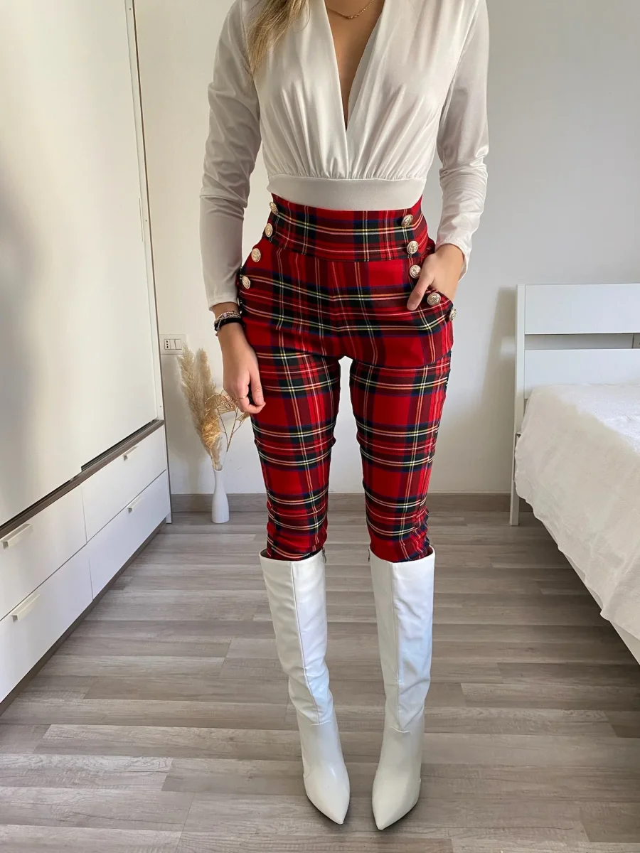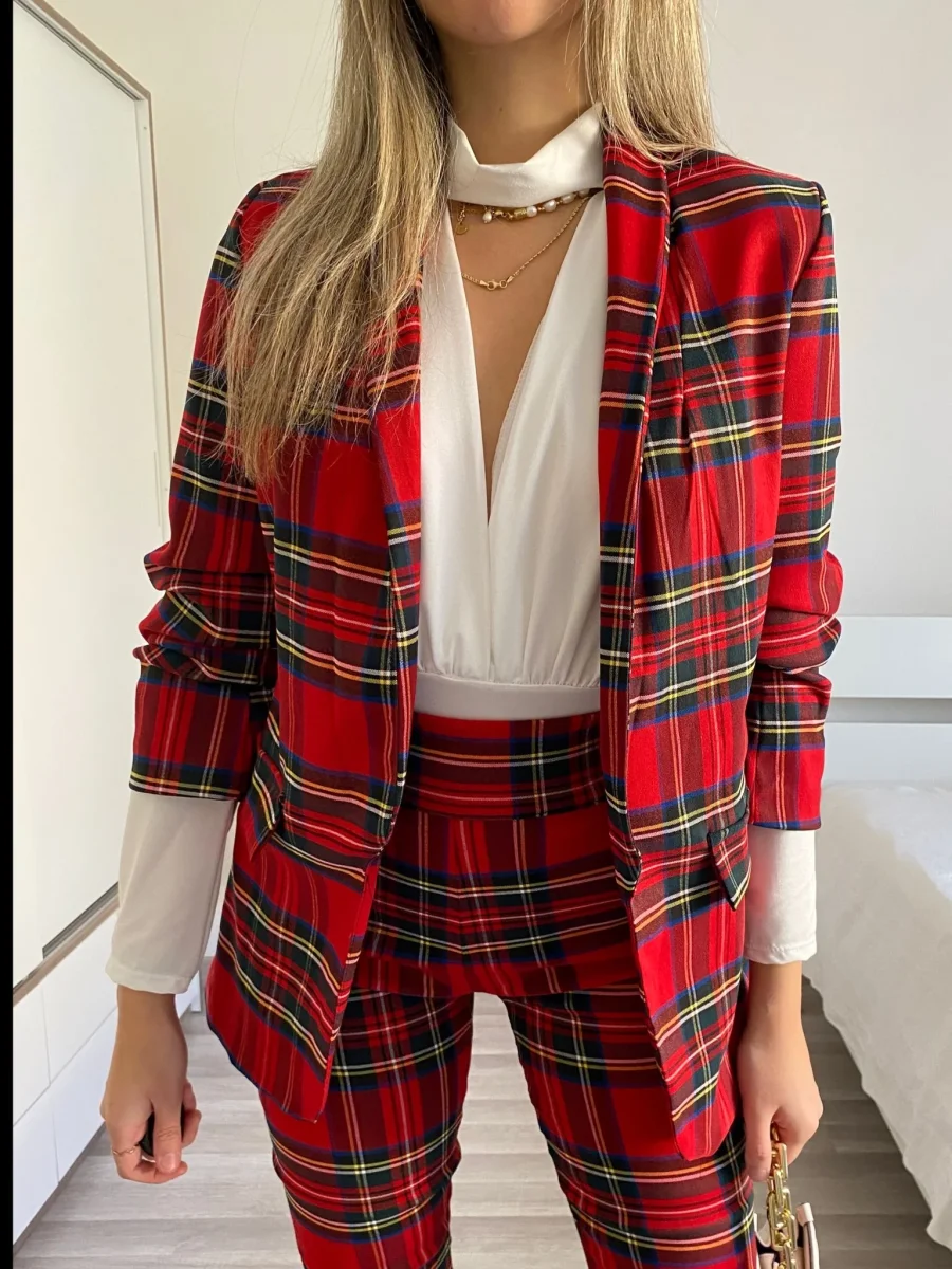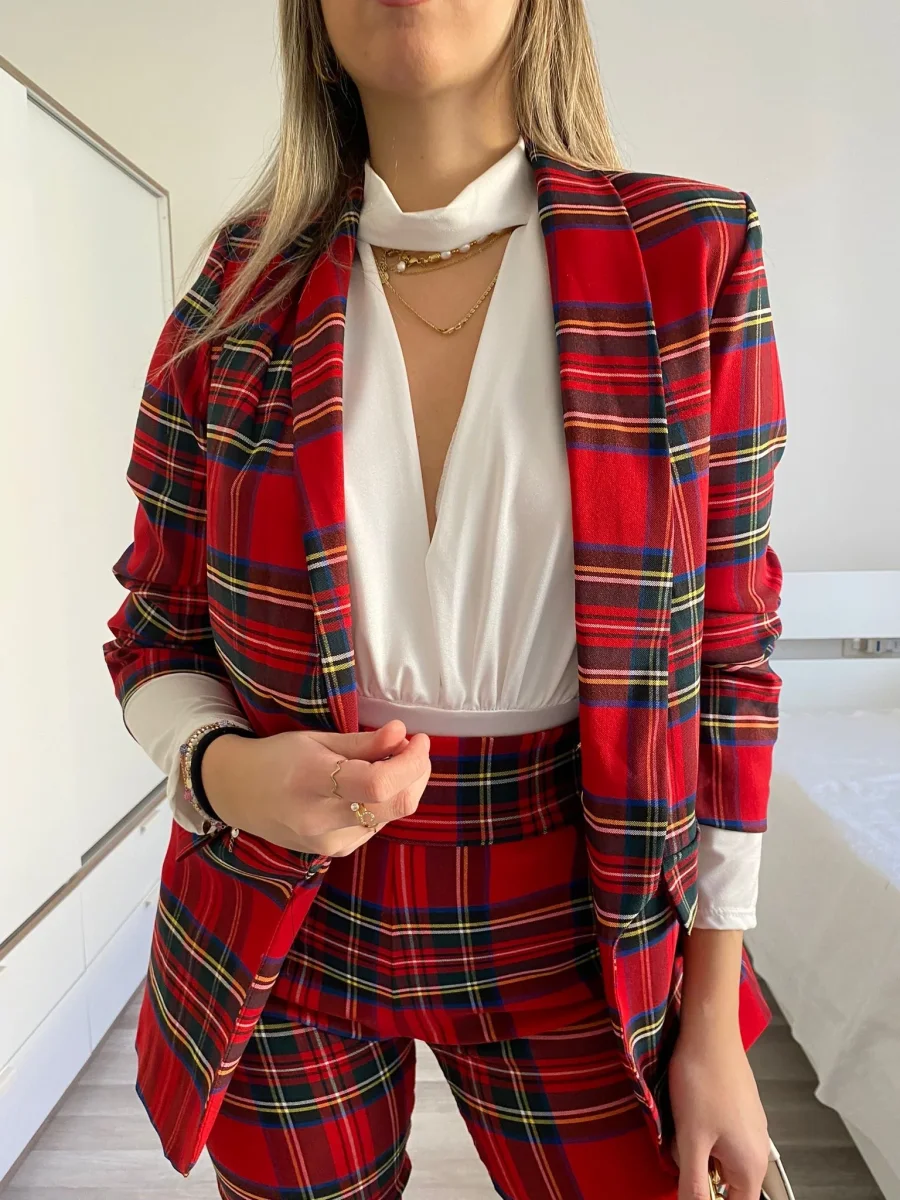 Completo composto da due pezzi venduti singolarmente. Giacca scozzese con fodera interna e manica arricciata. Pantalone aderente e elasticizzato con dettaglio in bottoni