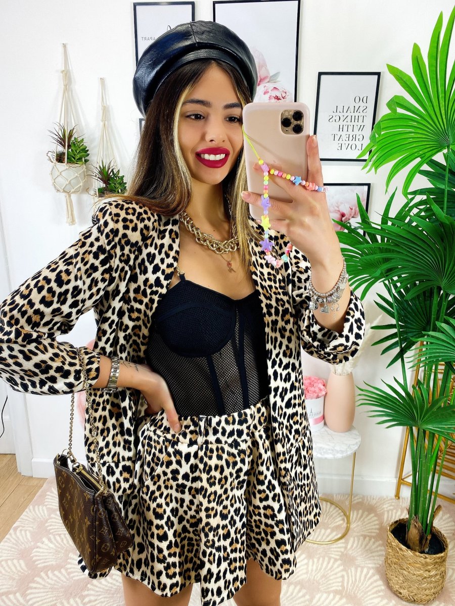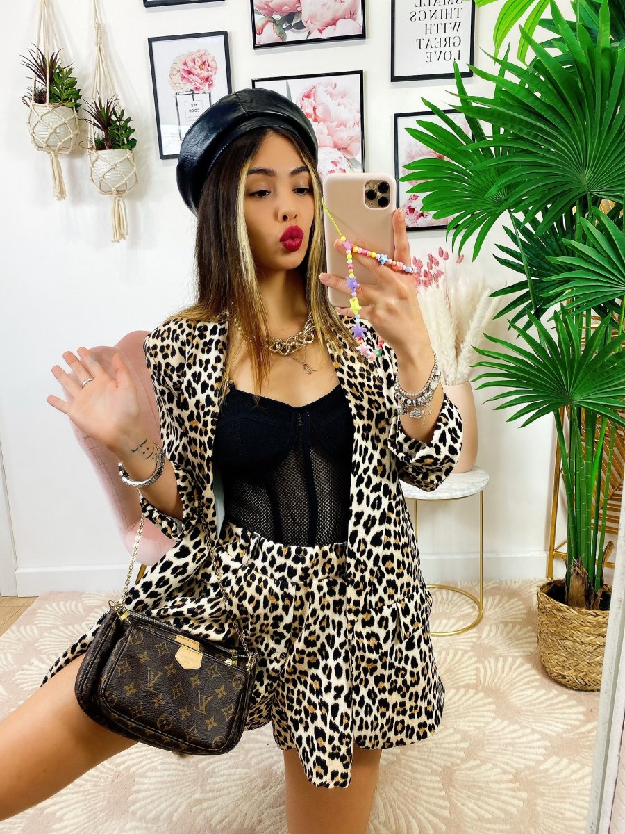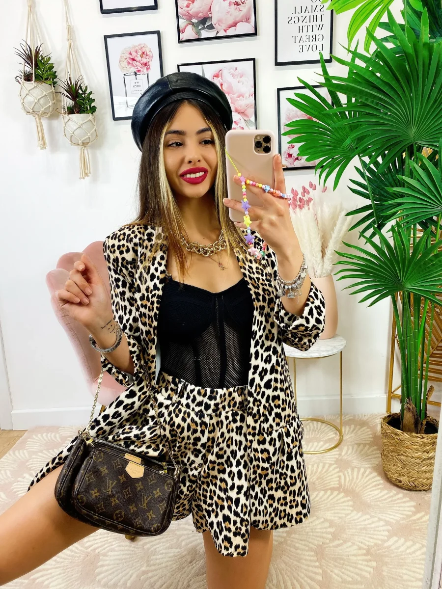 Completo due pezzi maculato base chiara, Short elasticizzato.