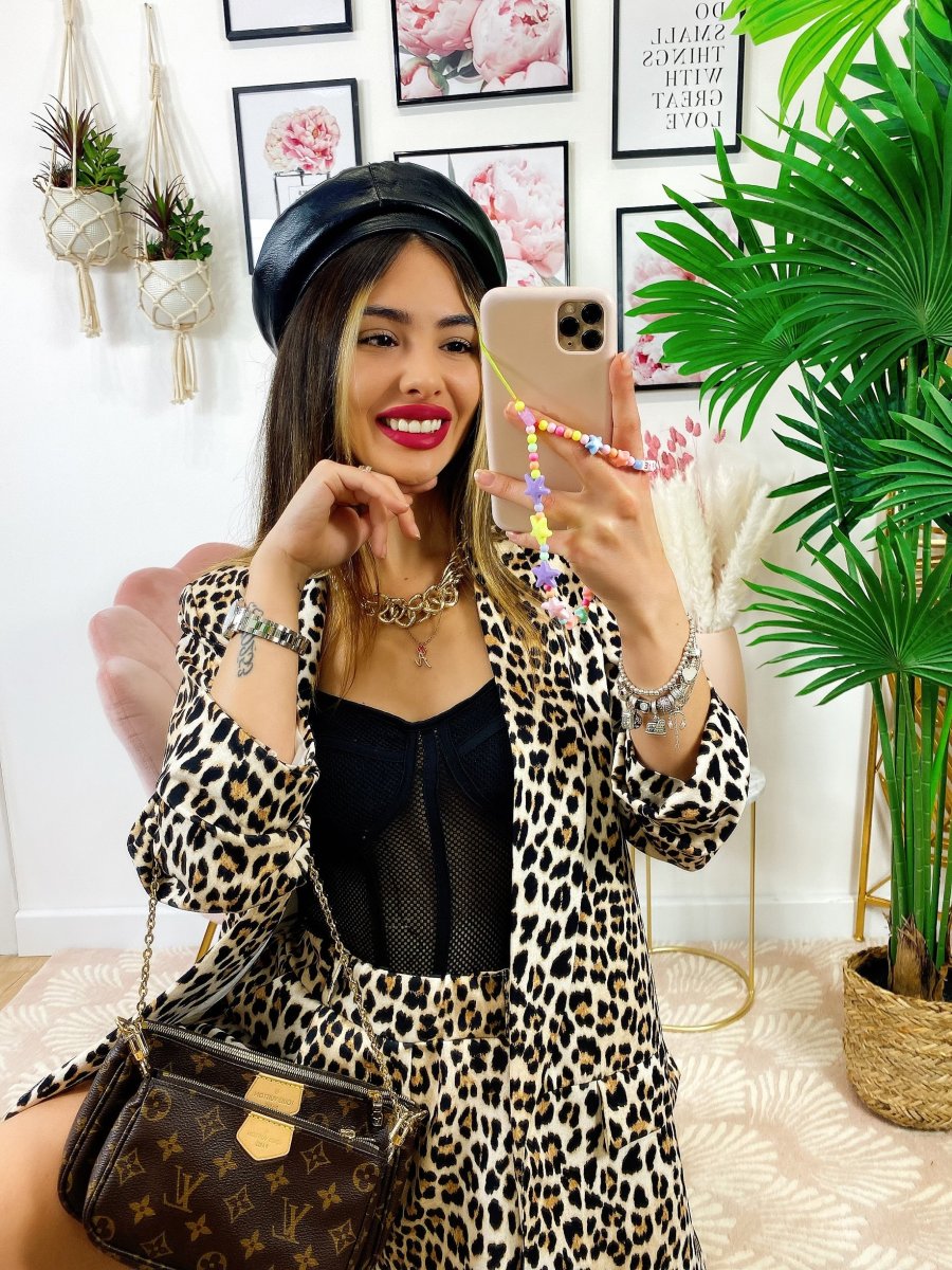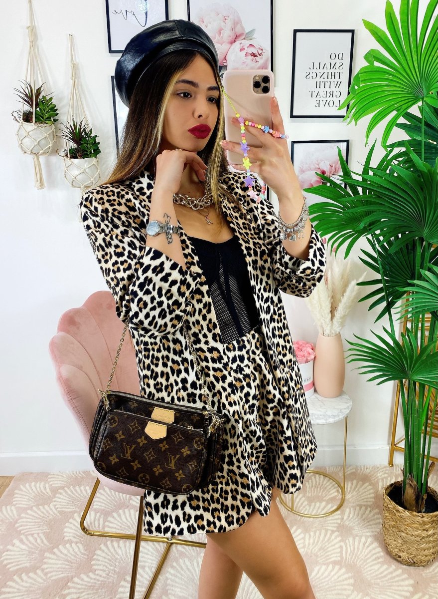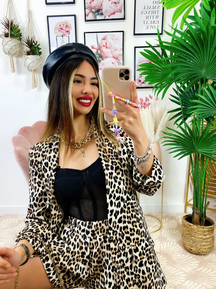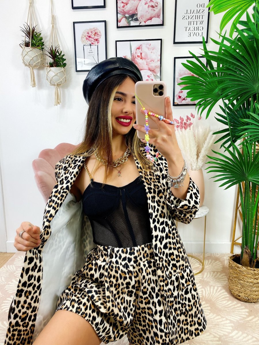 Completo due pezzi maculato base chiara, Short elasticizzato.