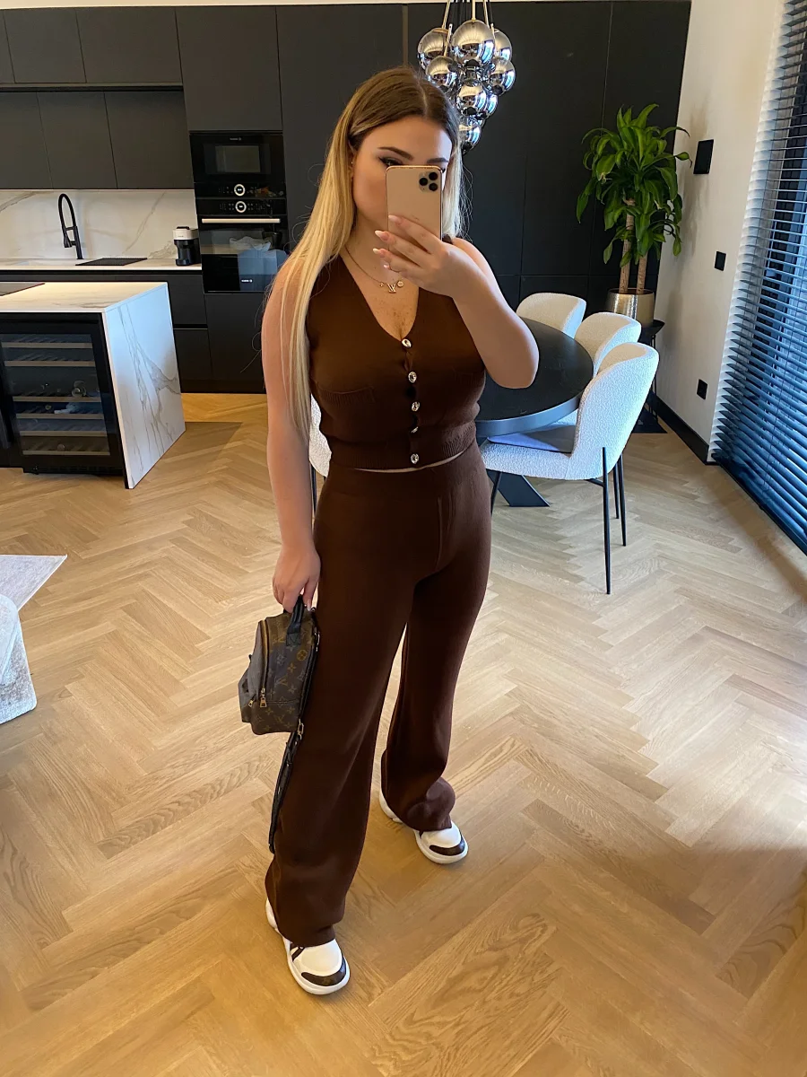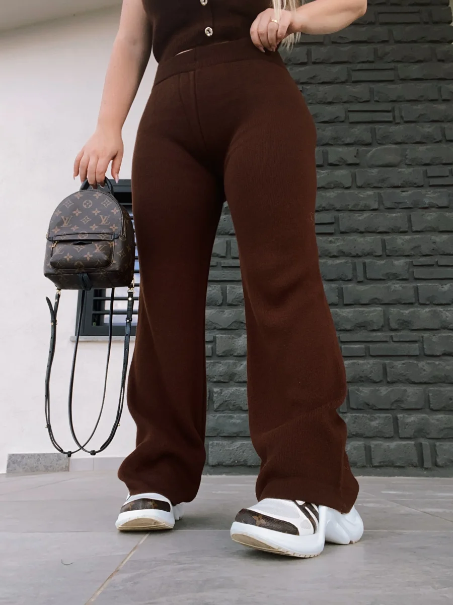 Completo in maglia composto da gilet e pantalone a palazzo, bottoni oro