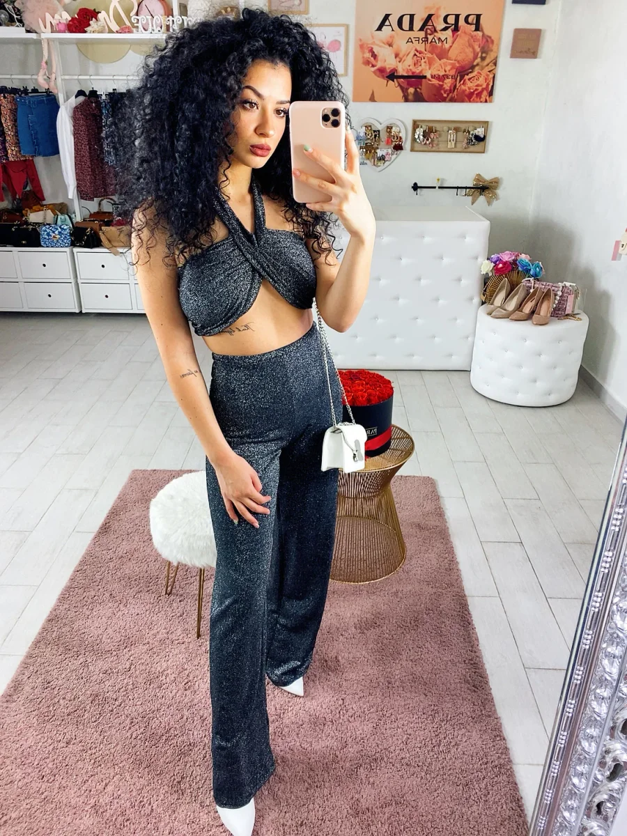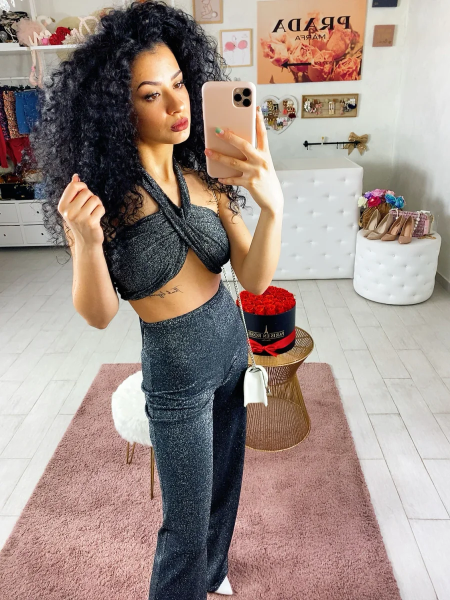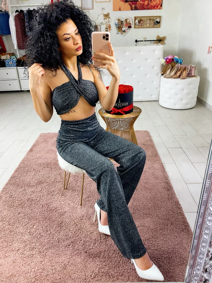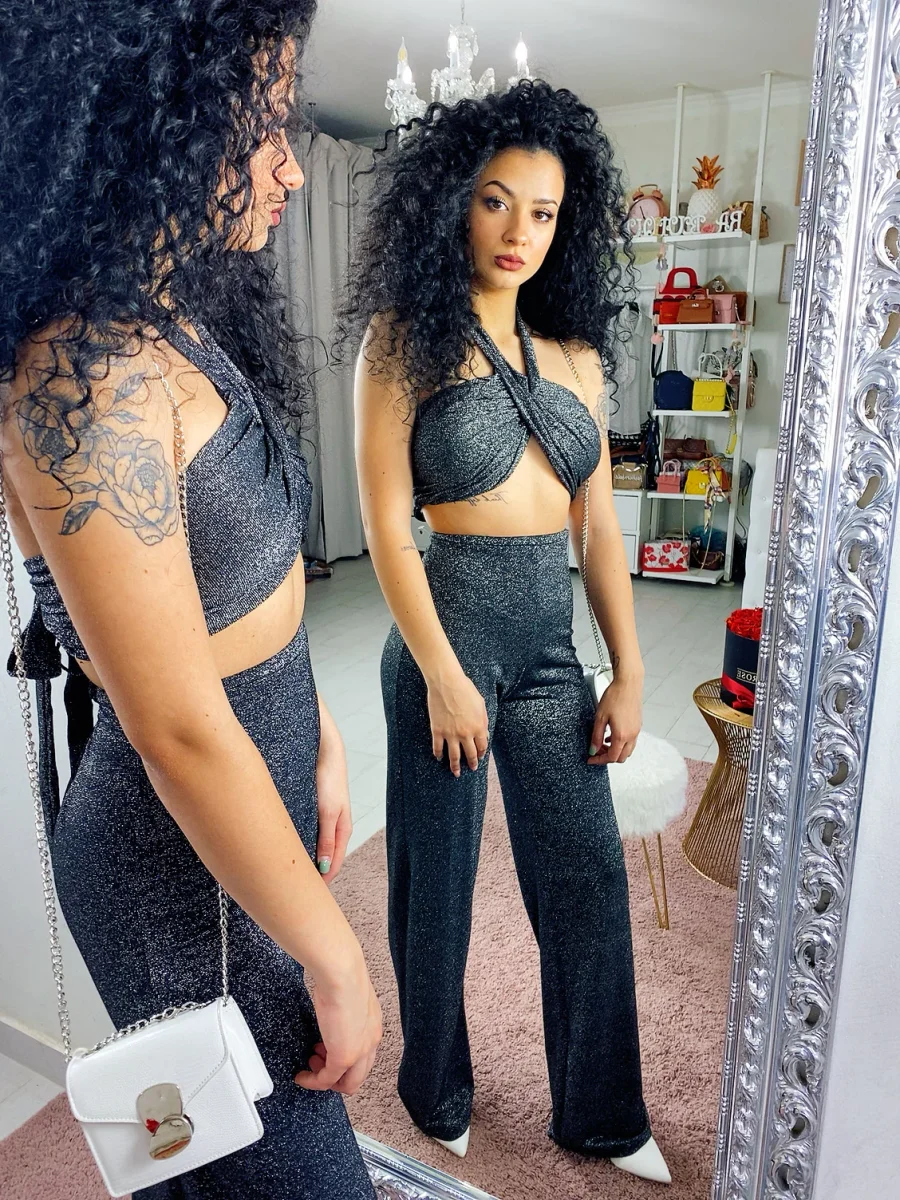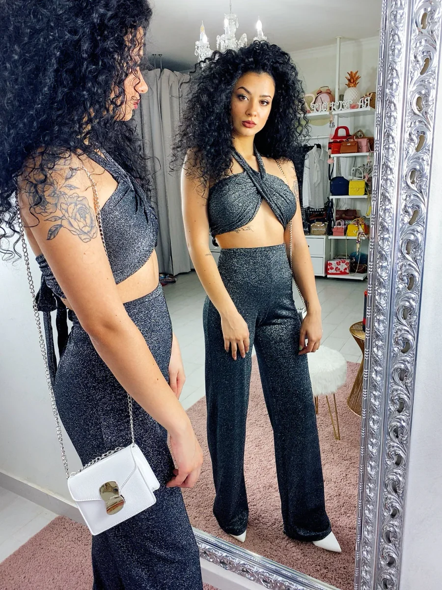 Completo composto da top e pantalone a zampa abbinato. Tessuto elasticizzato regolabile.