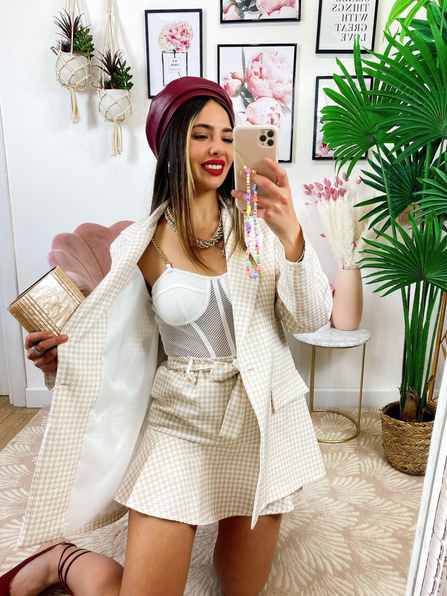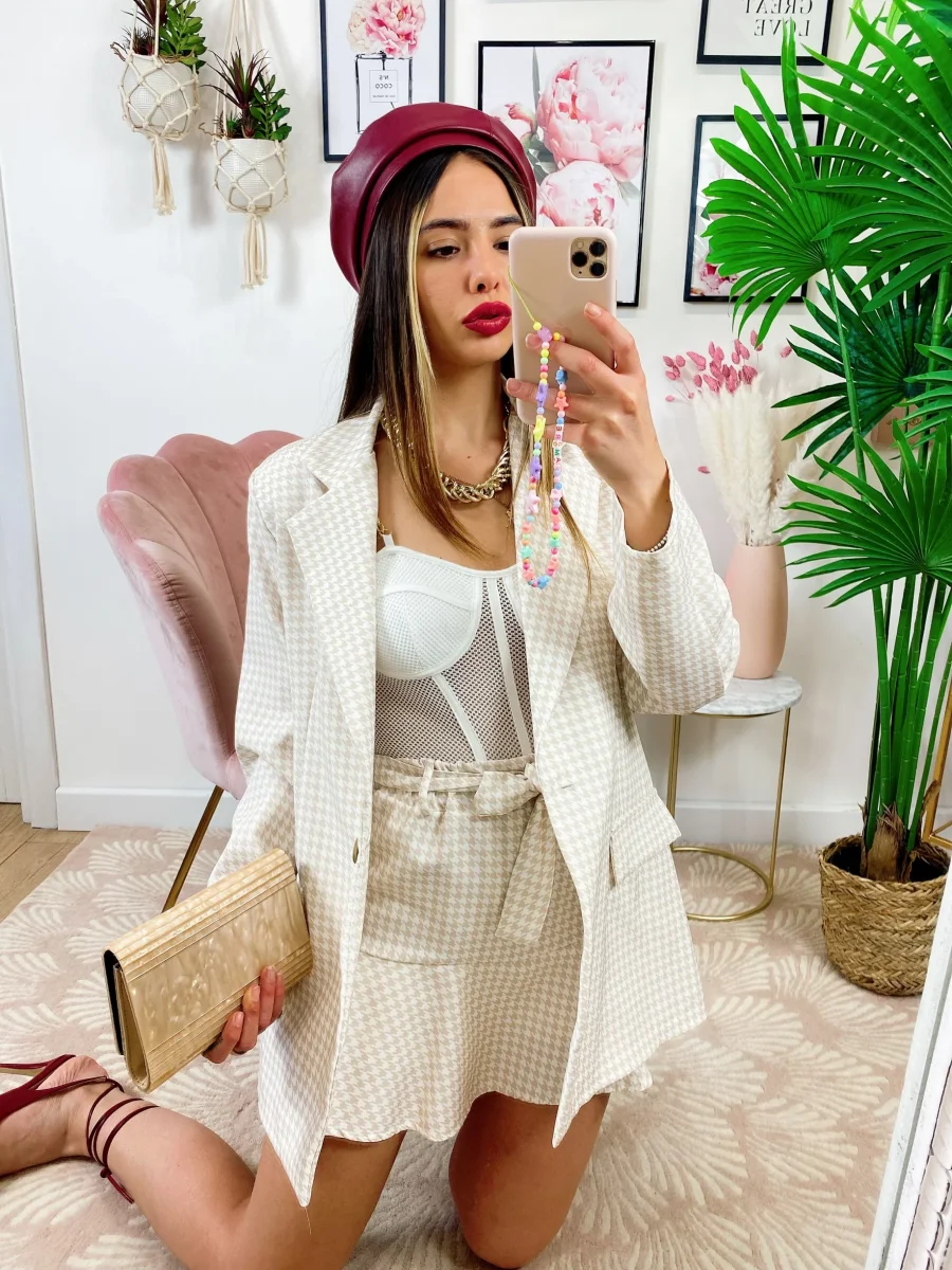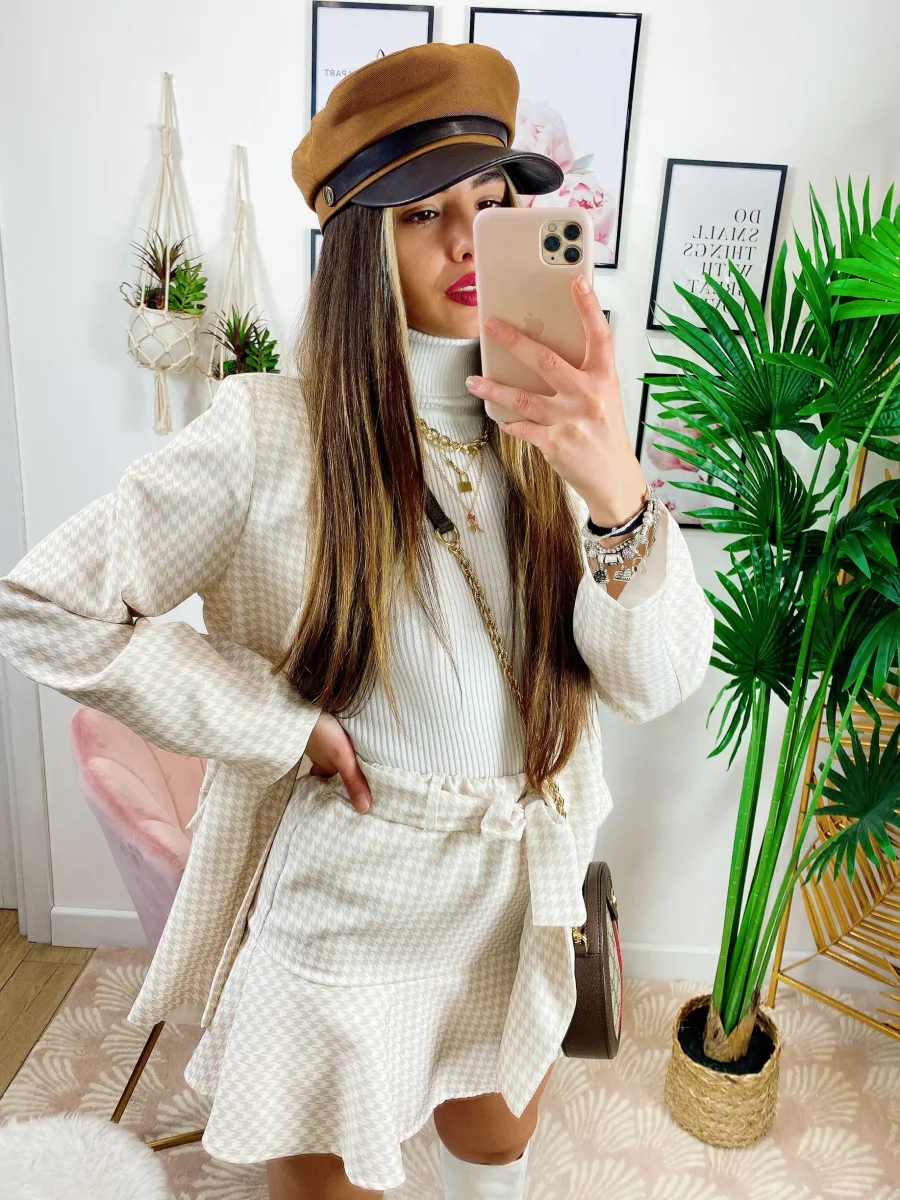 Completo Gonna e giacca pied de poule beige, gonna con pantaloncini sotto a balze e fiocco, giacca con un bottone comoda ed elasticizzata