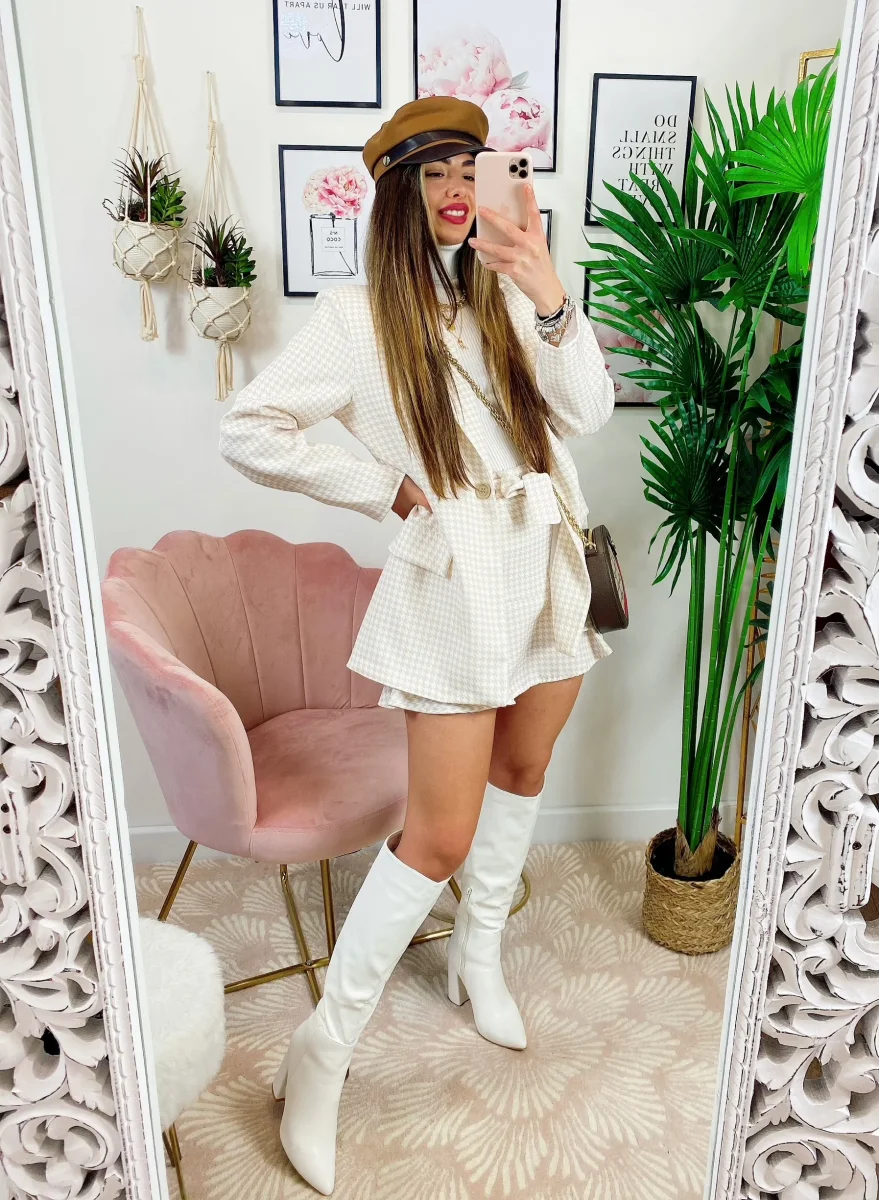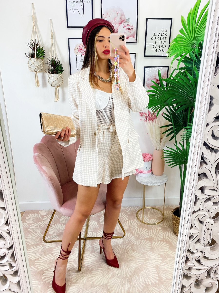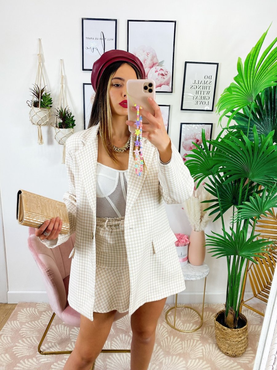 Completo Gonna e giacca pied de poule beige, gonna con pantaloncini sotto a balze e fiocco, giacca con un bottone comoda ed elasticizzata