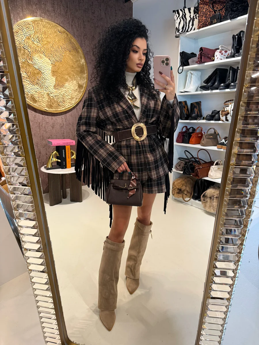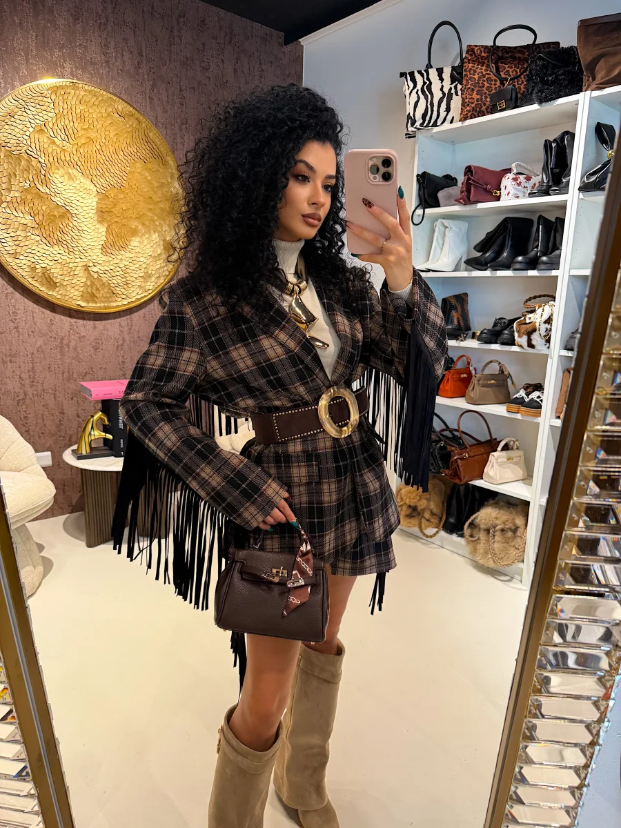Questo elegante completo in tweed sui toni del marrone è perfetto per l’autunno. La giacca foderata con spalline imbottite garantisce una vestibilità comoda, mentre i pantaloncini elasticizzati sono caldi e confortevoli. Le frange laterali donano un tocco di stile in più a questo completo elegante e di alta qualità.