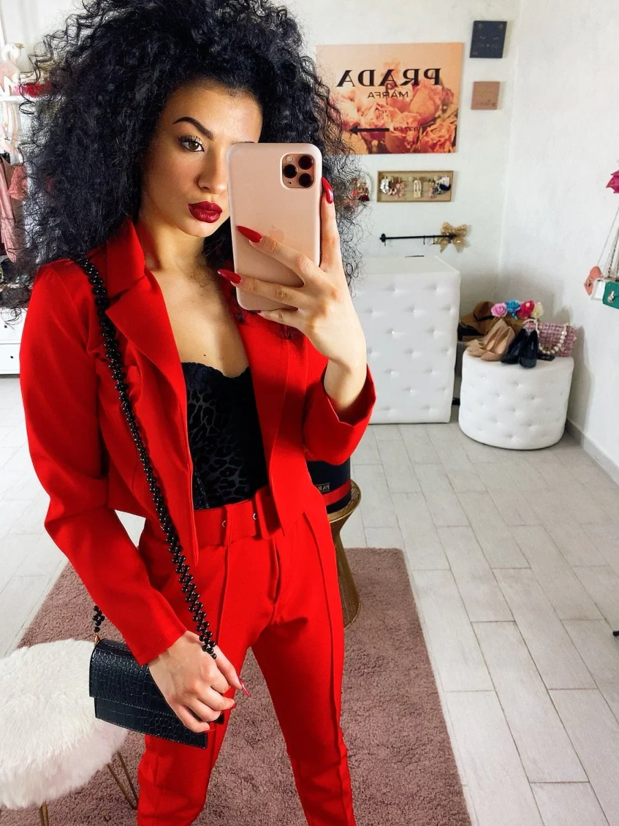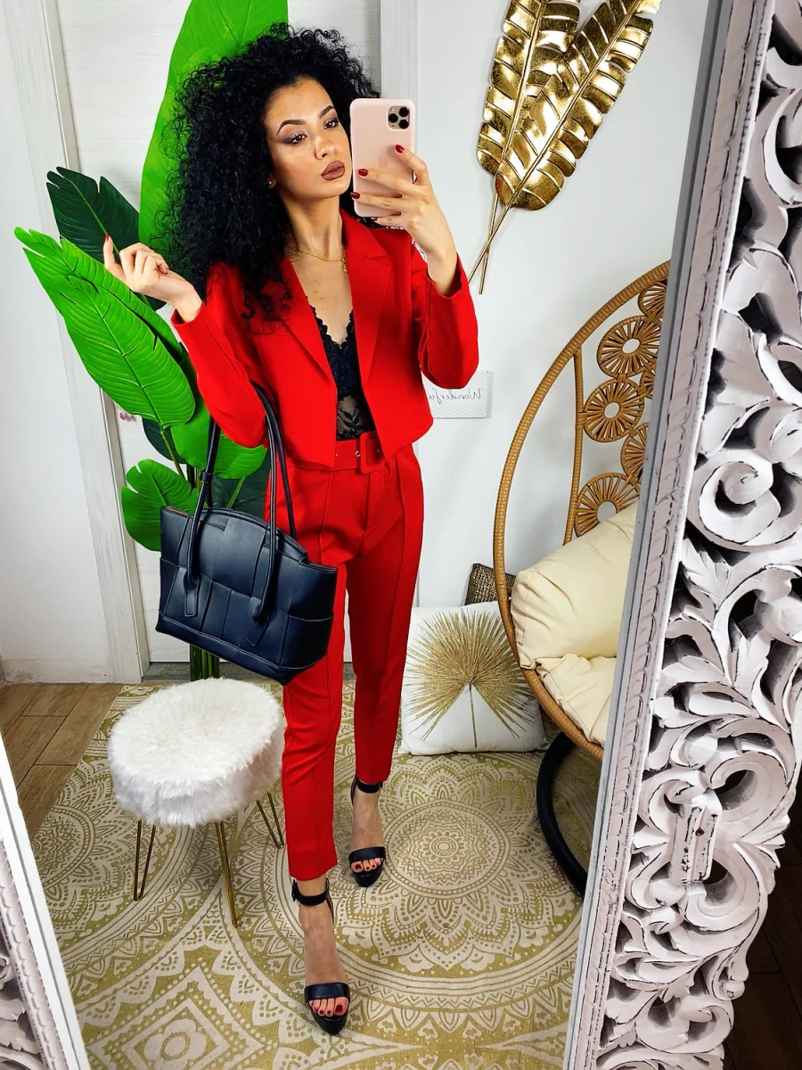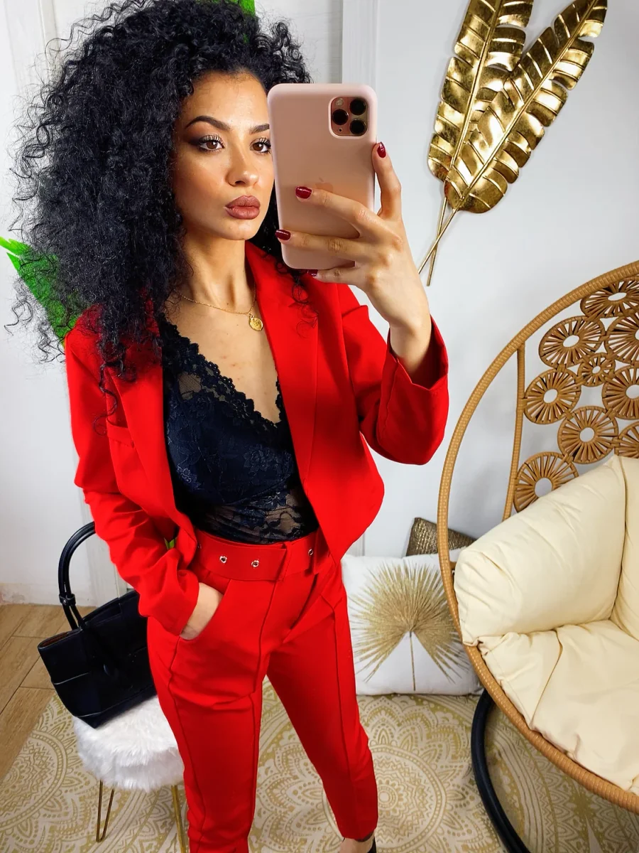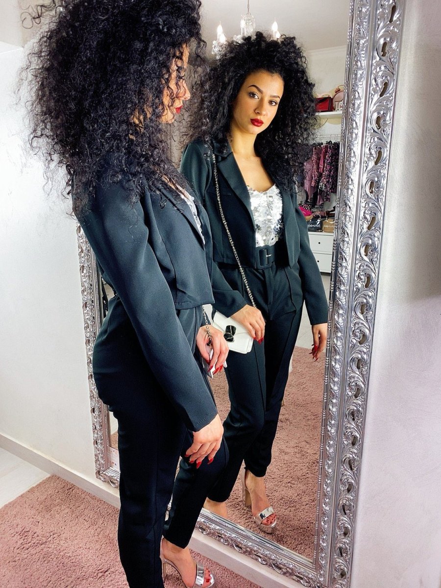 Completo composto da giacchino corto a manica lunga a e pantalone morbido con cintura. Perfetto e elegante ma dalla vestibilità molto piccola.