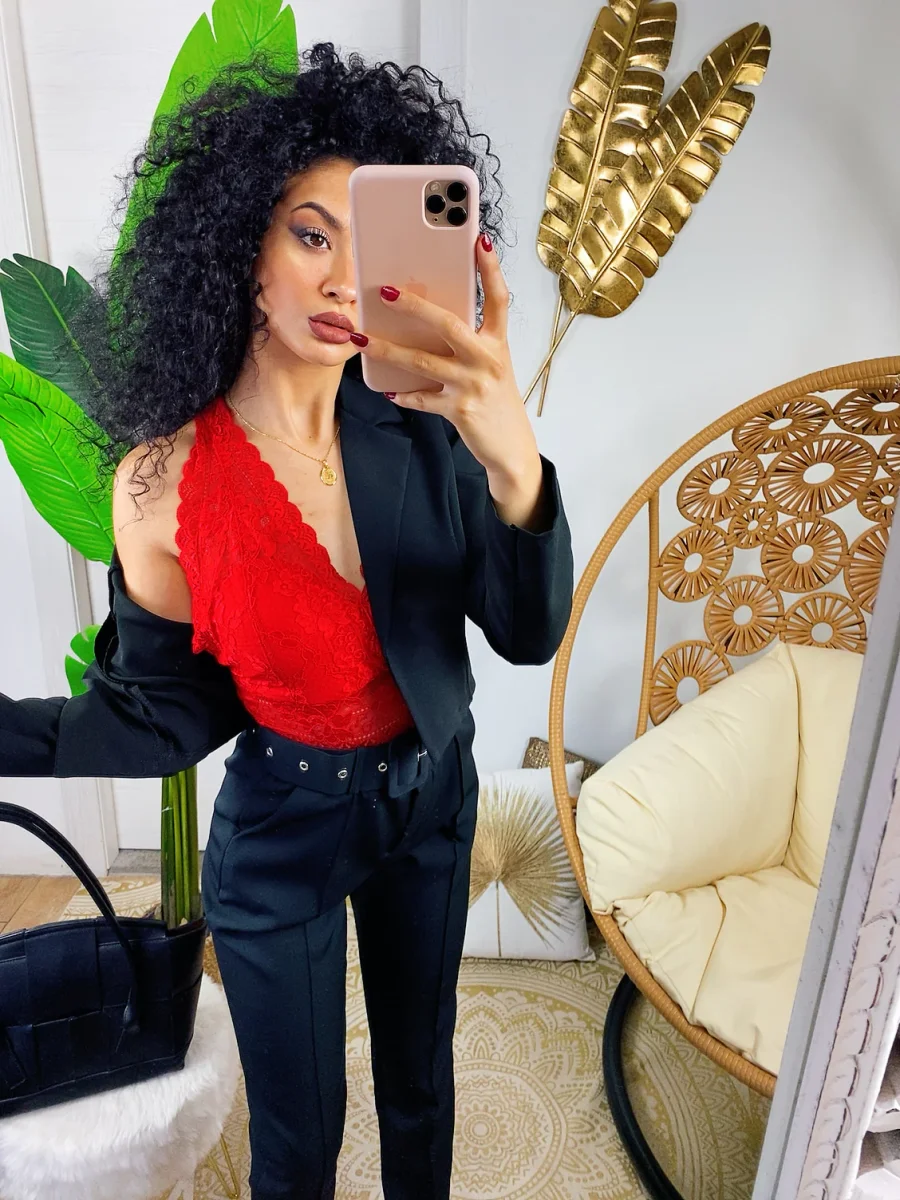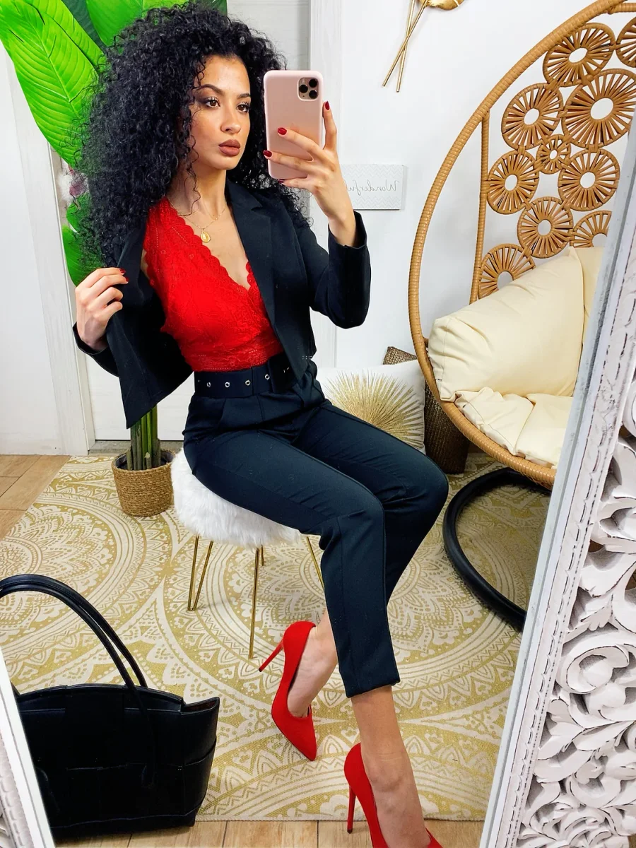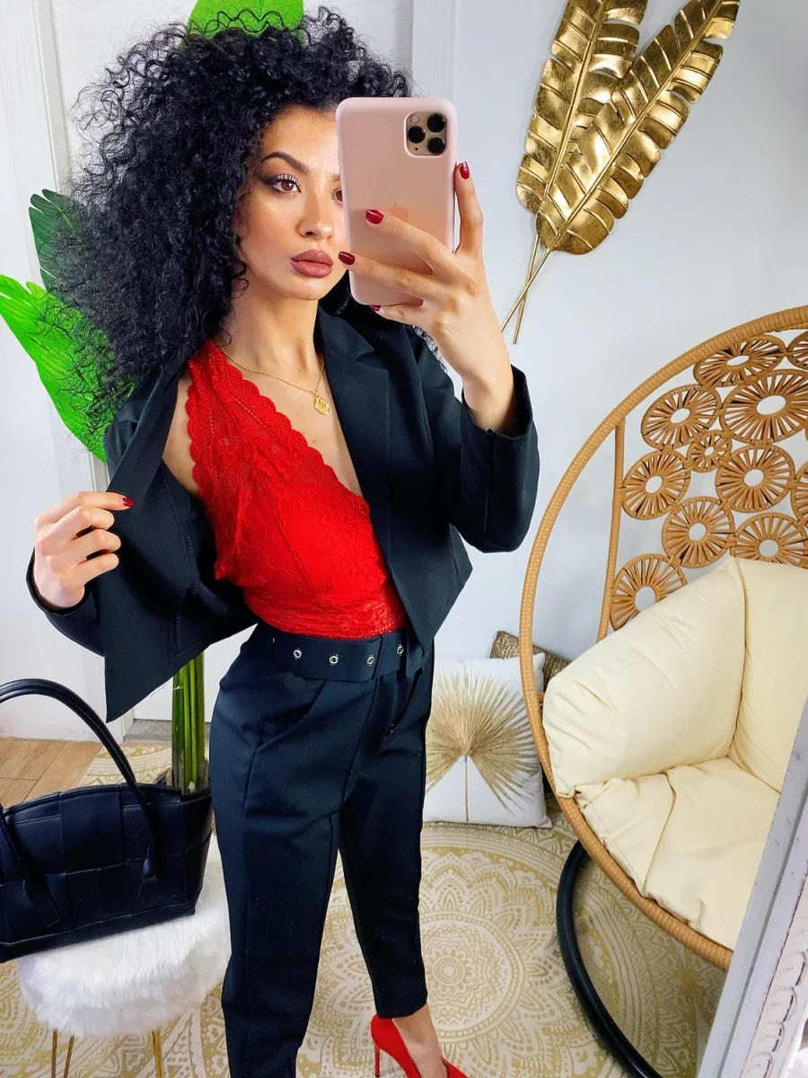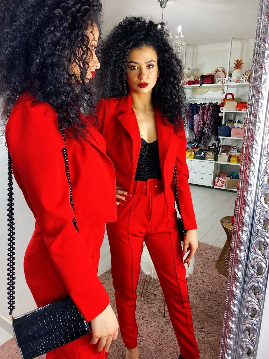 Completo composto da giacchino corto a manica lunga a e pantalone morbido con cintura. Perfetto e elegante ma dalla vestibilità molto piccola.