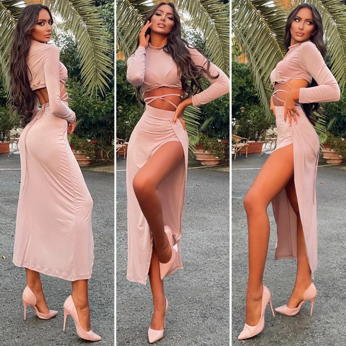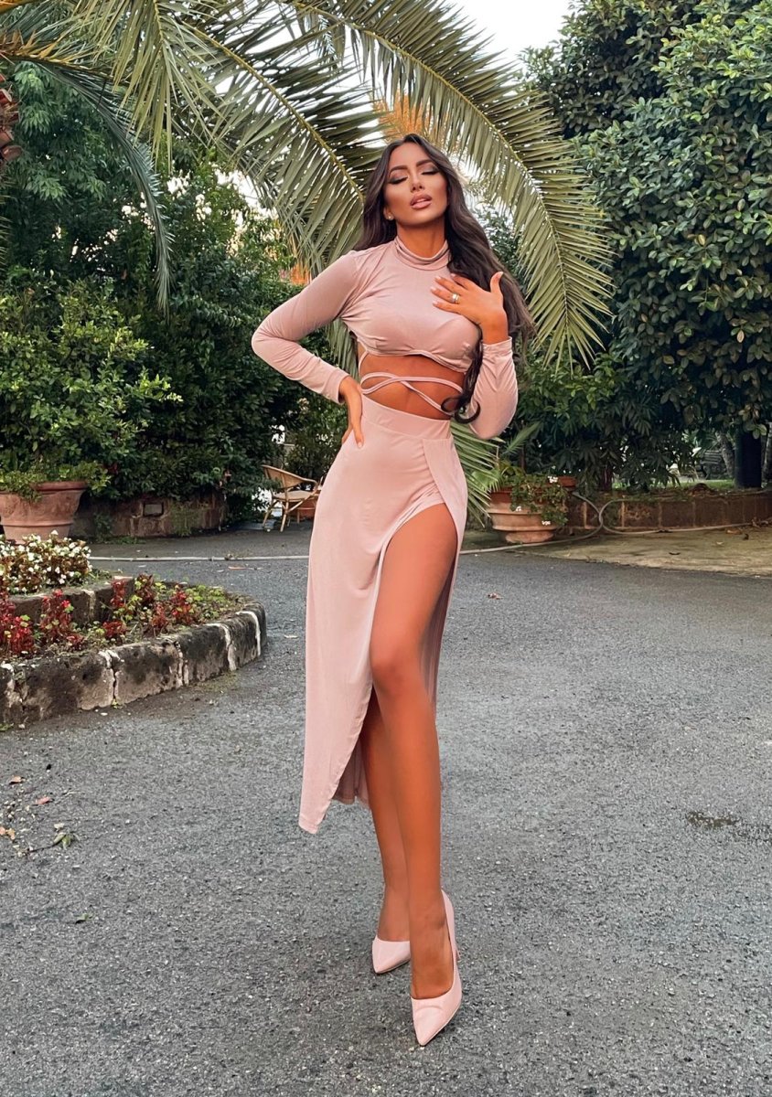 Completo due pezzi composto da top più gonna con spacco in tessuto molto elasticizzato.