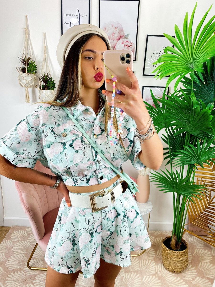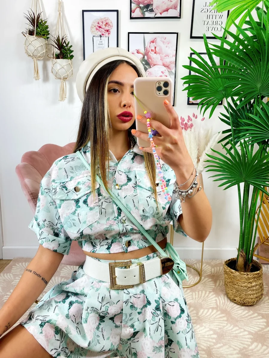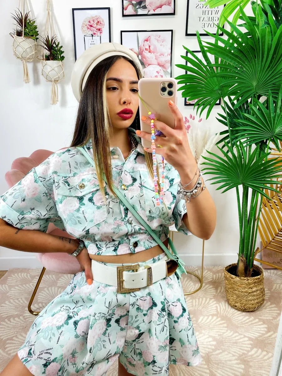 Completo etnico Short e Giacca base Verdeacqua, ottimo tessuto con stampa.