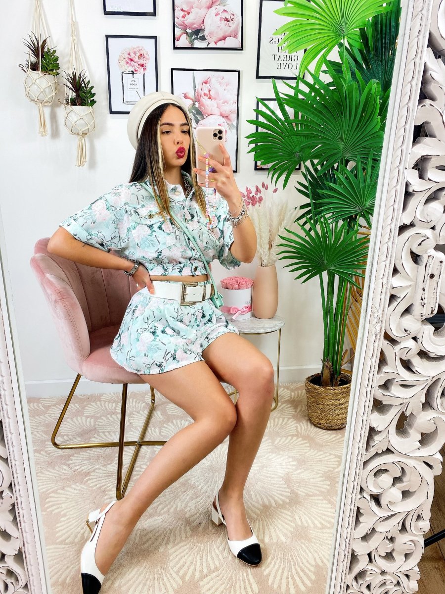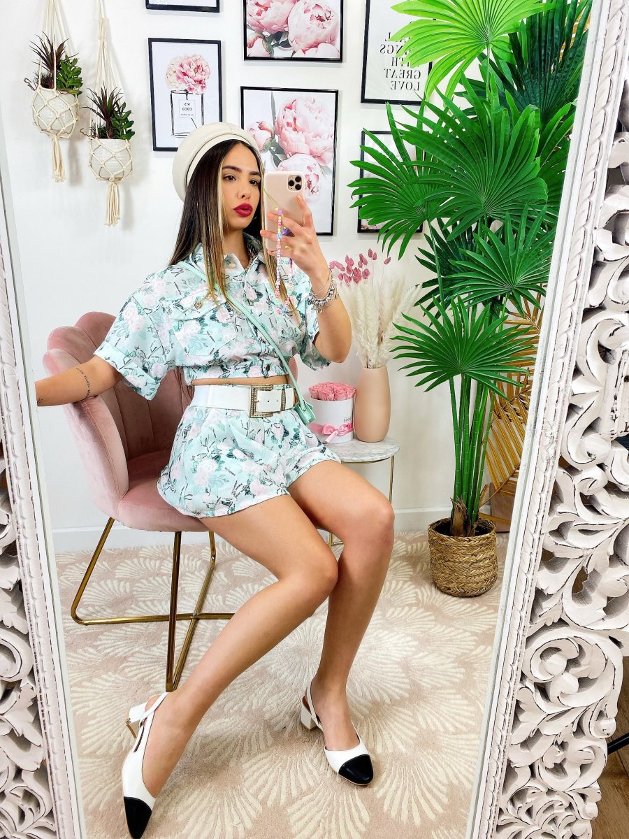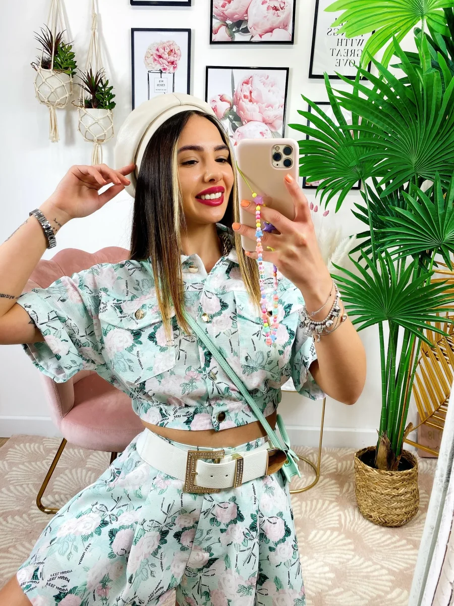 Completo etnico Short e Giacca base Verdeacqua, ottimo tessuto con stampa.