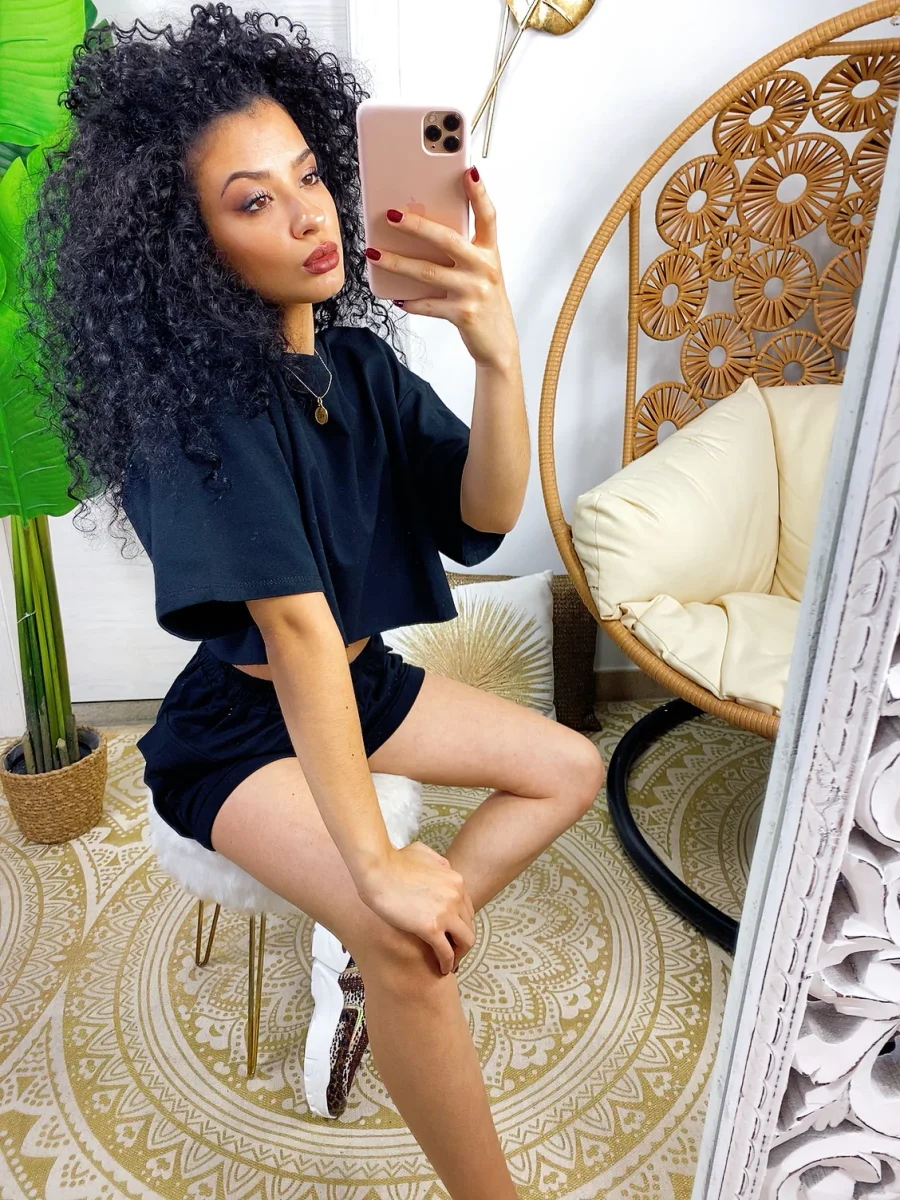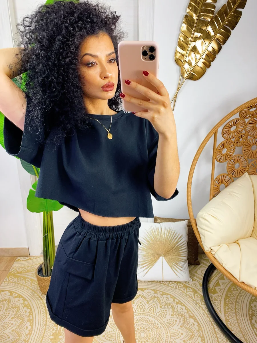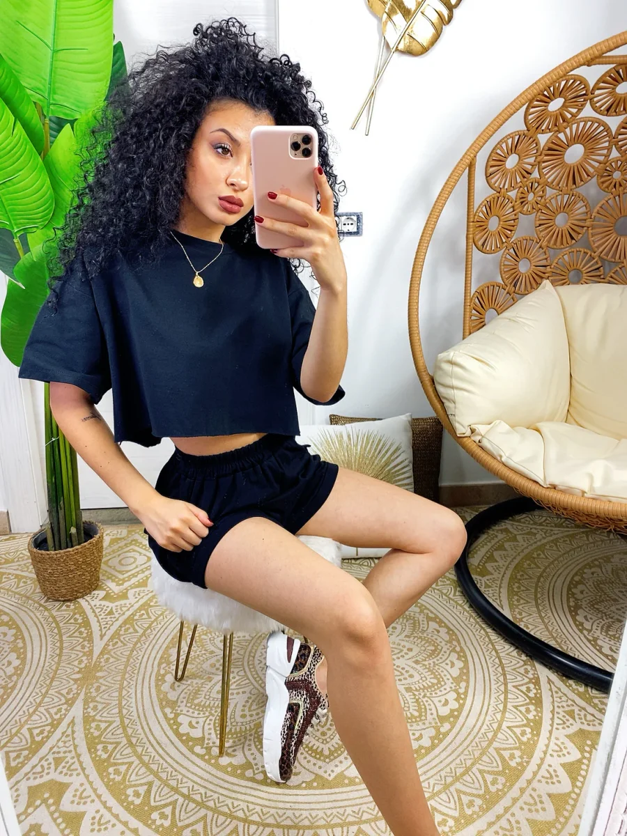 Completo maglia e pantaloncino sportivo nero. Elasticizzato e garzato per la stagione estiva.