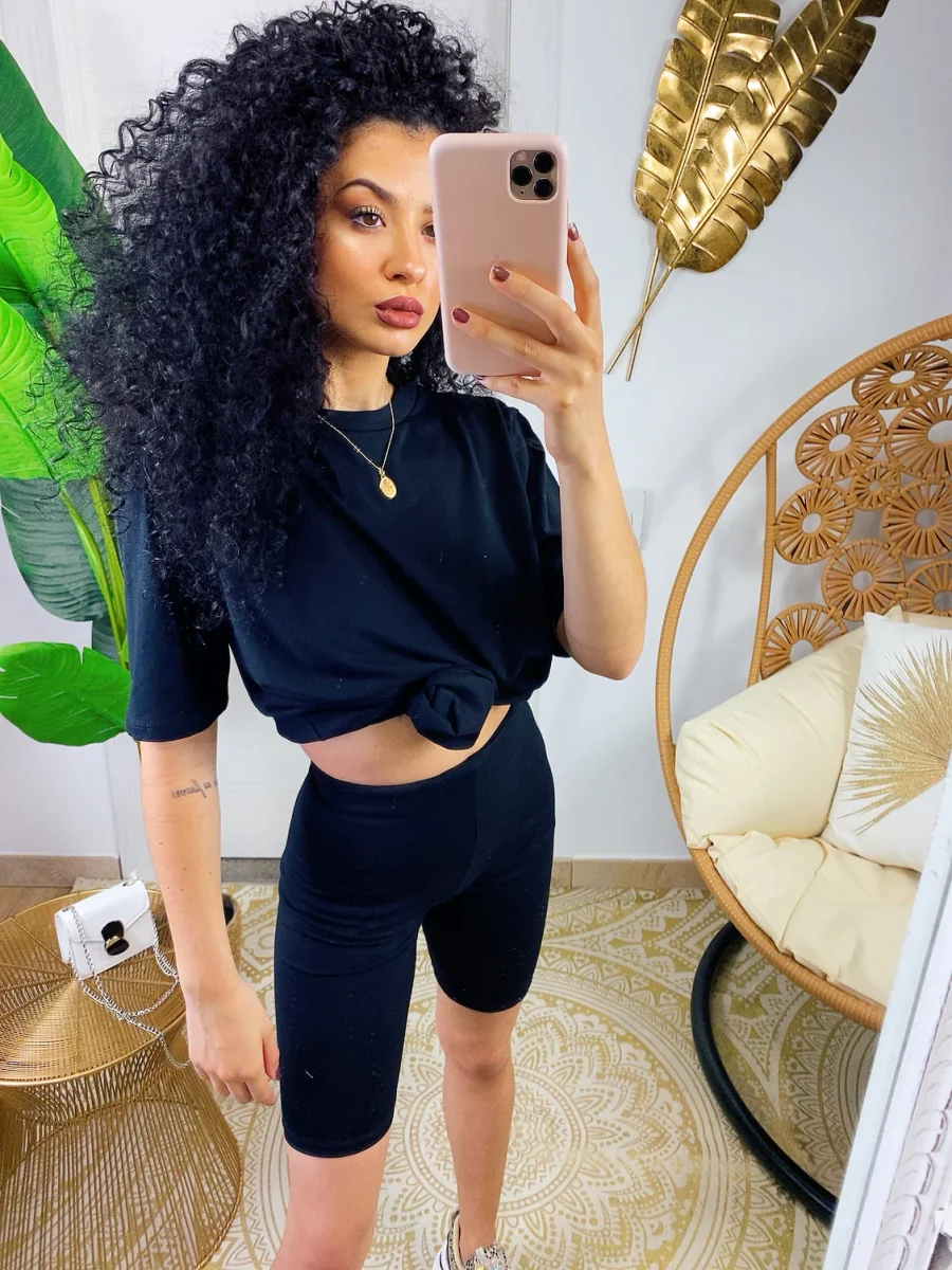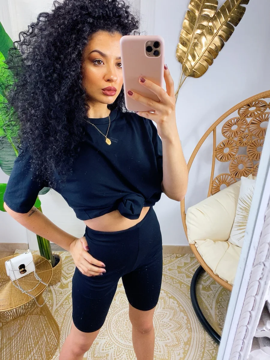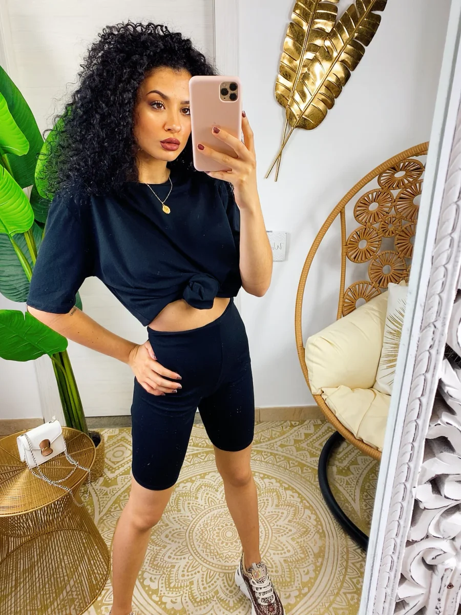 Completo maglia e pantaloncino sportivo nero. Elasticizzato, maxi maglia da legare con nodo è leggins al ginocchio