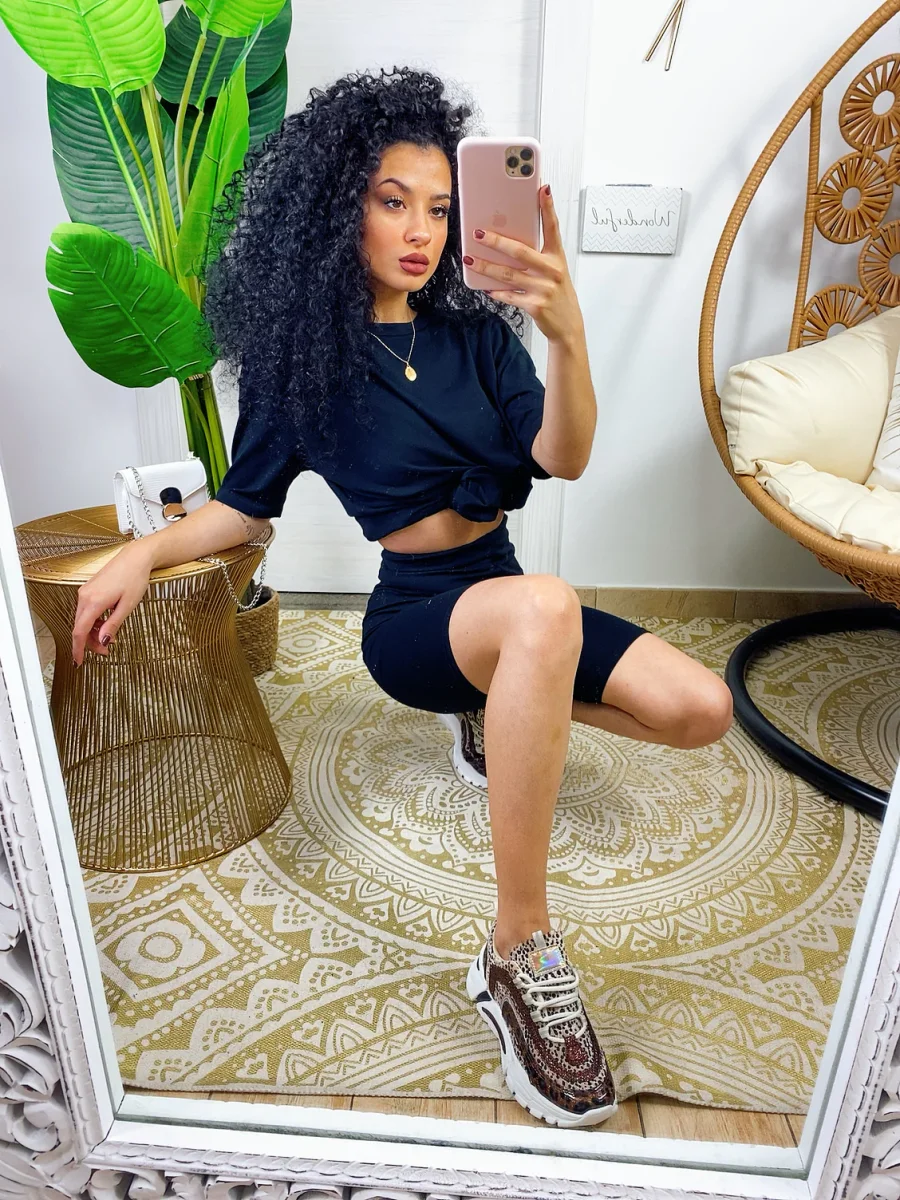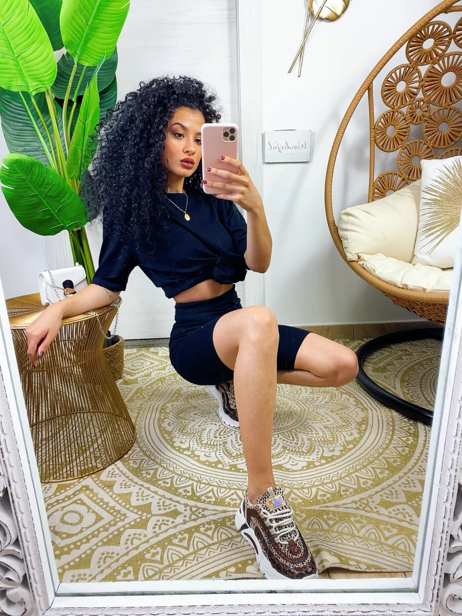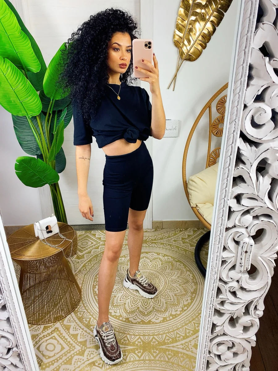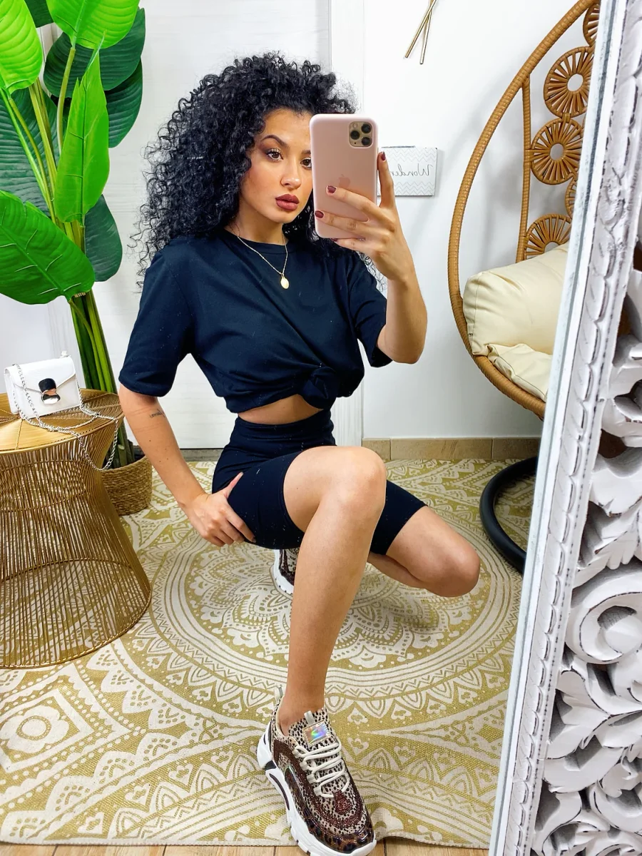 Completo maglia e pantaloncino sportivo nero. Elasticizzato, maxi maglia da legare con nodo è leggins al ginocchio