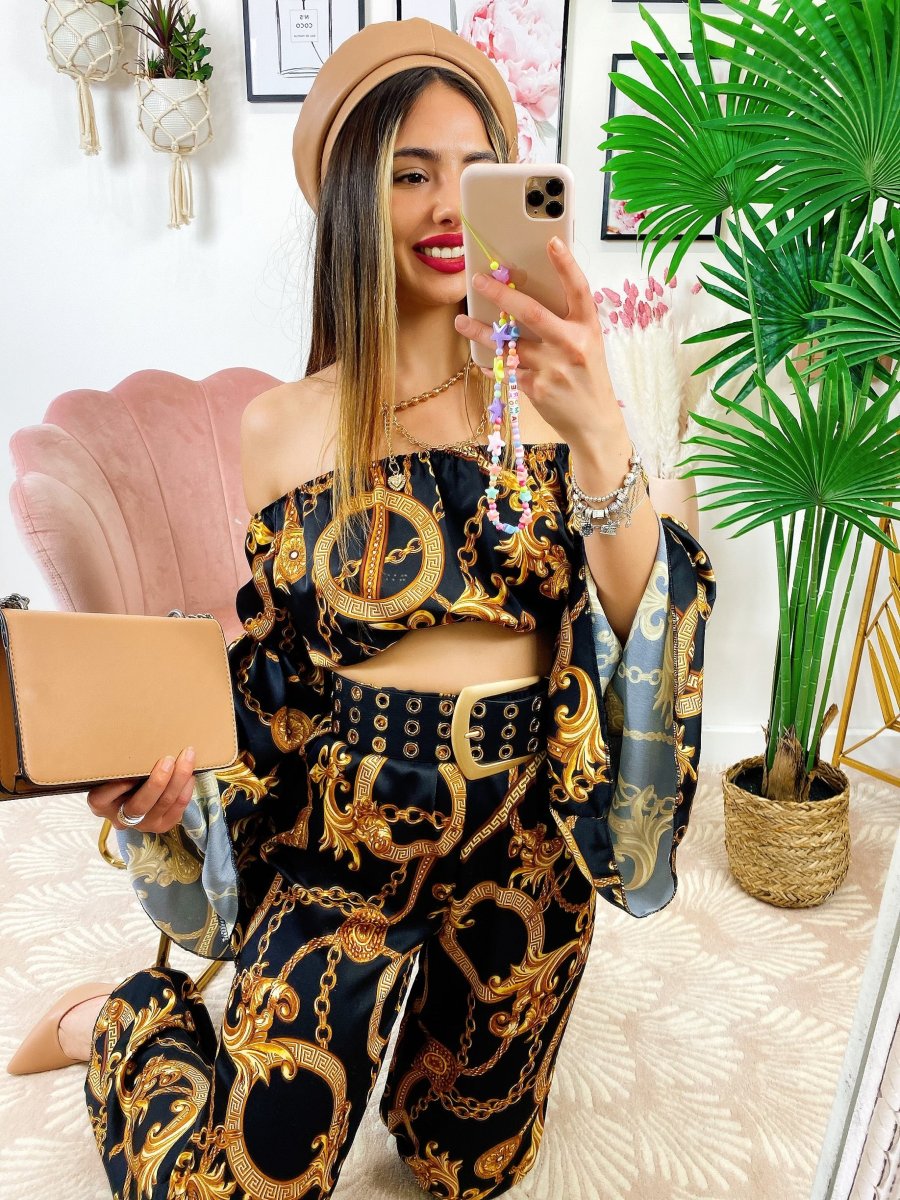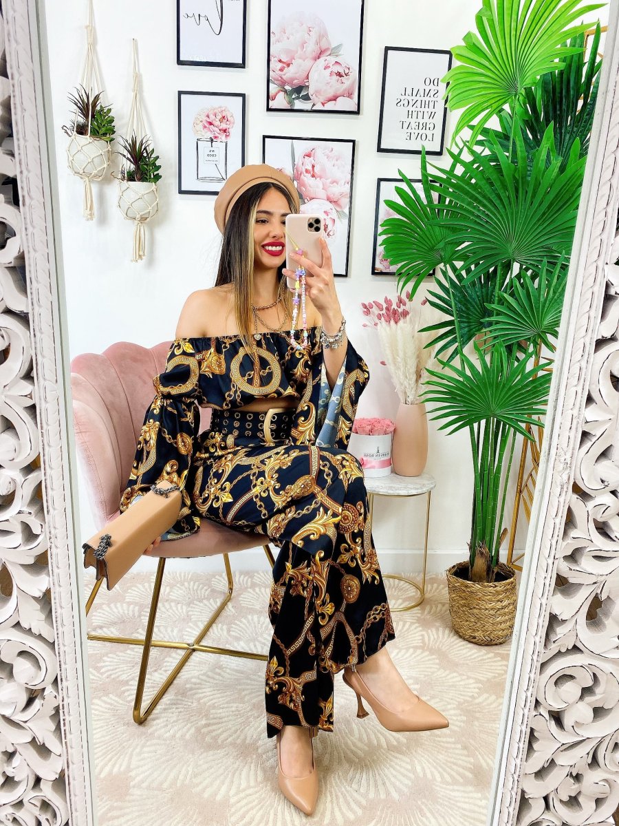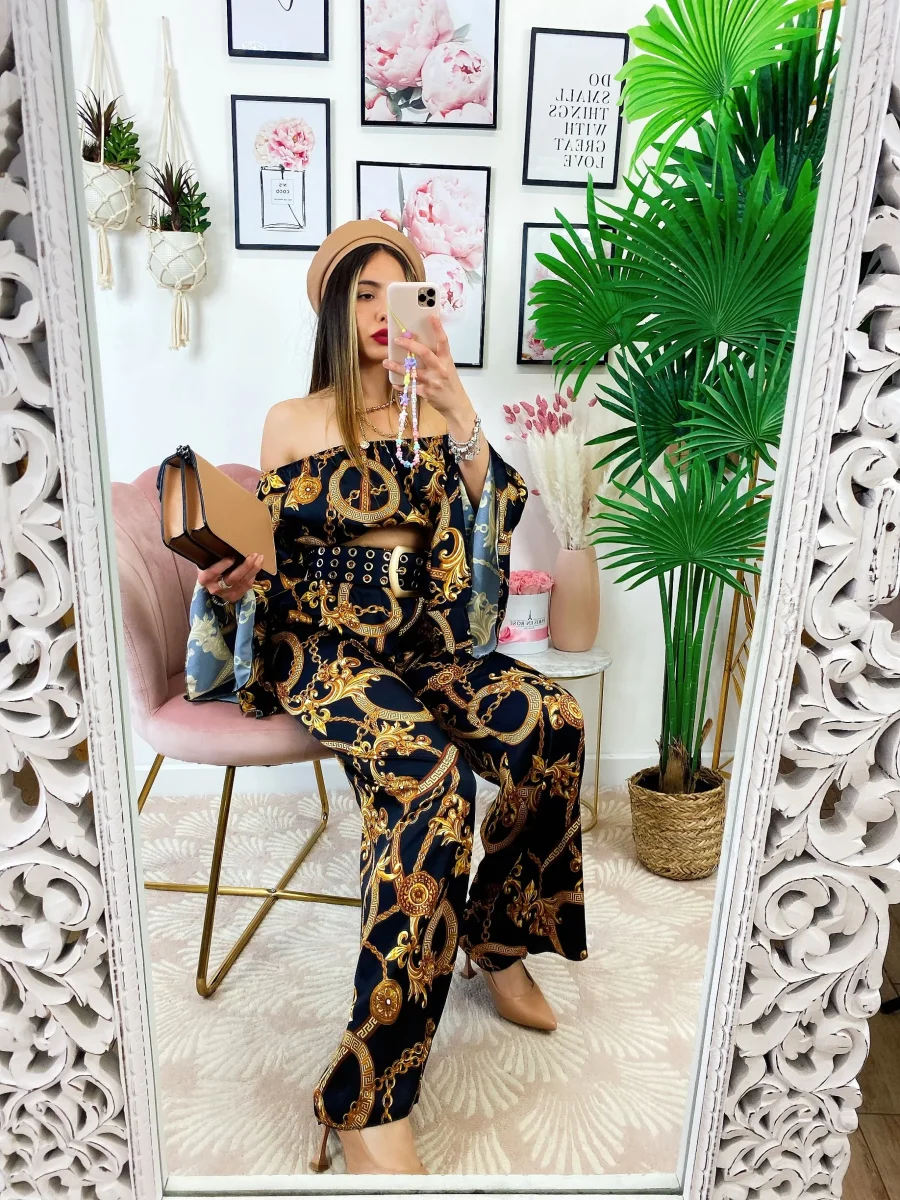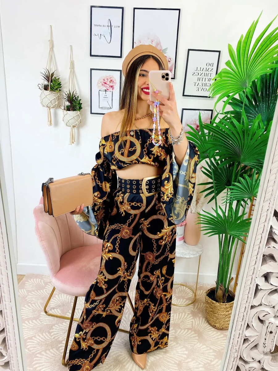 Completo stampa etnica Composto da pantalone a zampa con elastico in vita e top scollo a barchetta manica larga.