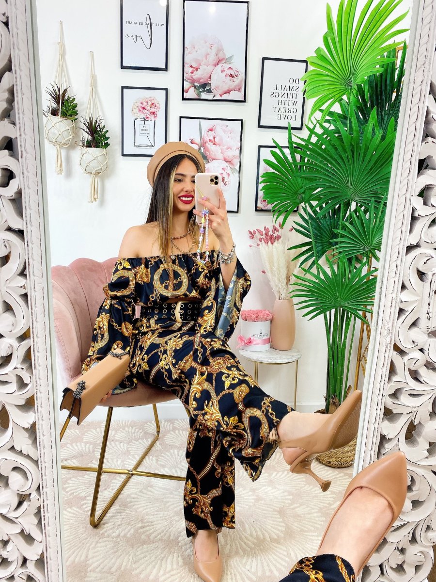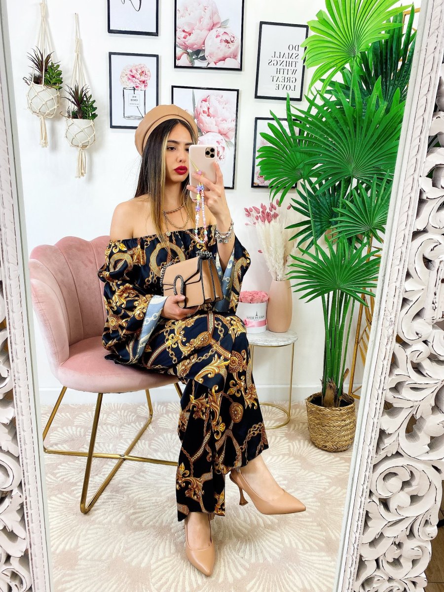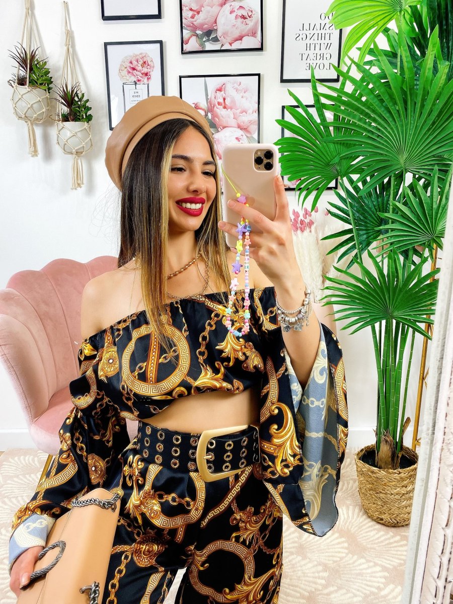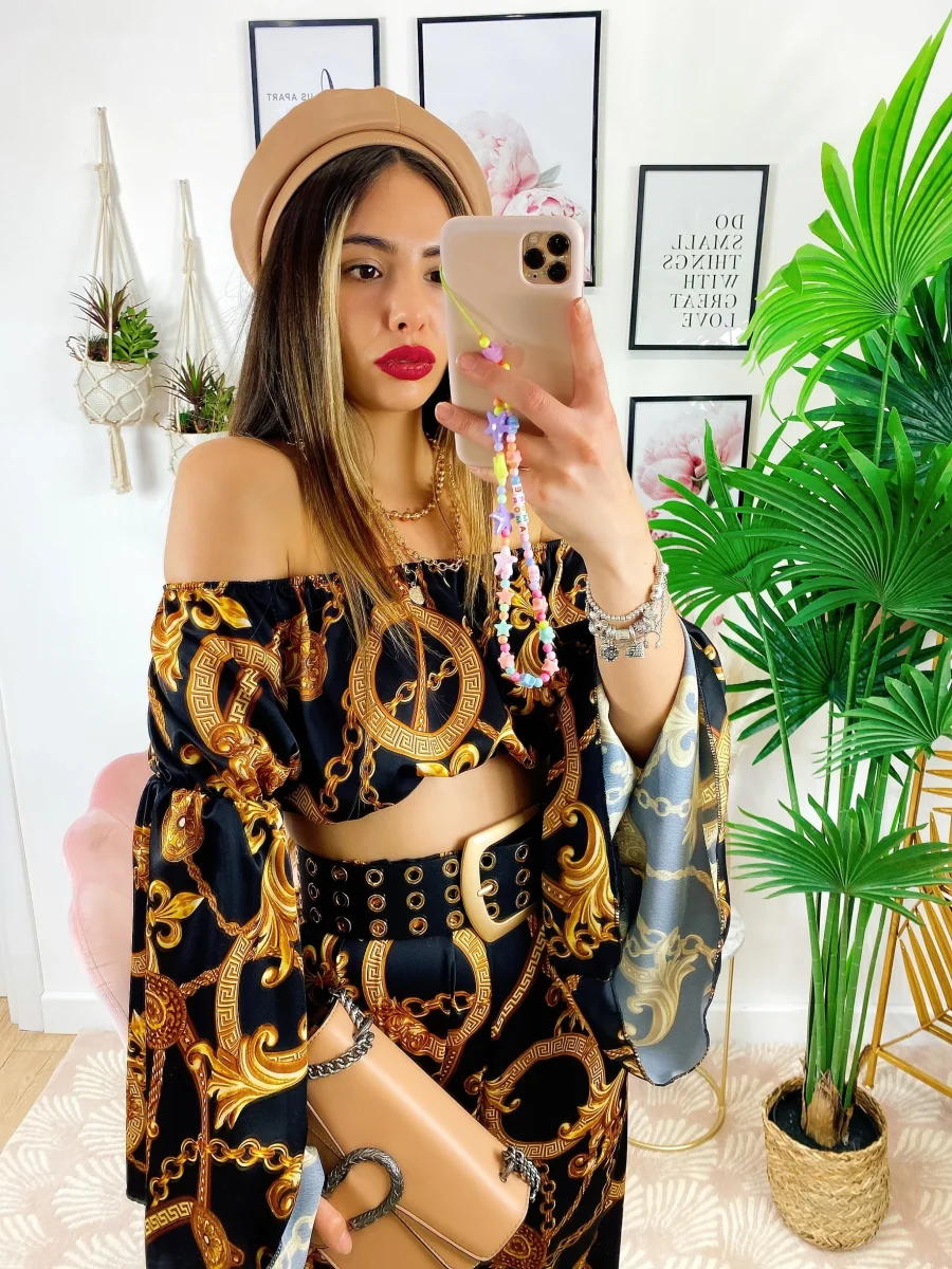 Completo stampa etnica Composto da pantalone a zampa con elastico in vita e top scollo a barchetta manica larga.