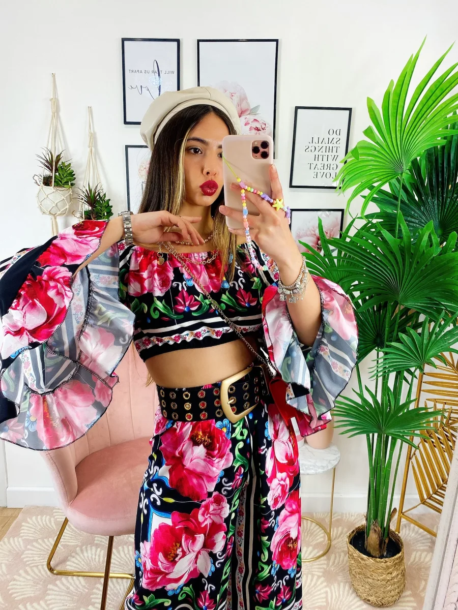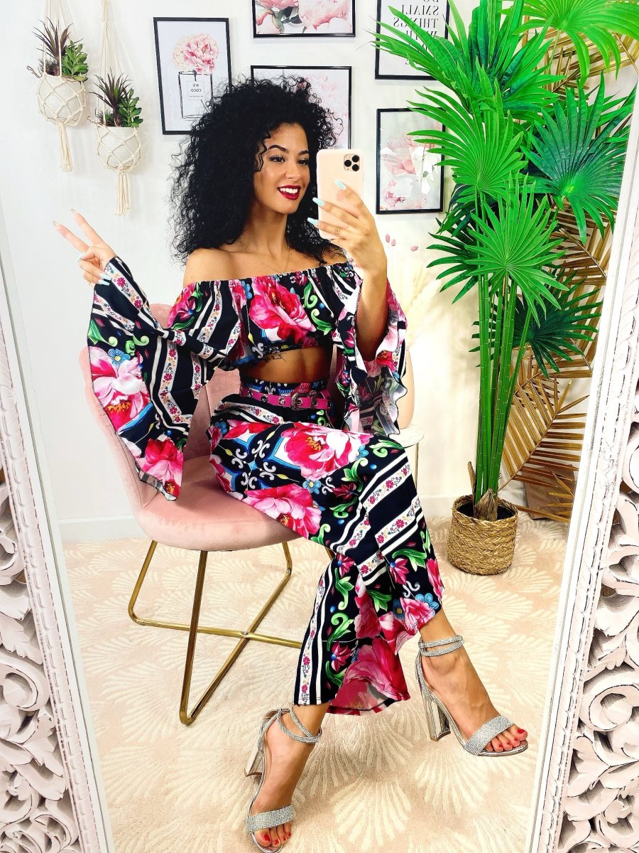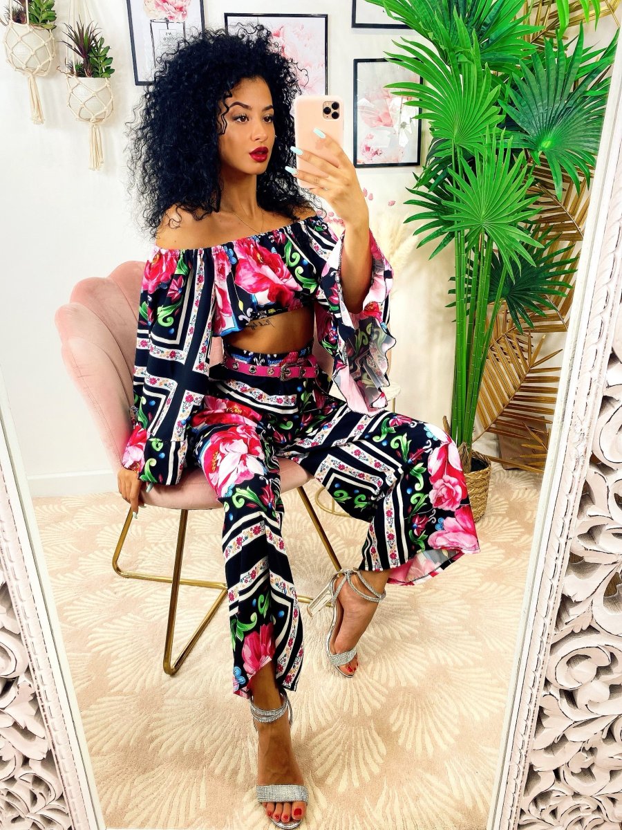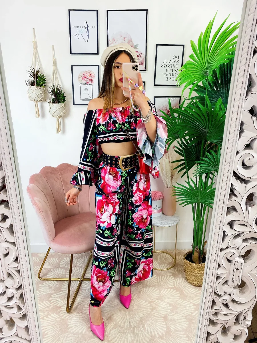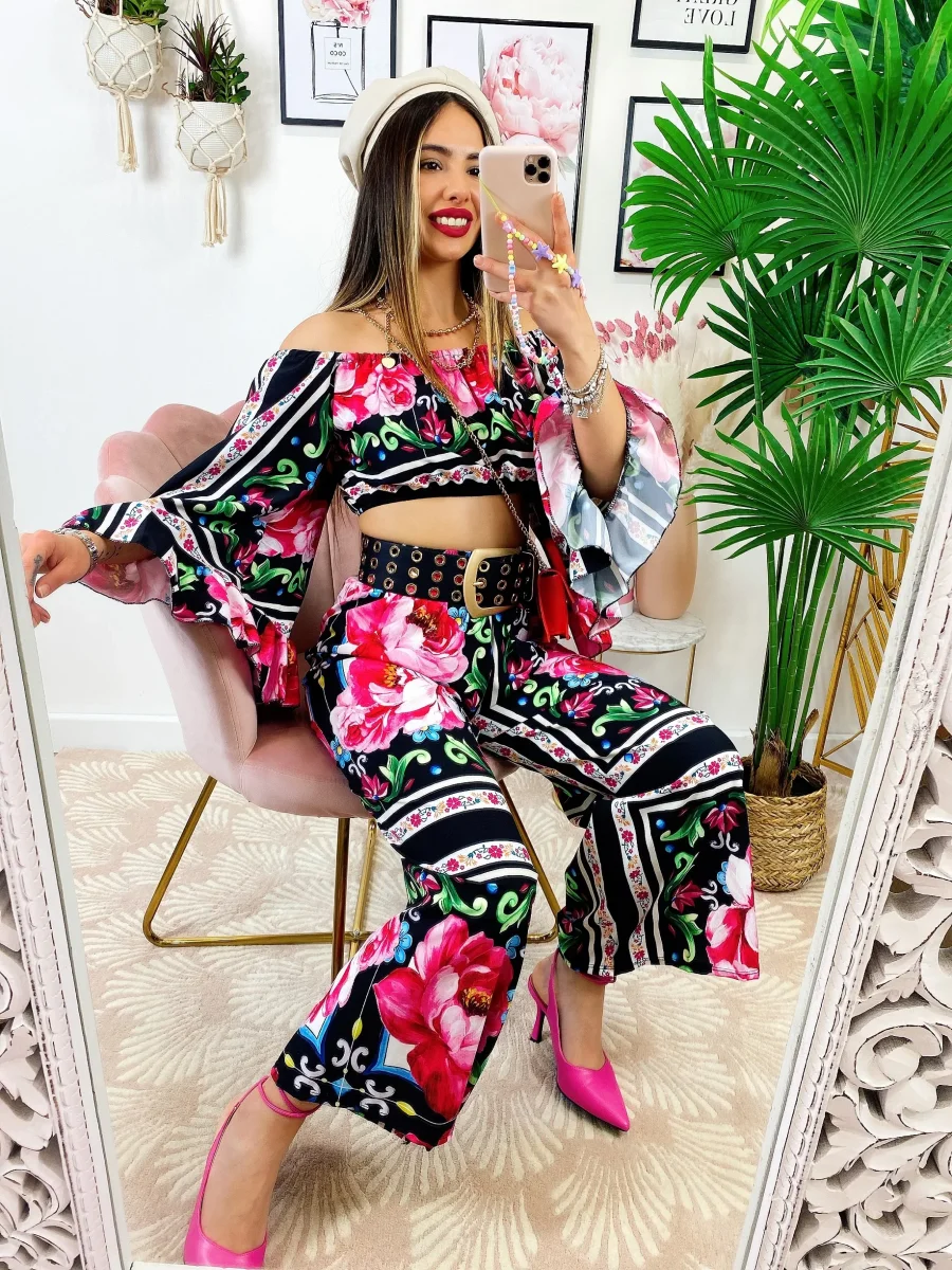 Completo stampa etnica Composto da pantalone a zampa con elastico in vita e top scollo a barchetta manica larga.