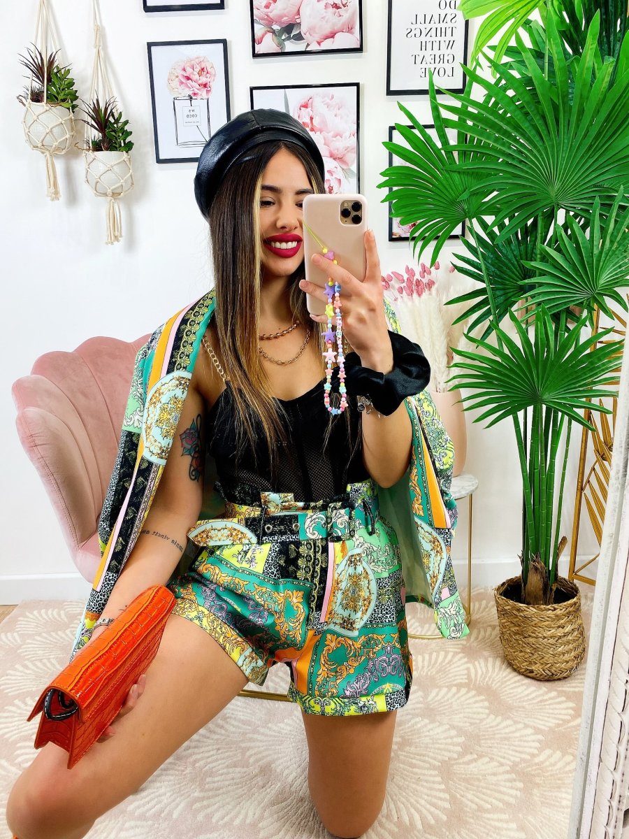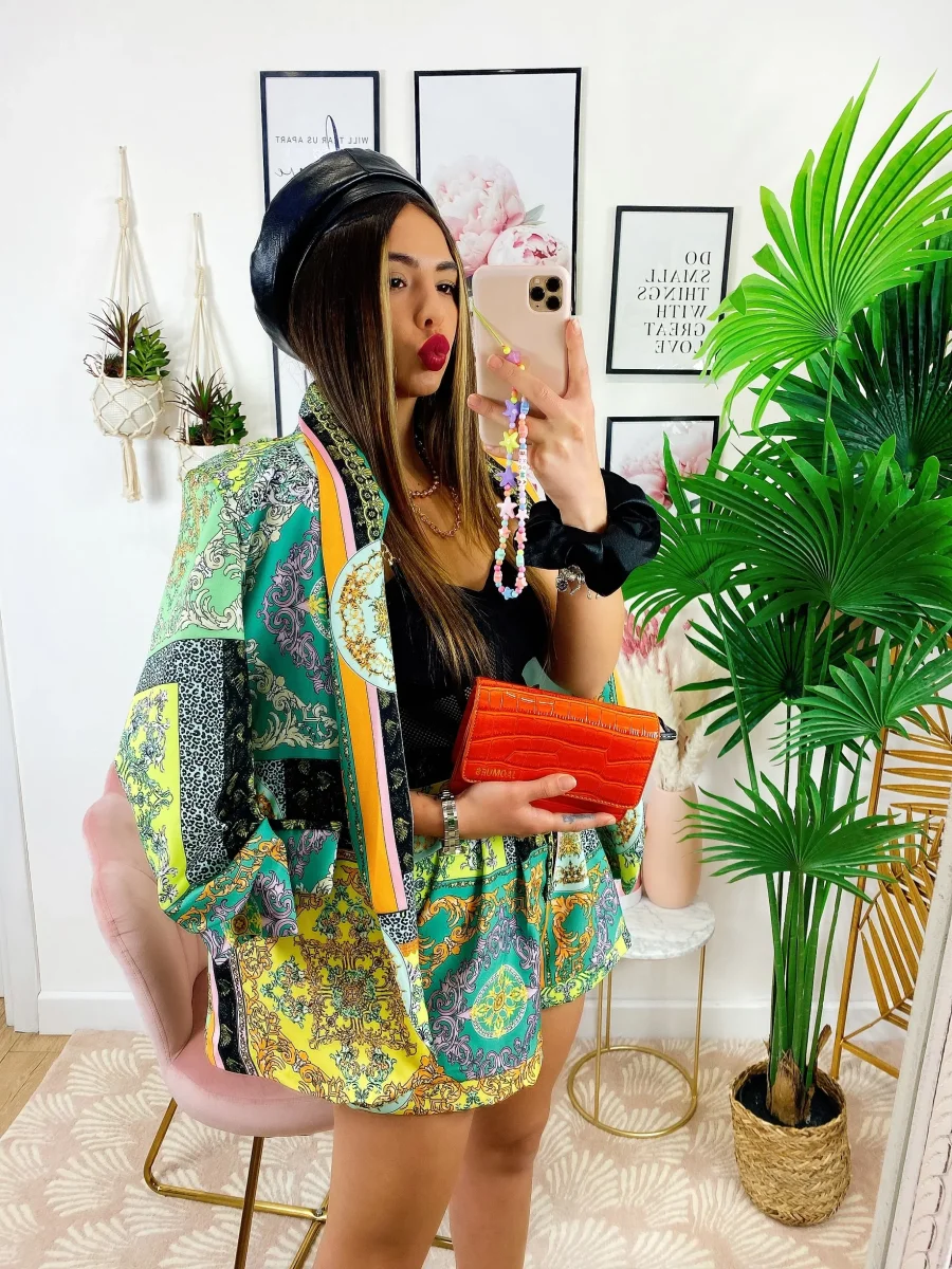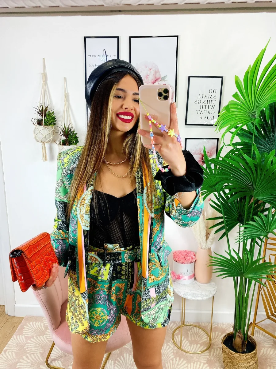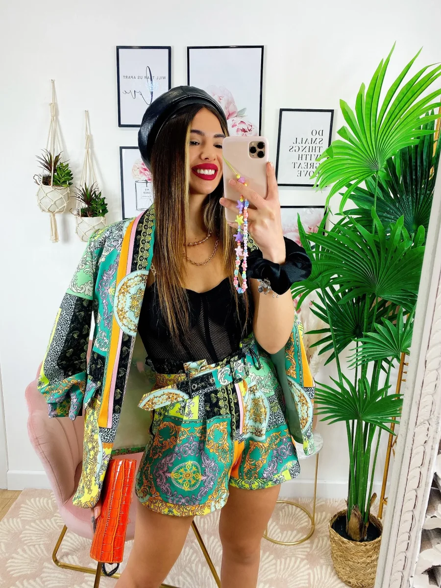Completo stampa etnica composto da short con cintura regolabile con passanti e giacca