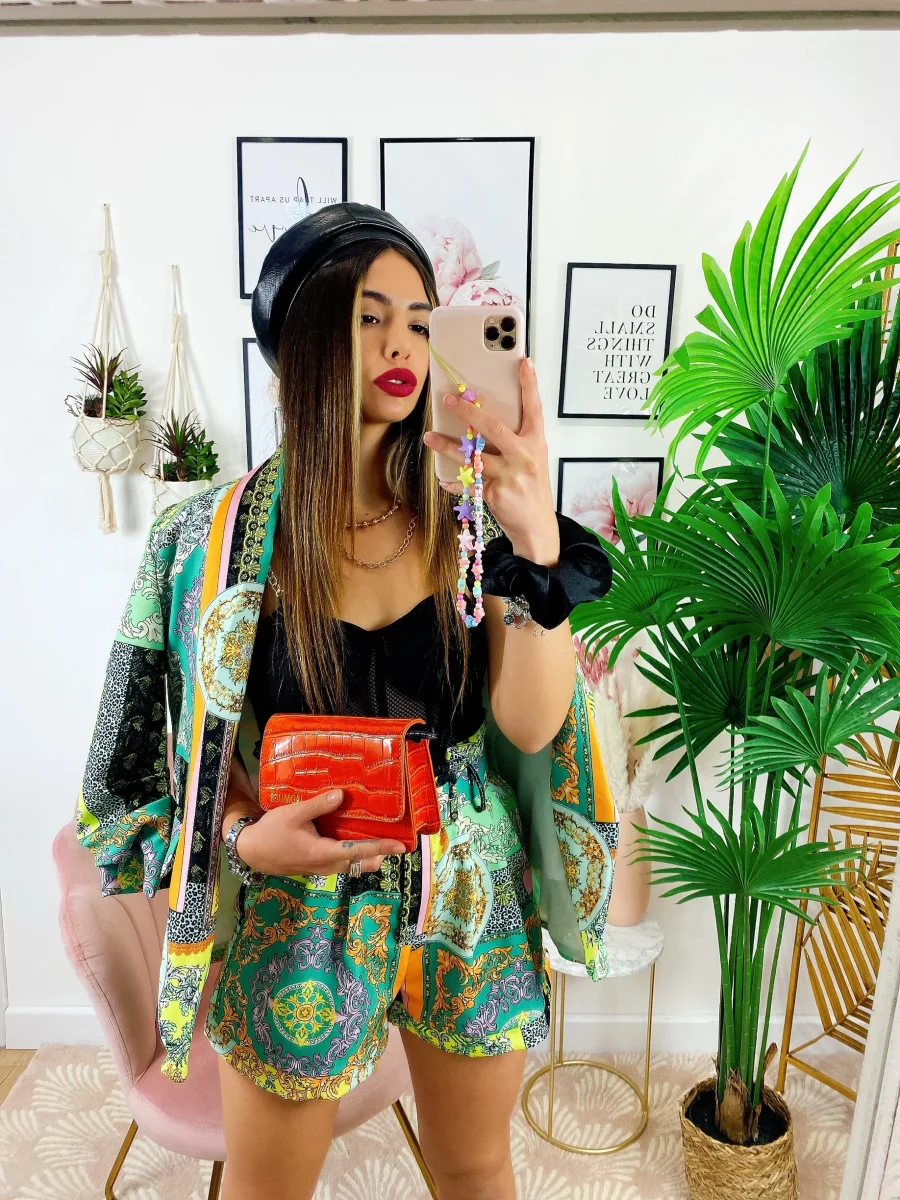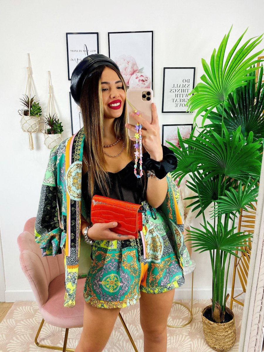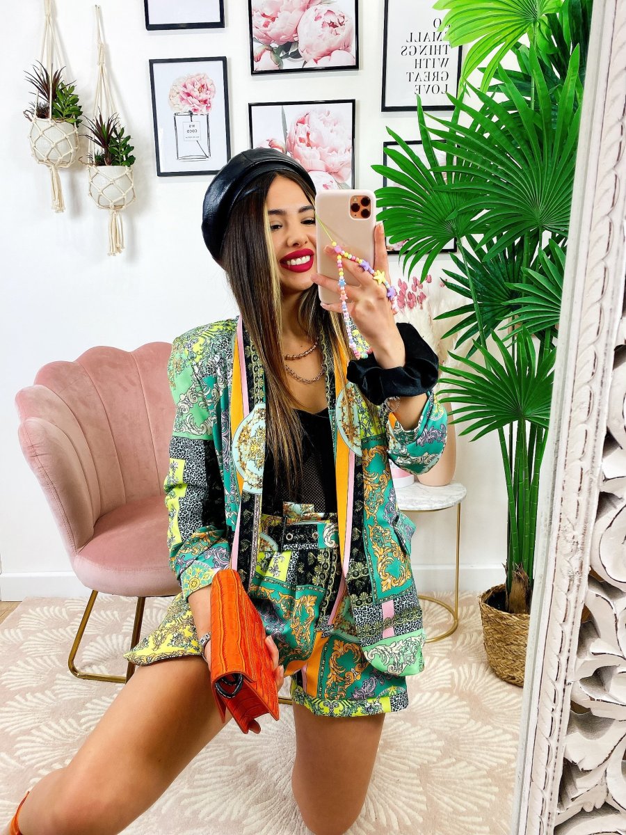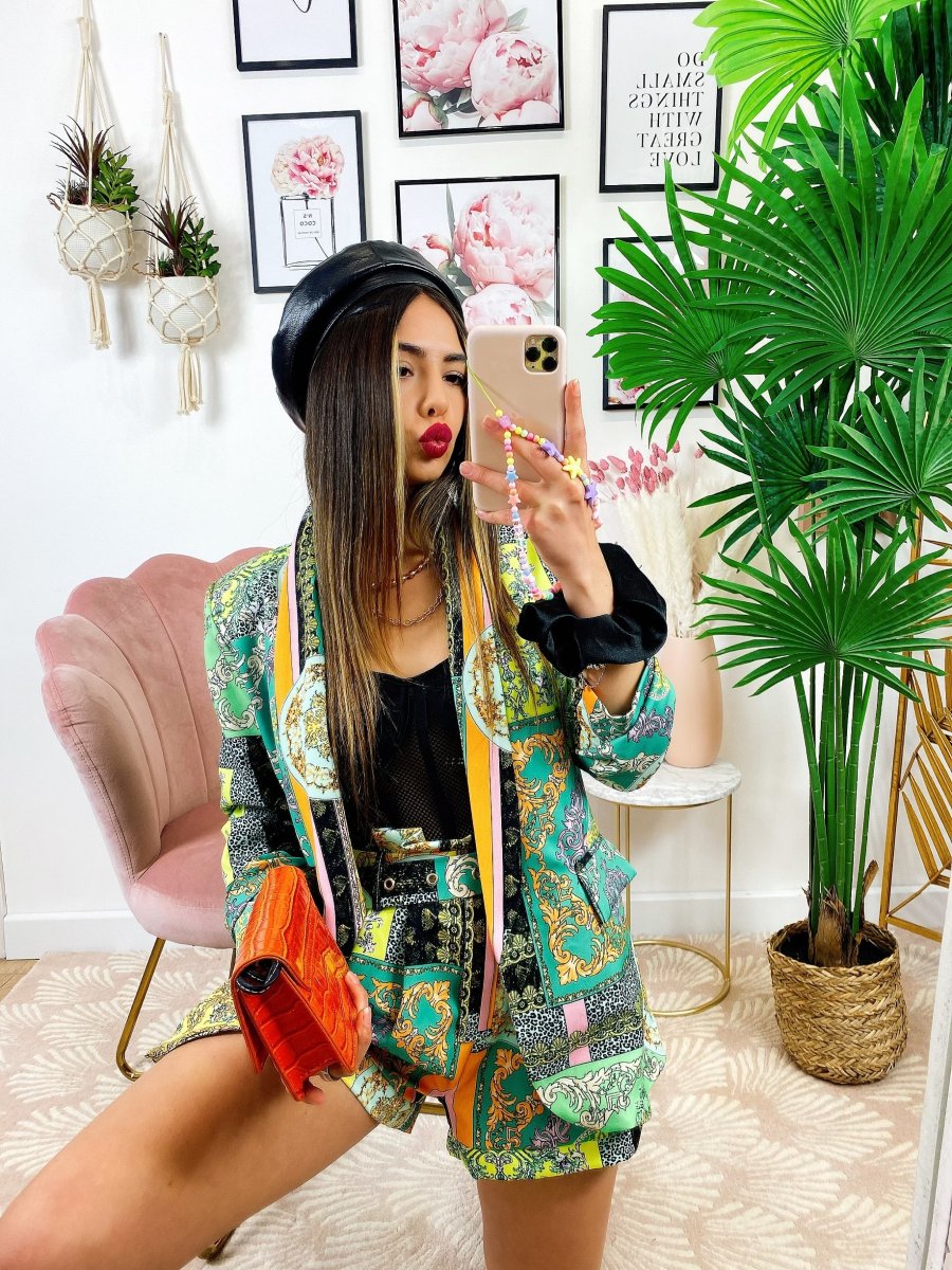 Completo stampa etnica composto da short con cintura regolabile con passanti e giacca