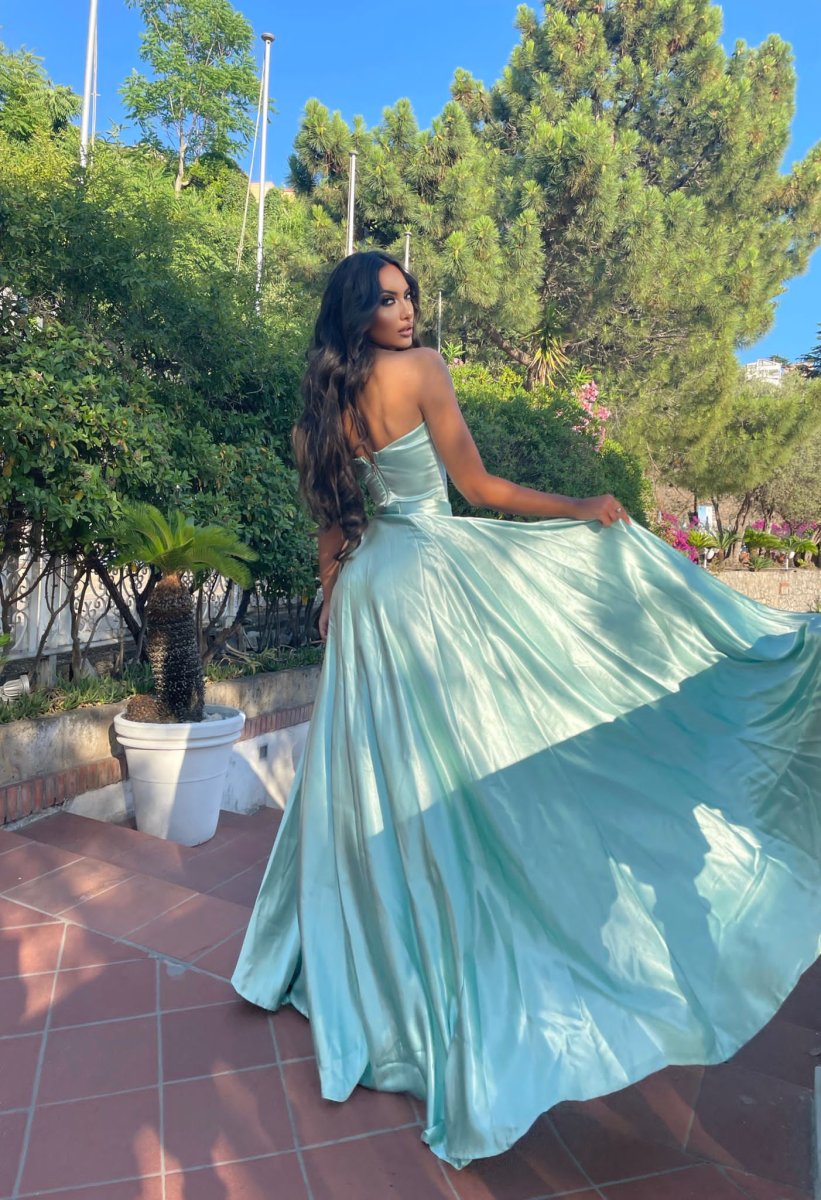 Completo due pezzi composto da top a fascia con coppe e chiusura con zip e maxi gonna ampissima con spacco e chiusura con zip
