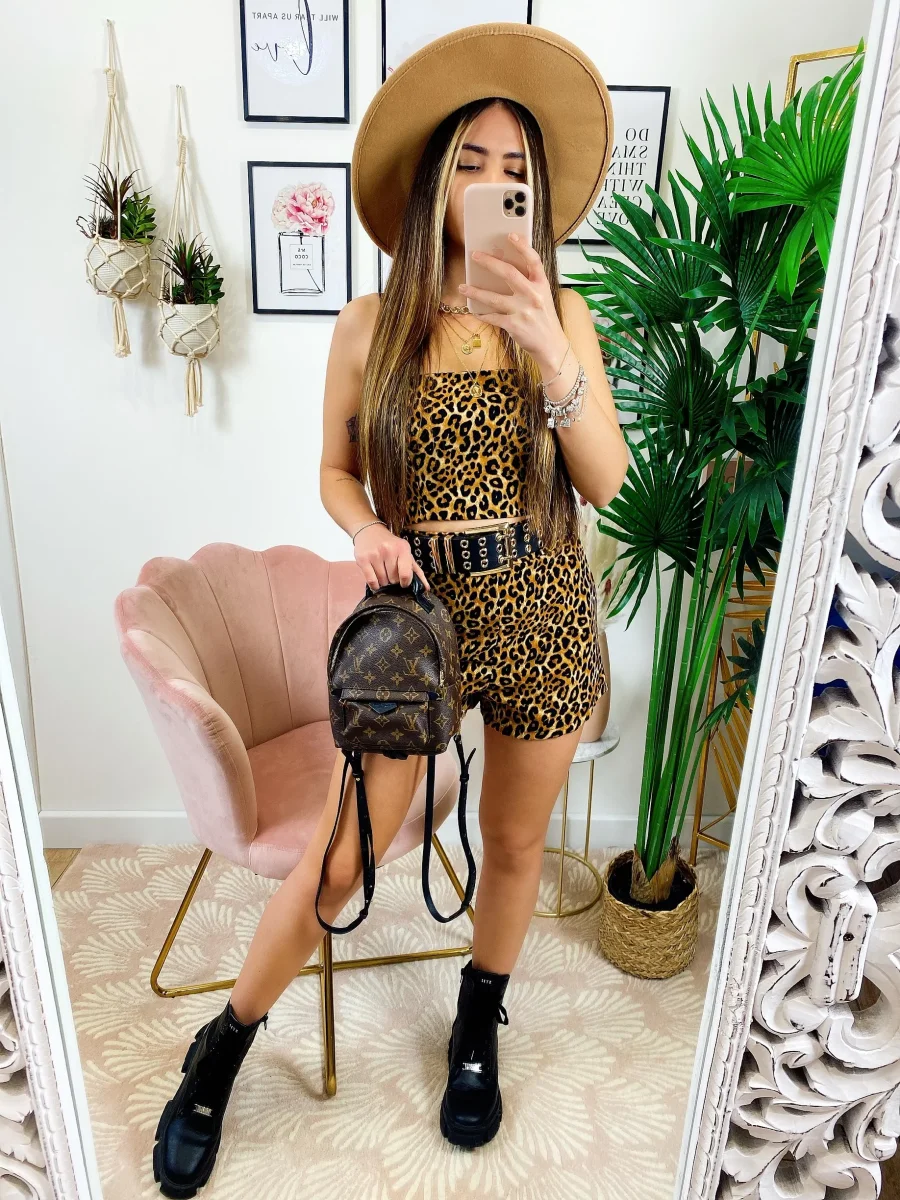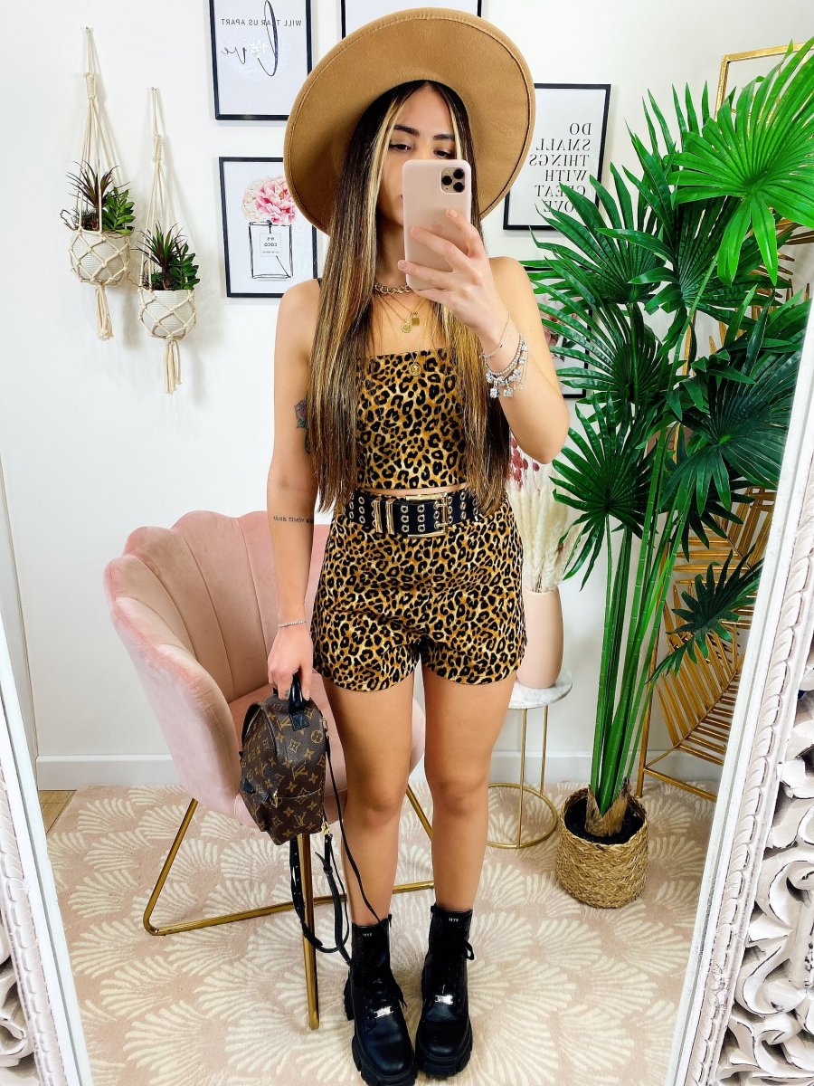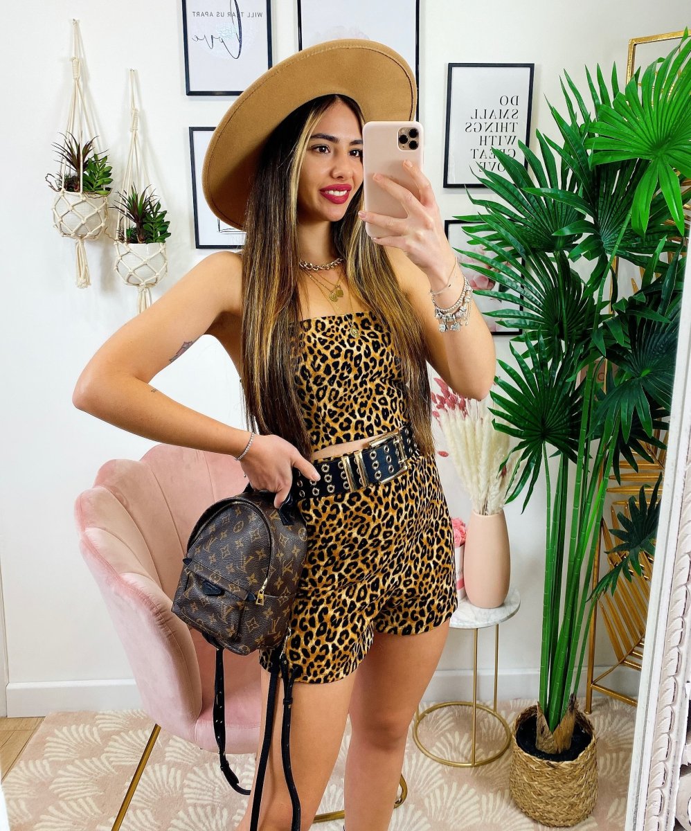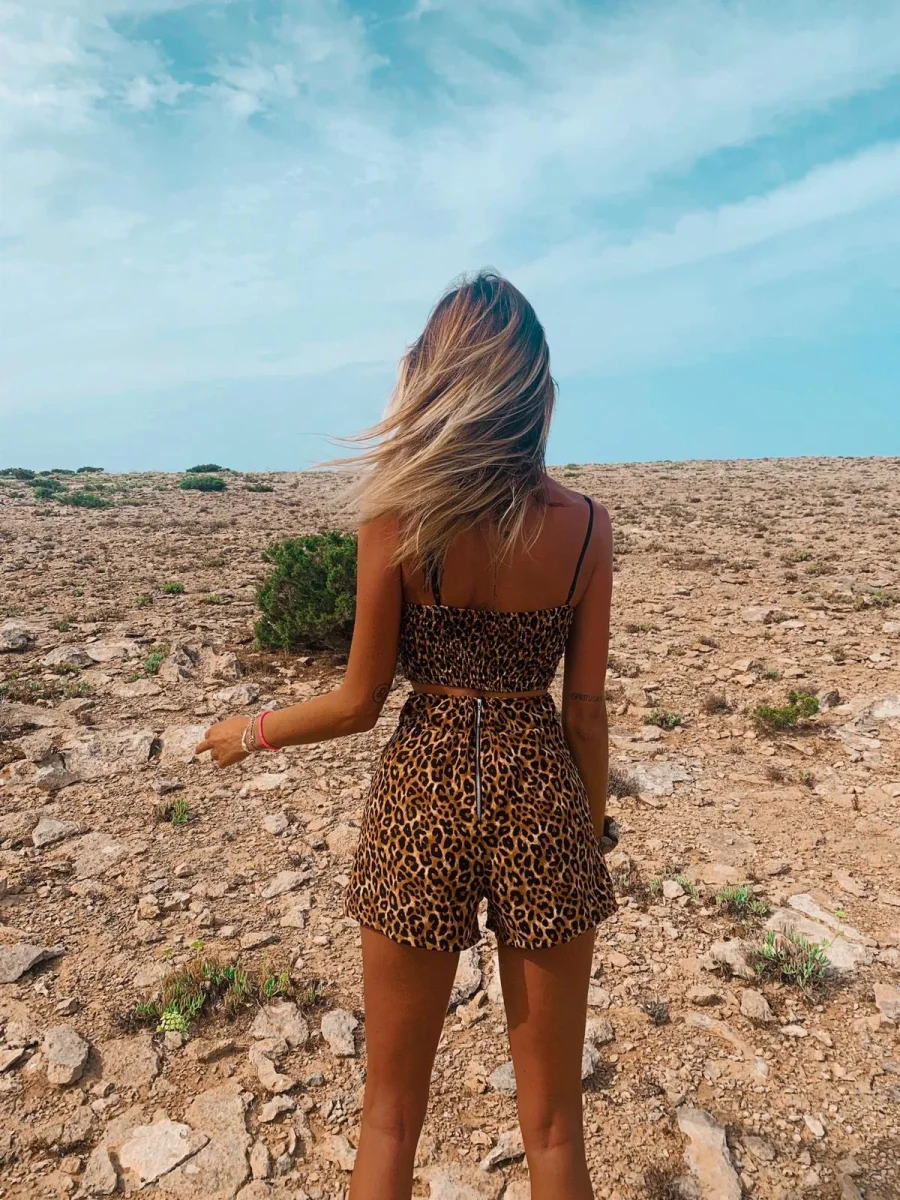 Completo composto da top con bretelline regolabili e chiusura con zip e pantaloncino elasticizzato leggermente con chiusura a zip.