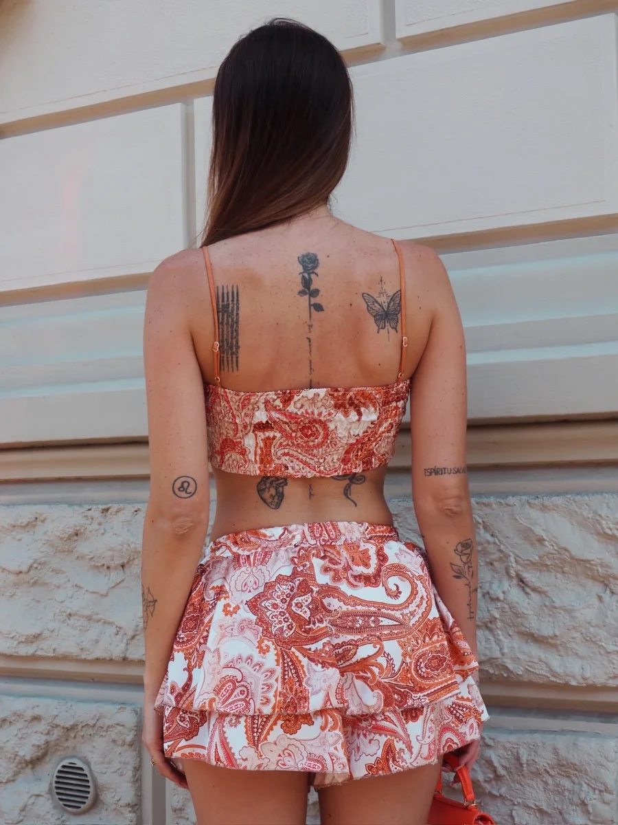 Completo in raso composto da top con coppe e bredelline regolabili e short a fantasia