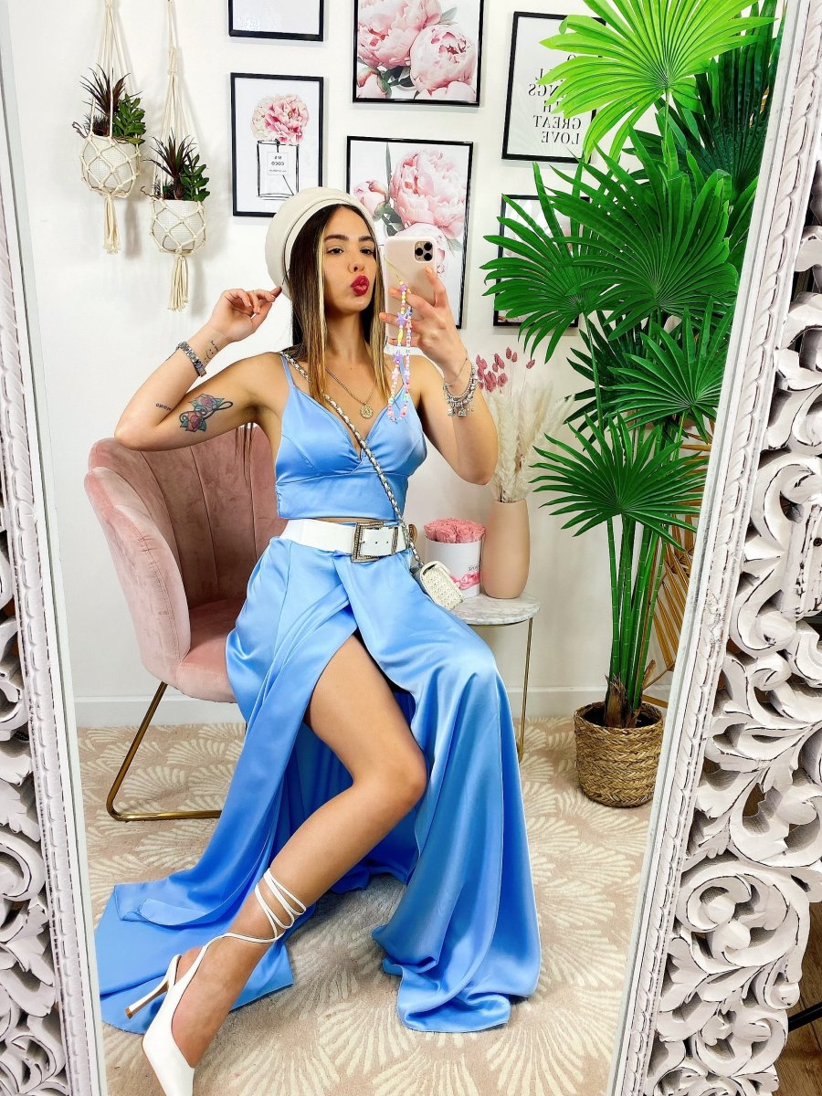 Completo venere in raso con top elasticizzato e gonna con ampio spacco. Ottima qualità