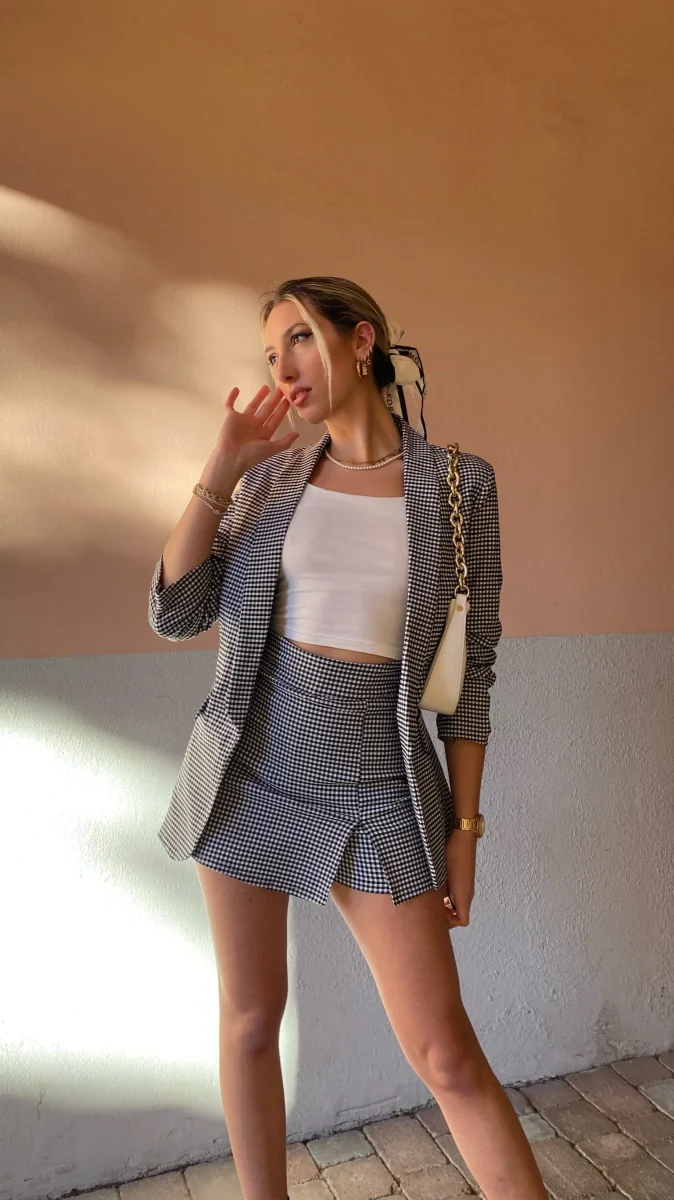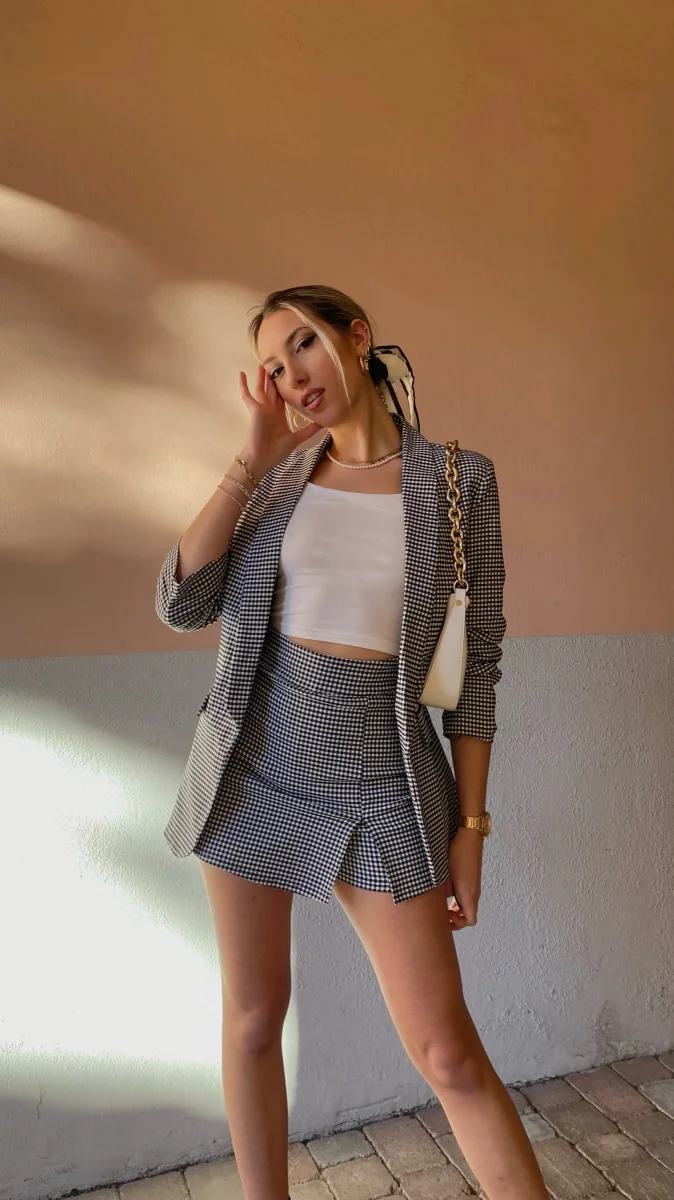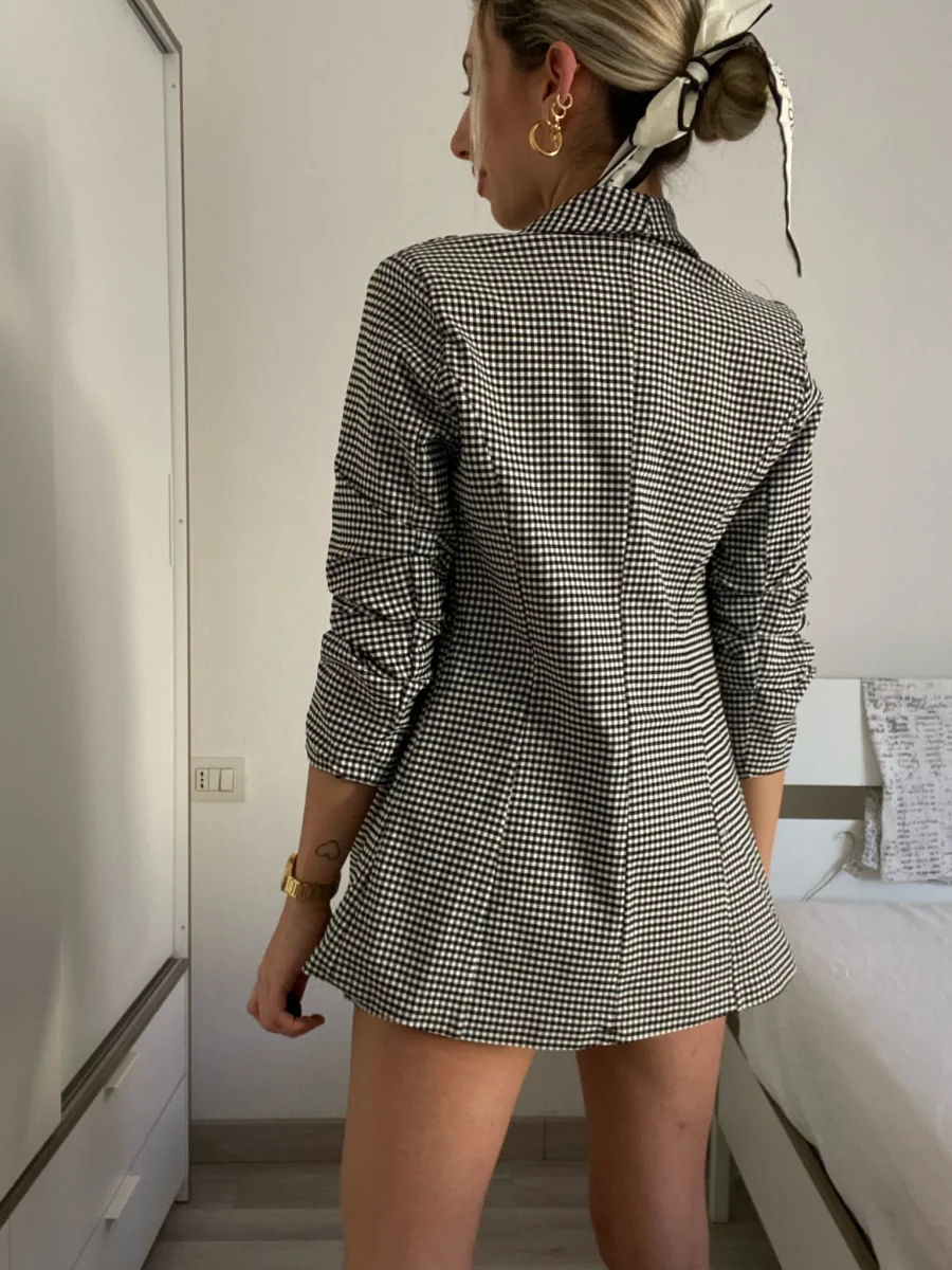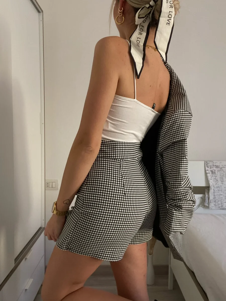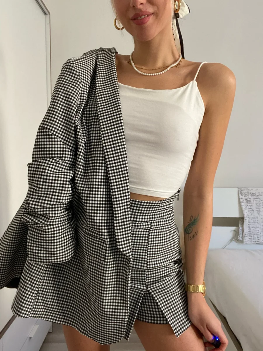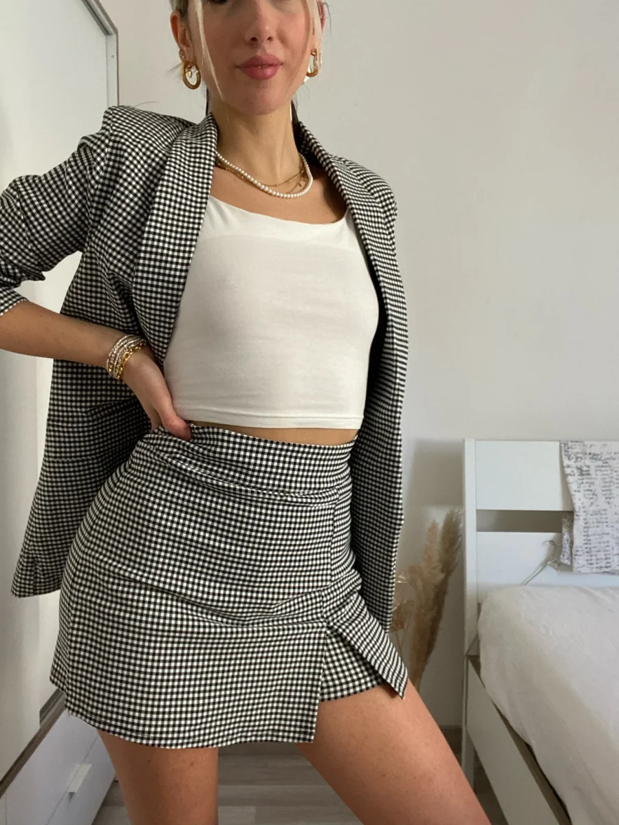 Completo Vichy composto da giacca foderata e maniche arricciate e gonna pantalone nella stessa trama