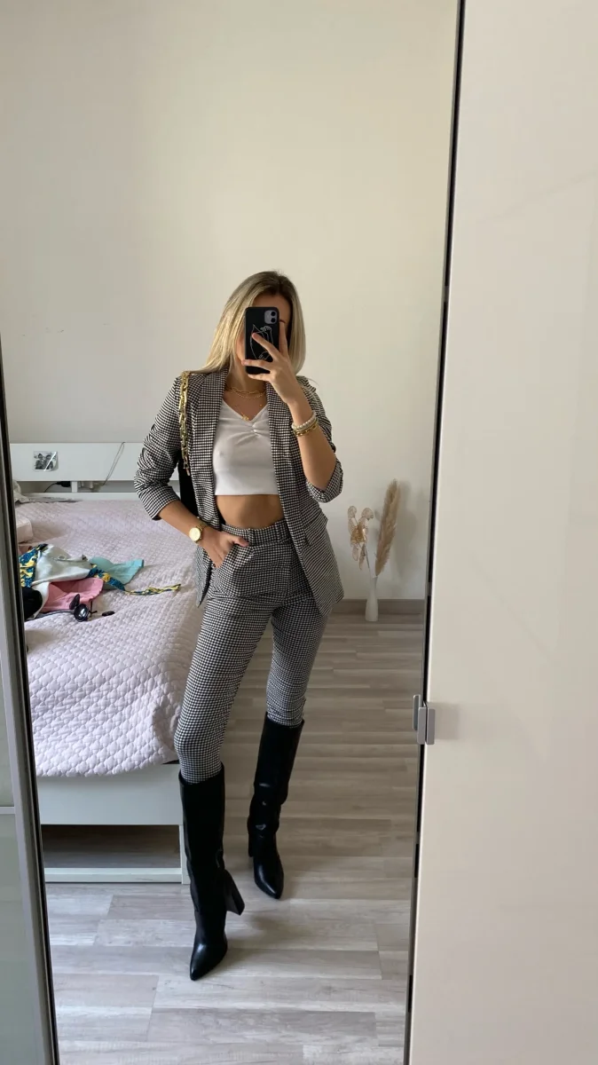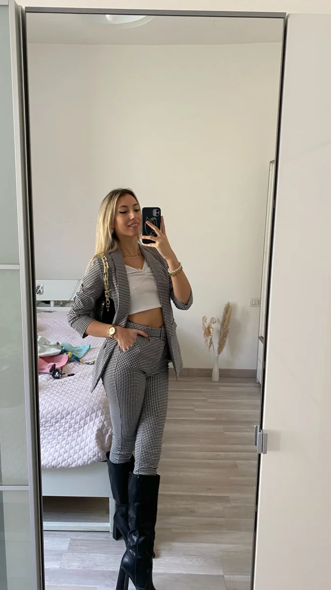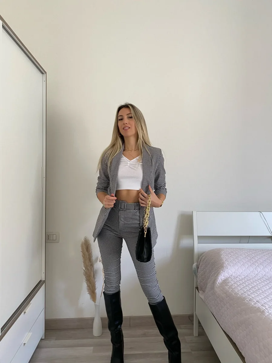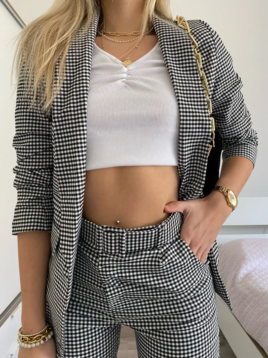 Completo Vichy composto da giacca foderata e maniche arricciate e pantalone aderente con cintura nella stessa trama