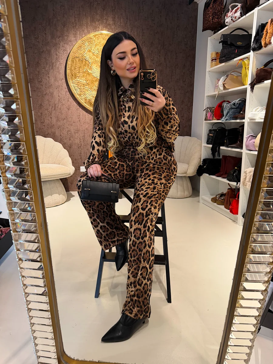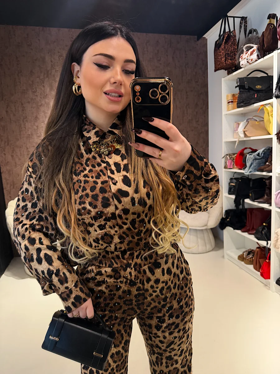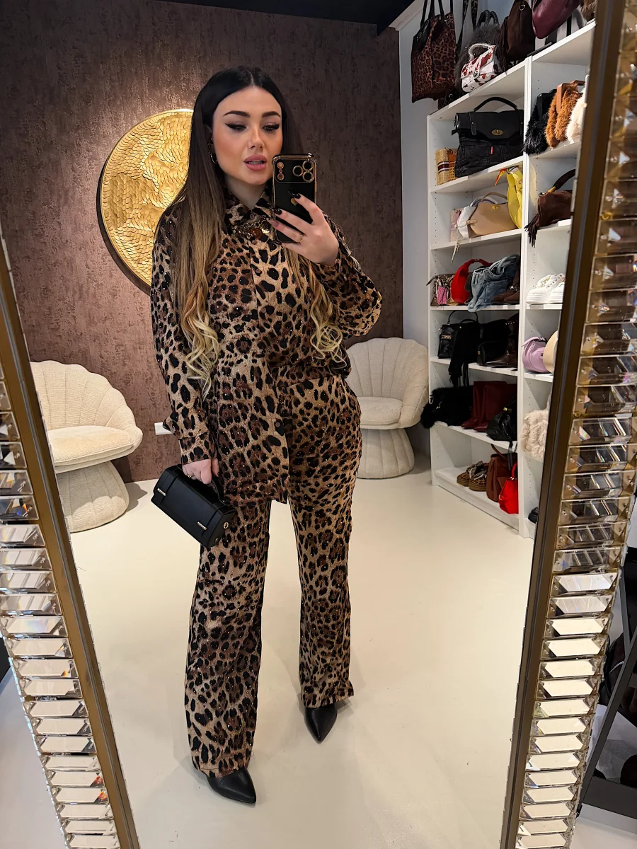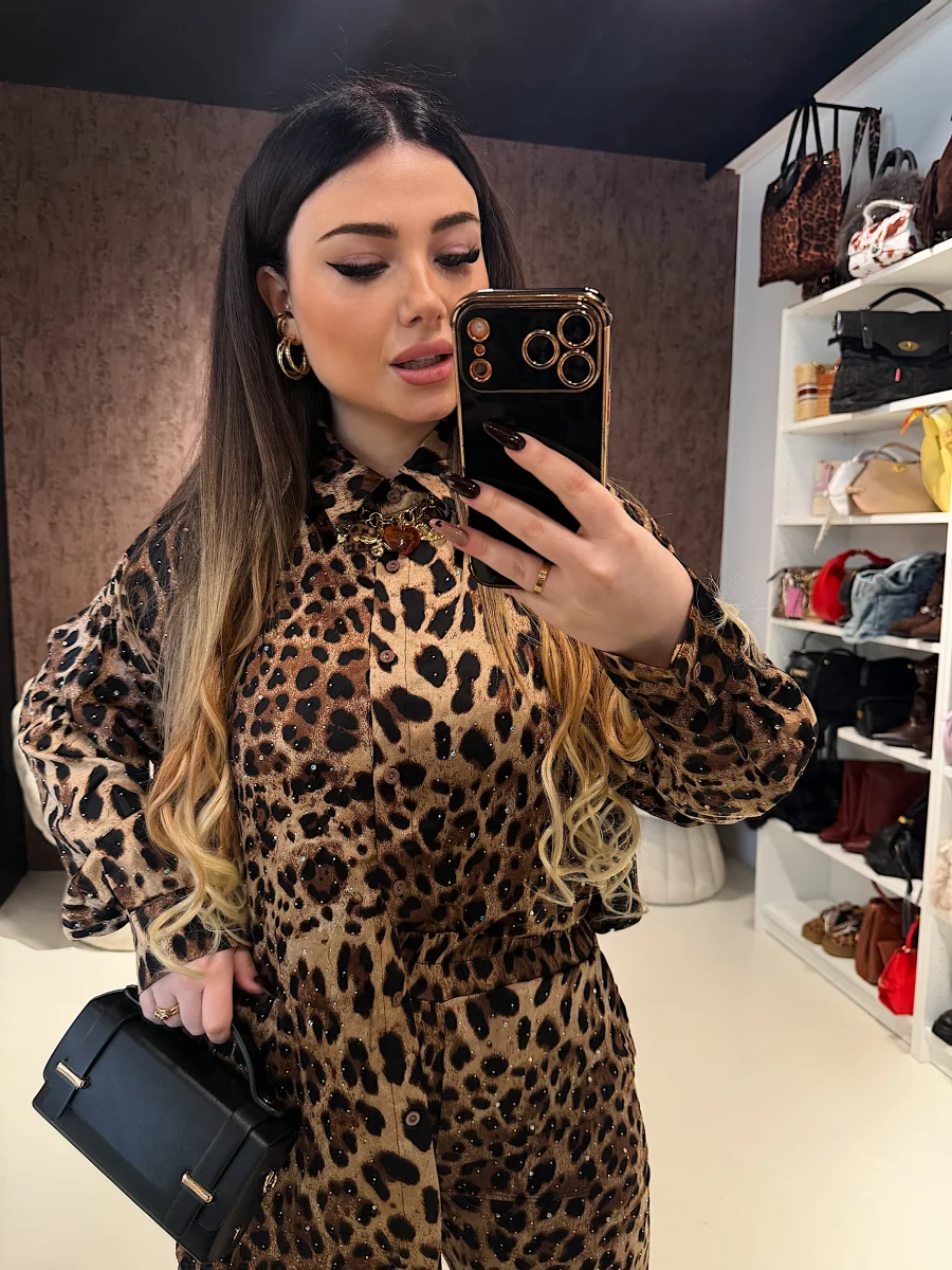 Composto da camicia morbida a manica lunga e pantalone coordinato a vita alta, questo completo unisce stampa animalier iconica e dettagli luminosi che donano un effetto super glam ✨