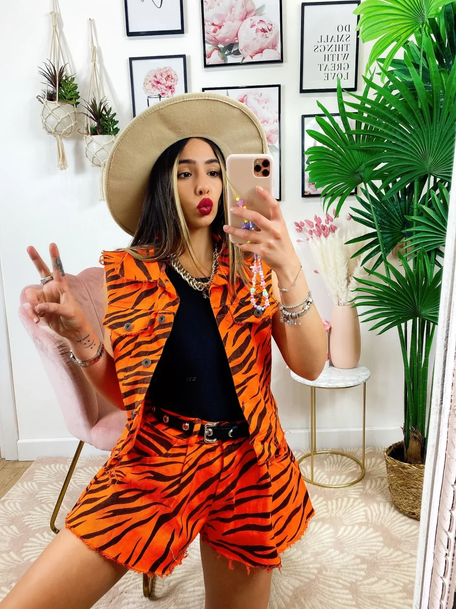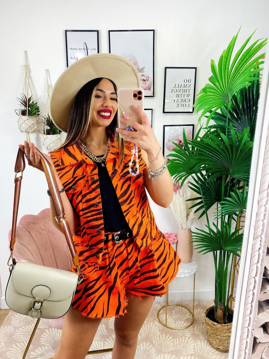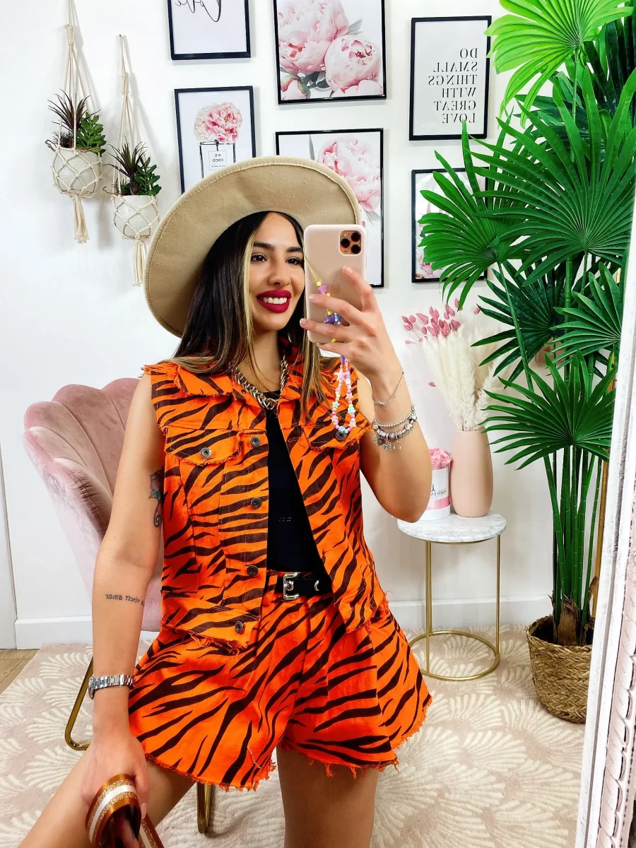 Completo zebrato arancio Composto da Short elasticizzato e smanicato in tessuto simil jeans.