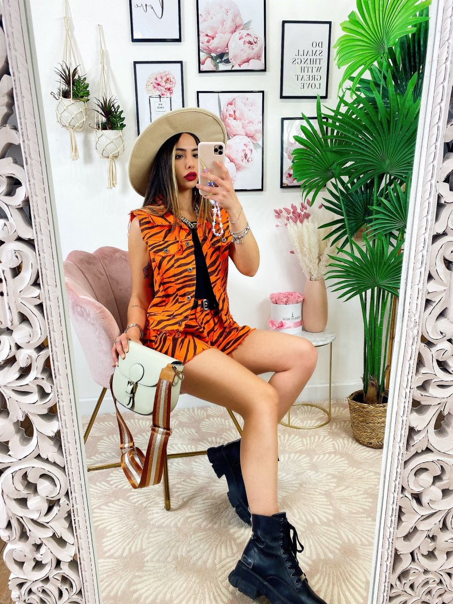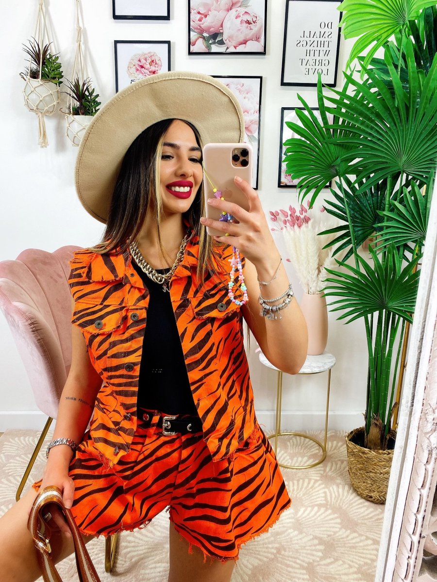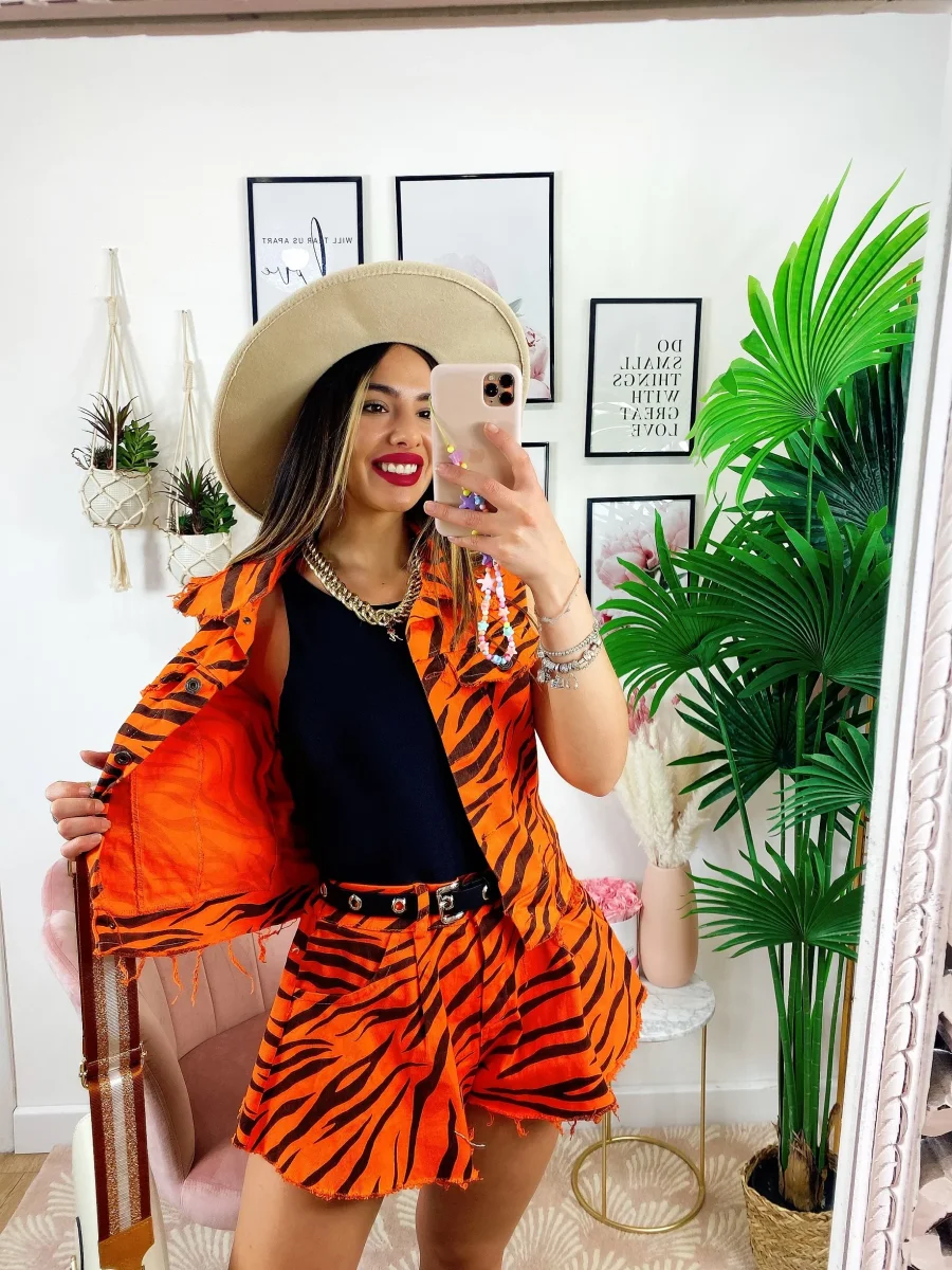 Completo zebrato arancio Composto da Short elasticizzato e smanicato in tessuto simil jeans.