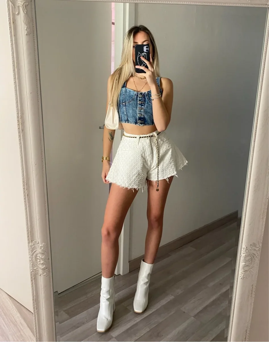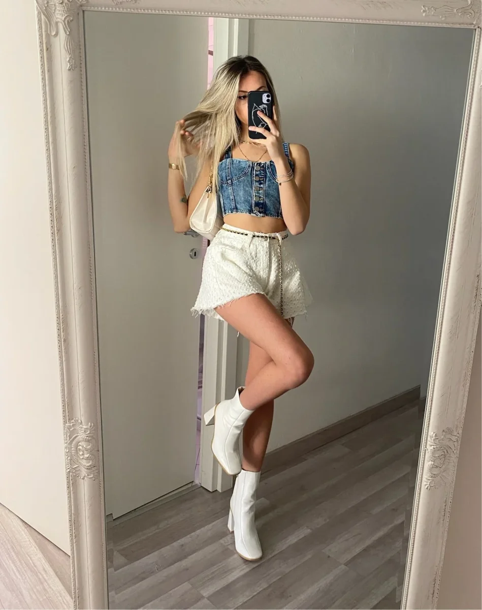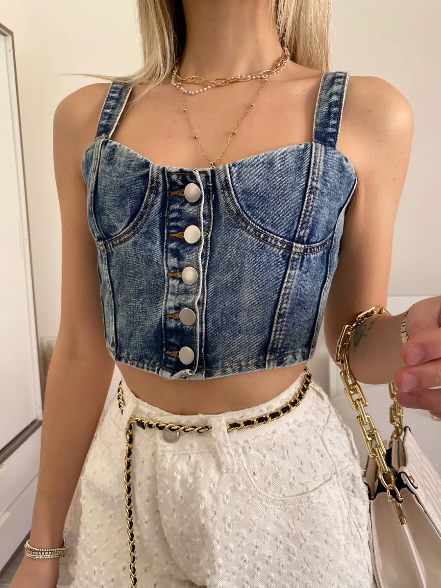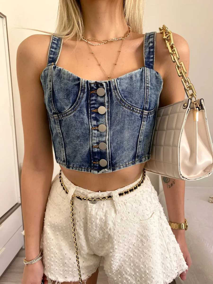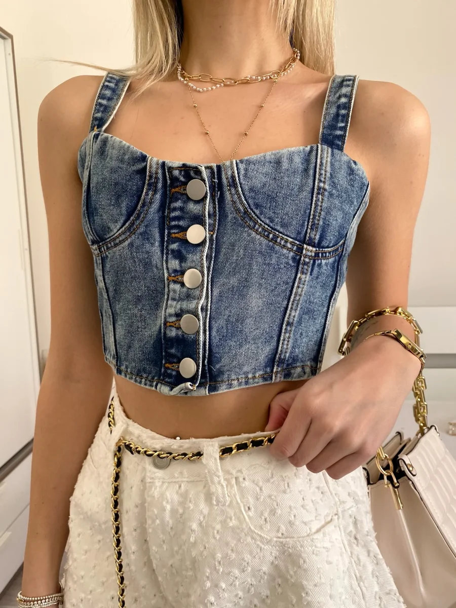 Corpetto in jeans con coppe e elastico nel dietro. Spalline e bottoni oro.
