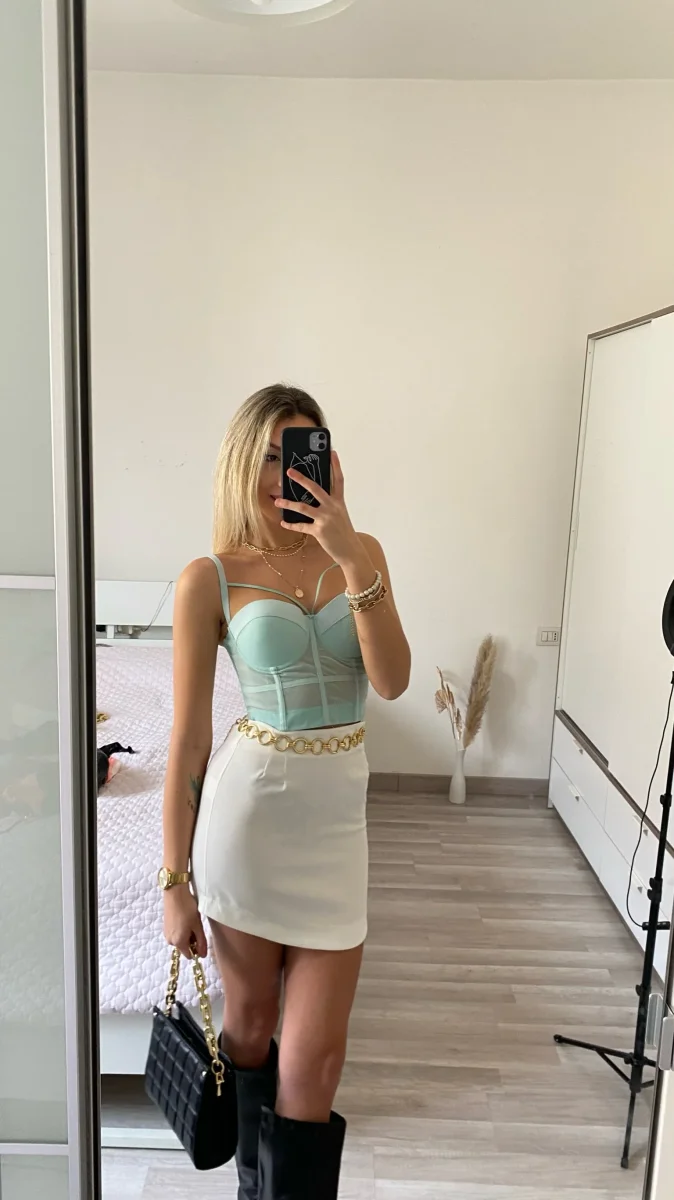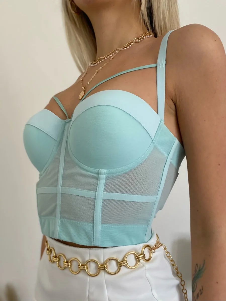 Corpetto tiffany con coppe imbottite chiusura con ganci. Dettaglio con trasparenze
