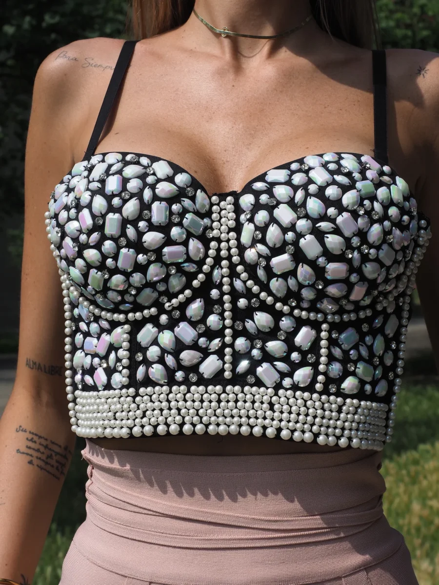 Corpino nero con pietre panna