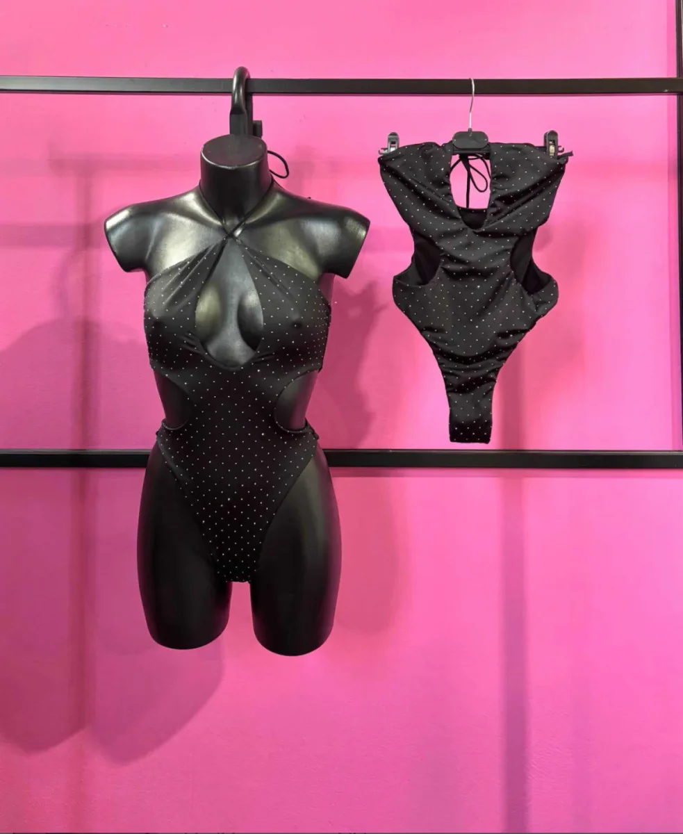 Costume intero con strass regolabile al collo e con aperture sui lati.