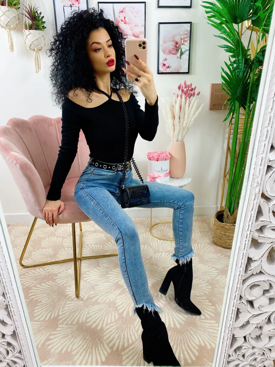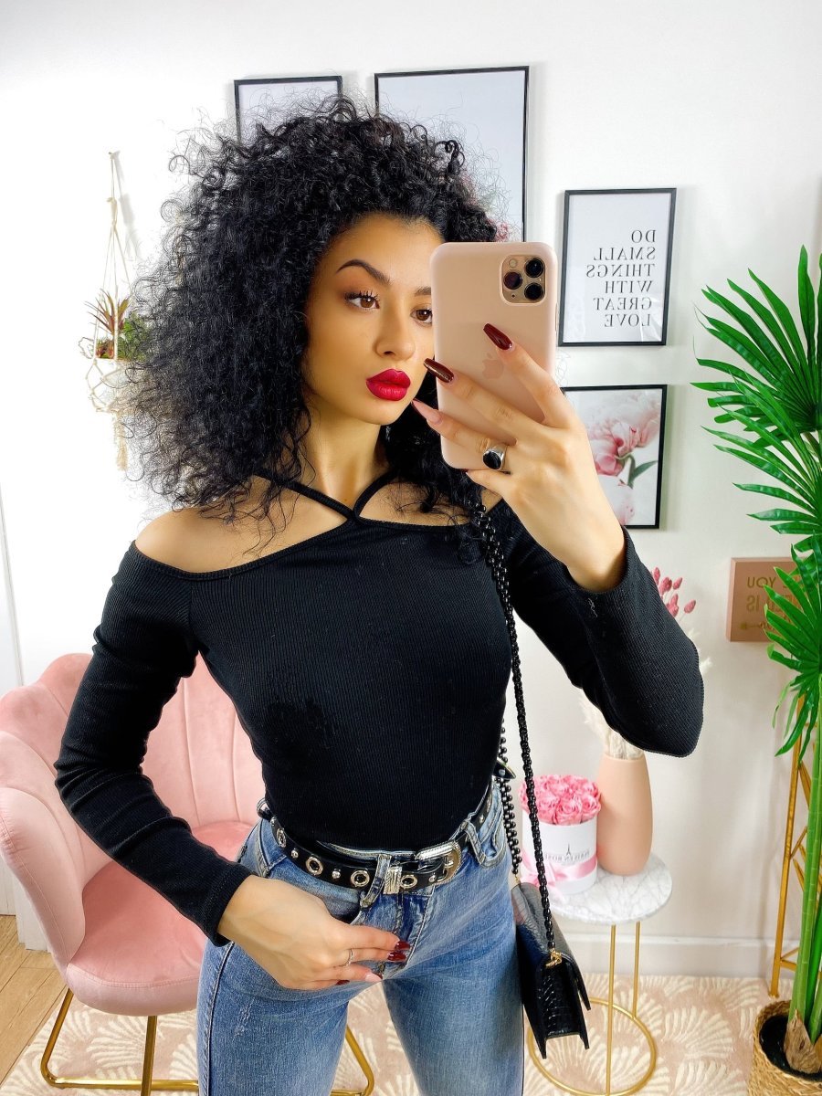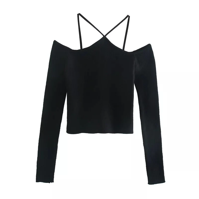 Crop top a costine con incrocio sul collo. Manica lunga.
