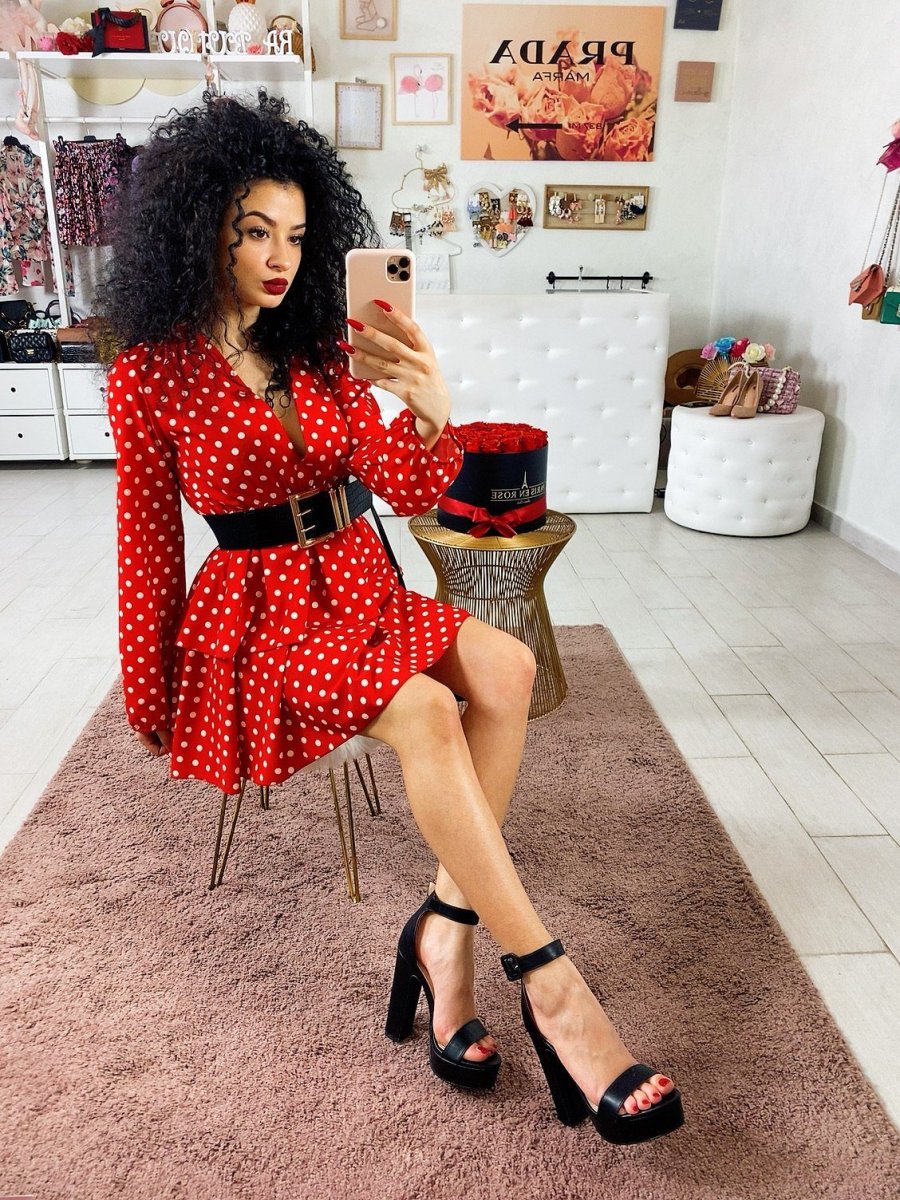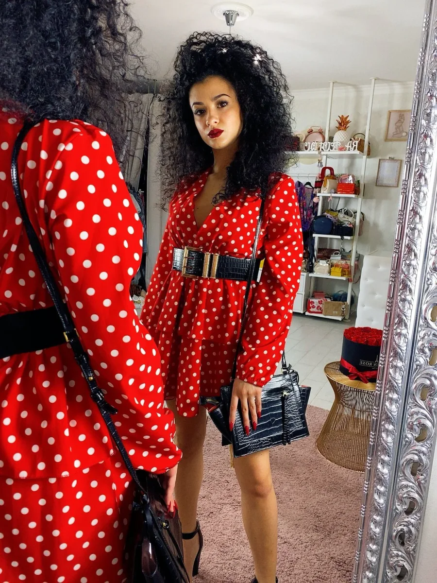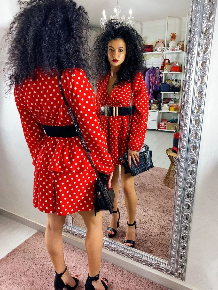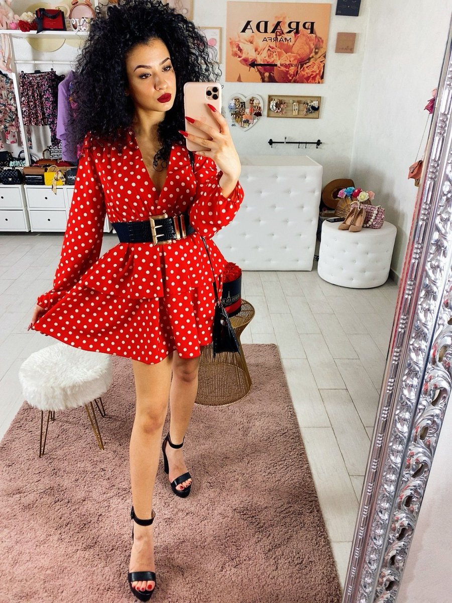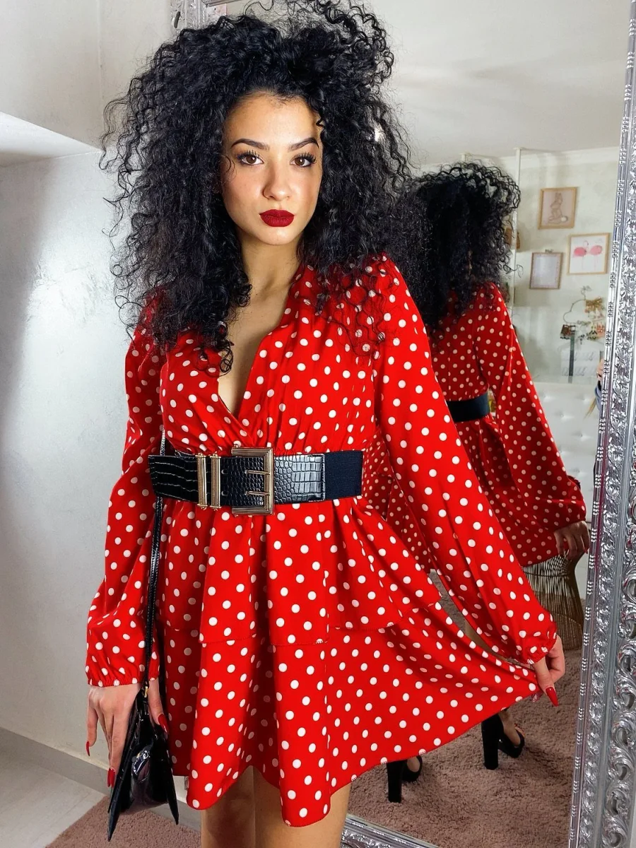 Abito corto con trama a pois, vestibilità corta. Tessuto comodo elasticizzato in vita.