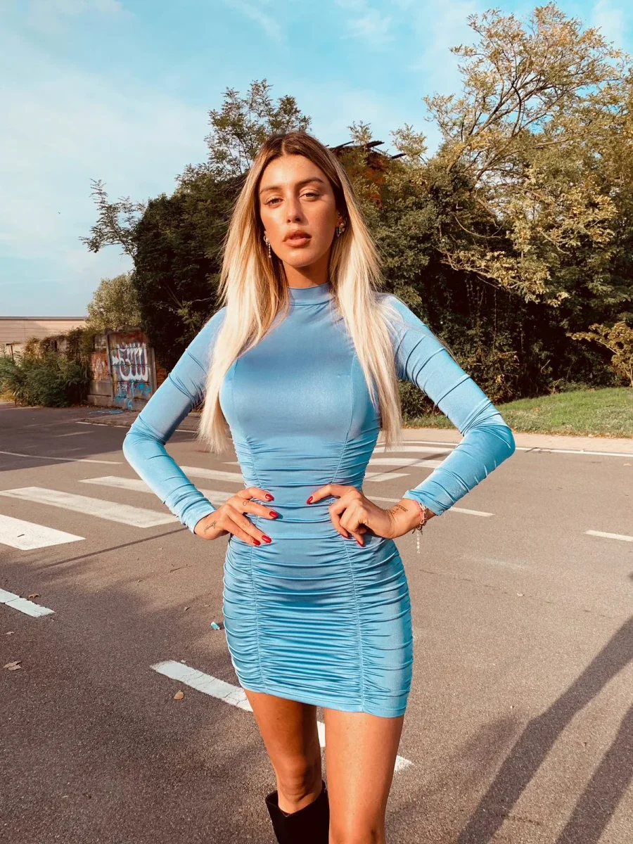 Vuoi un tubino attillato che ti faccio sentire una star? Ecco quello che fà per te, lunghezza circa metà coscia manica lunga e colletto alto rifinito da pieghe in tutta la sua totalità.