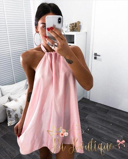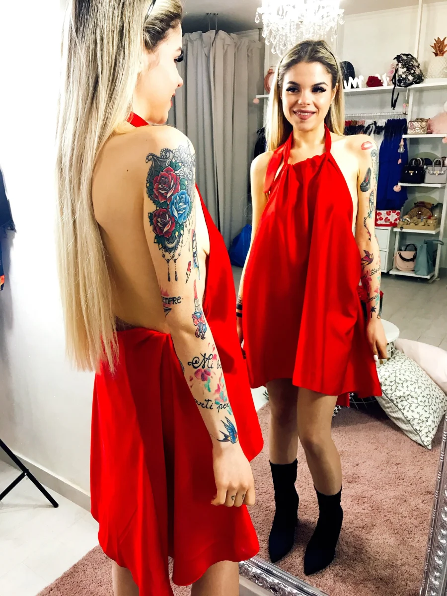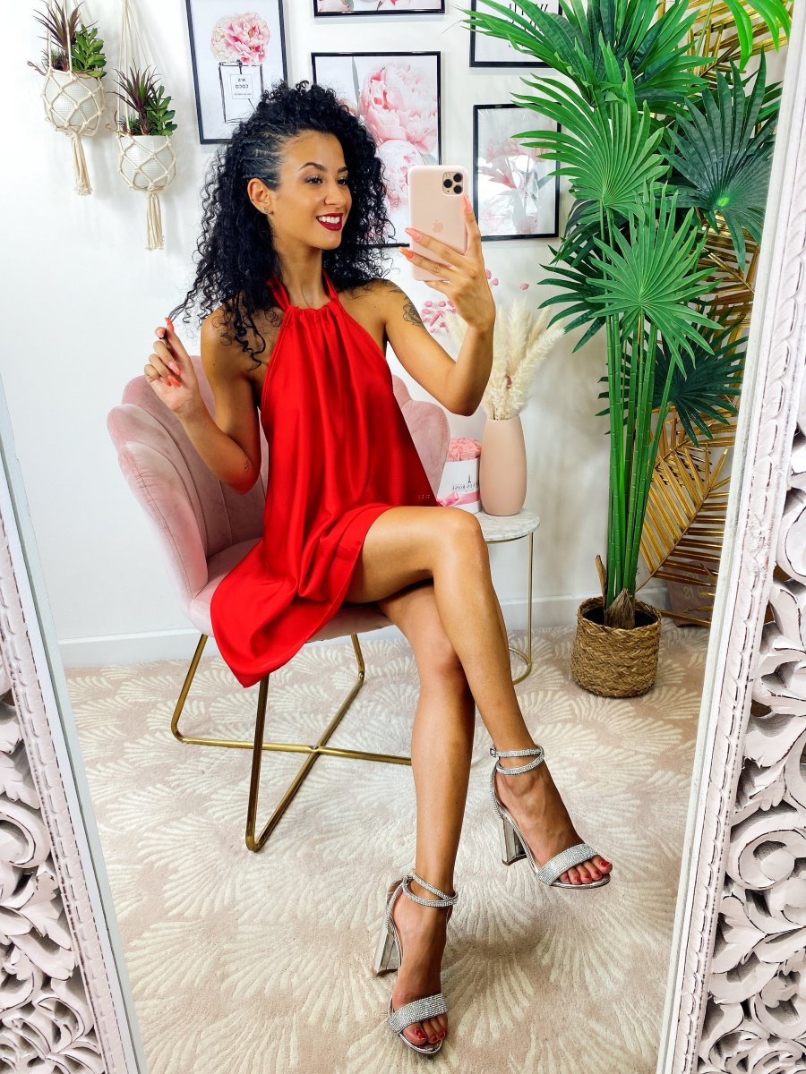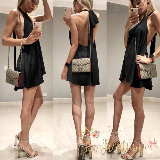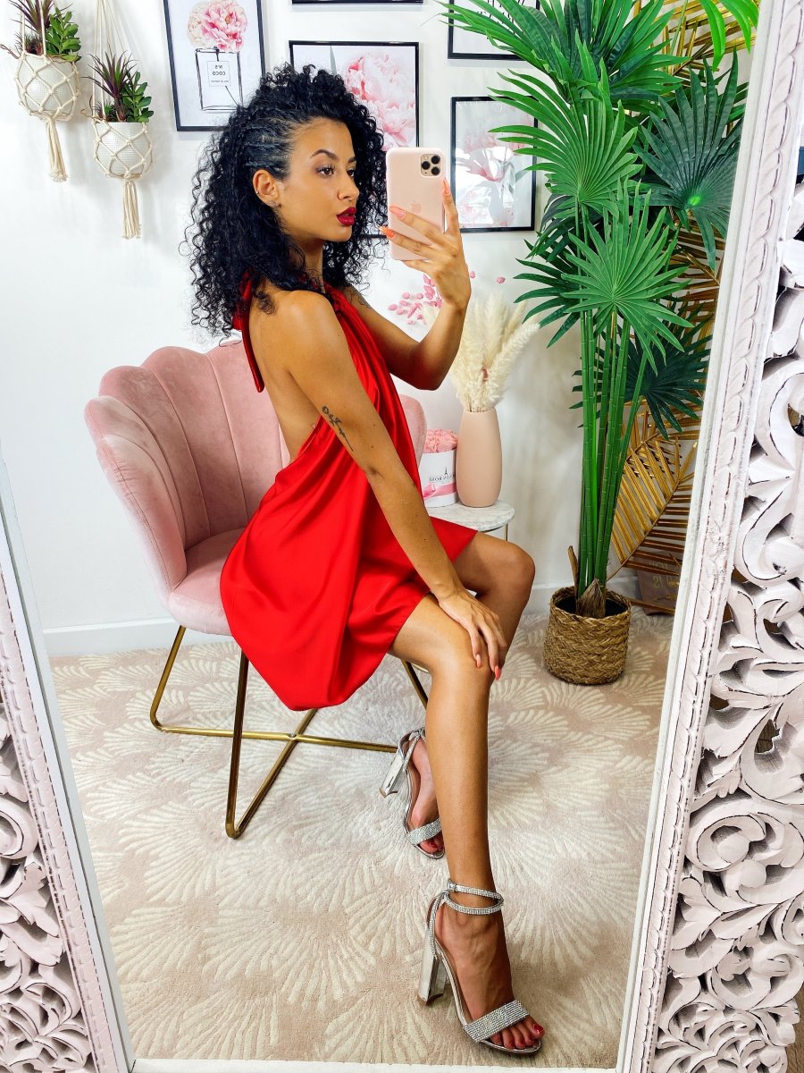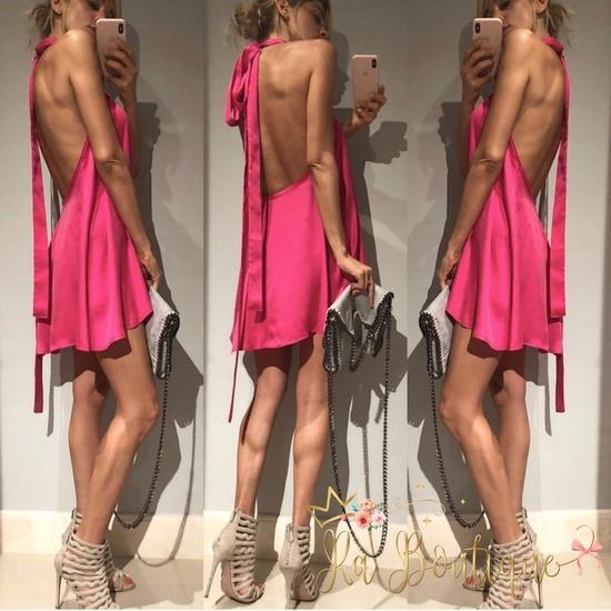 Abito in raso con maxi scollo sulla schiena e fiocco dietro al collo. Fresco e leggero