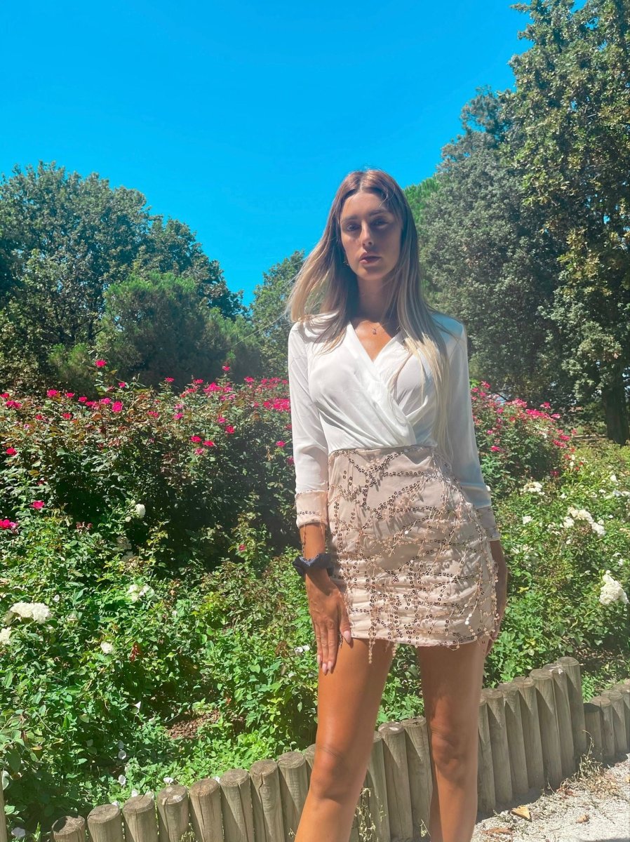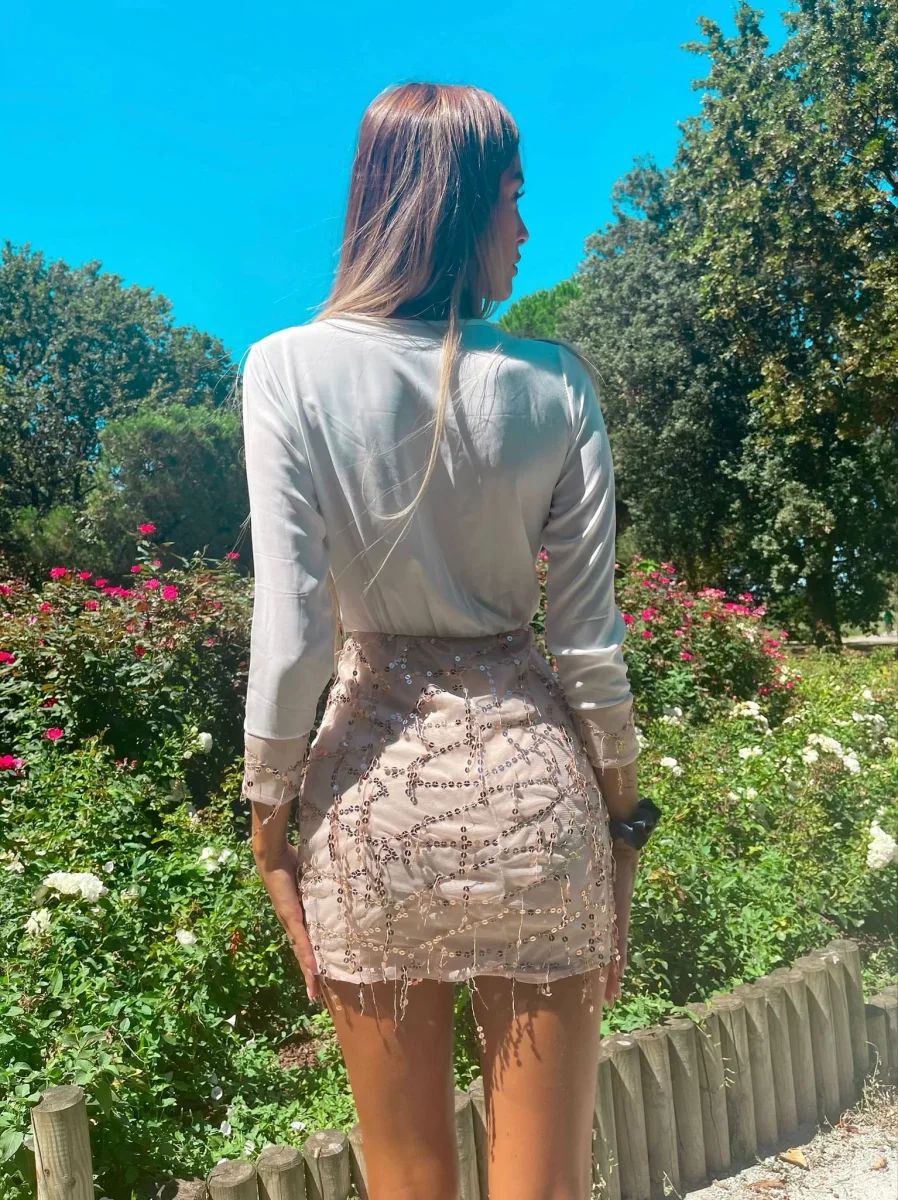 Dress con gonna in paillette elasticizzato in vita e con manica tono su tono. Un musthave per ogni tua serata!