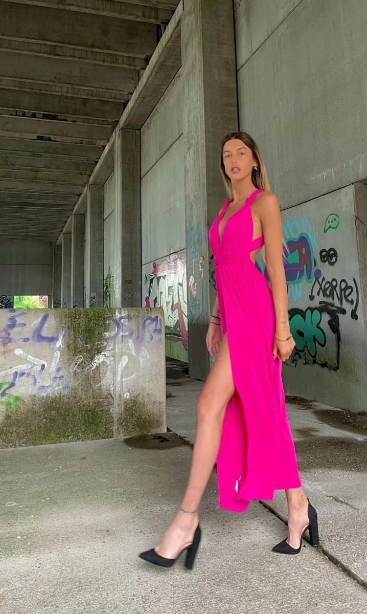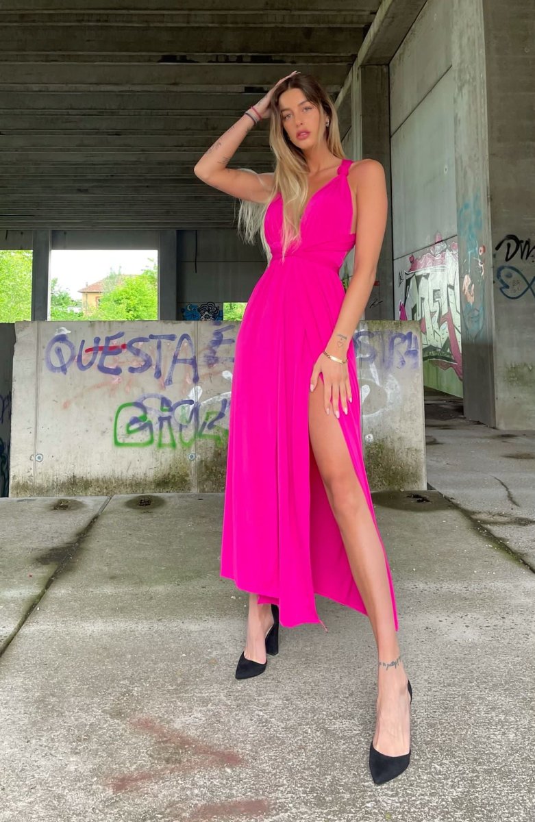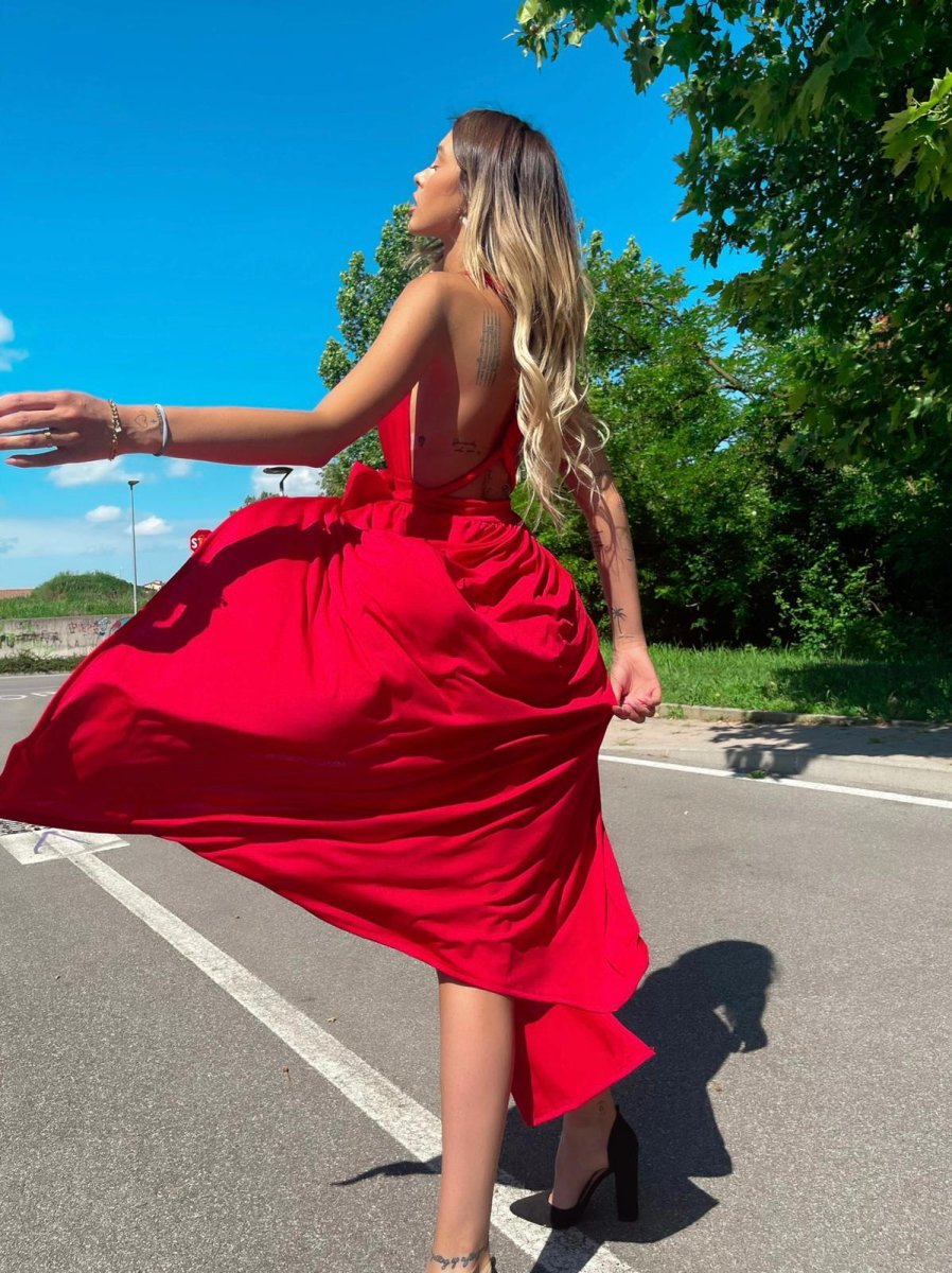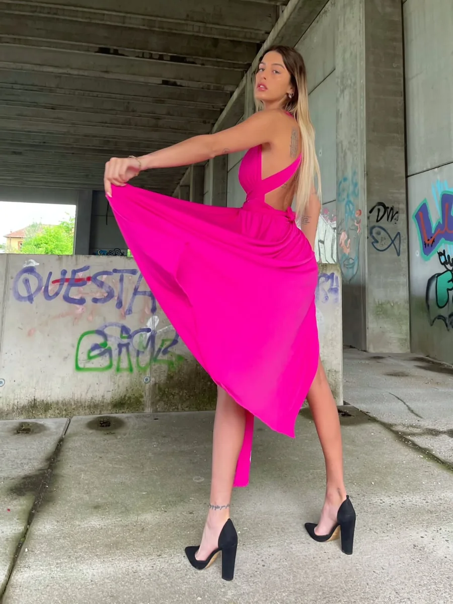 quest’abito è l’abito da sogno! Ampia gonna da cui partono due lacci lunghi da intrecciare in tanti modi diversi, dalla X dietro al collo all’intreccio davanti. Il tessuto elasticizzato lo rende molto comodo.