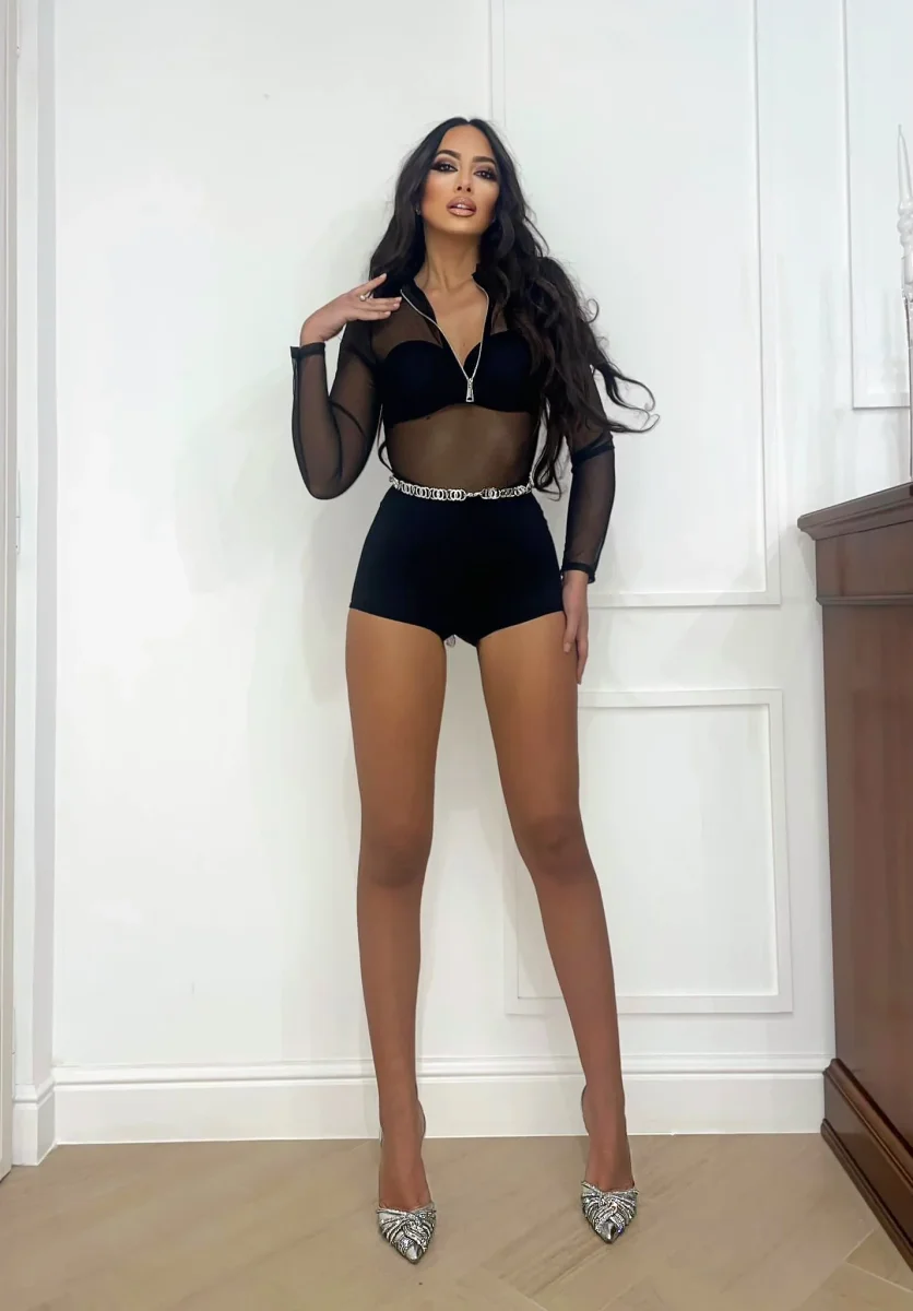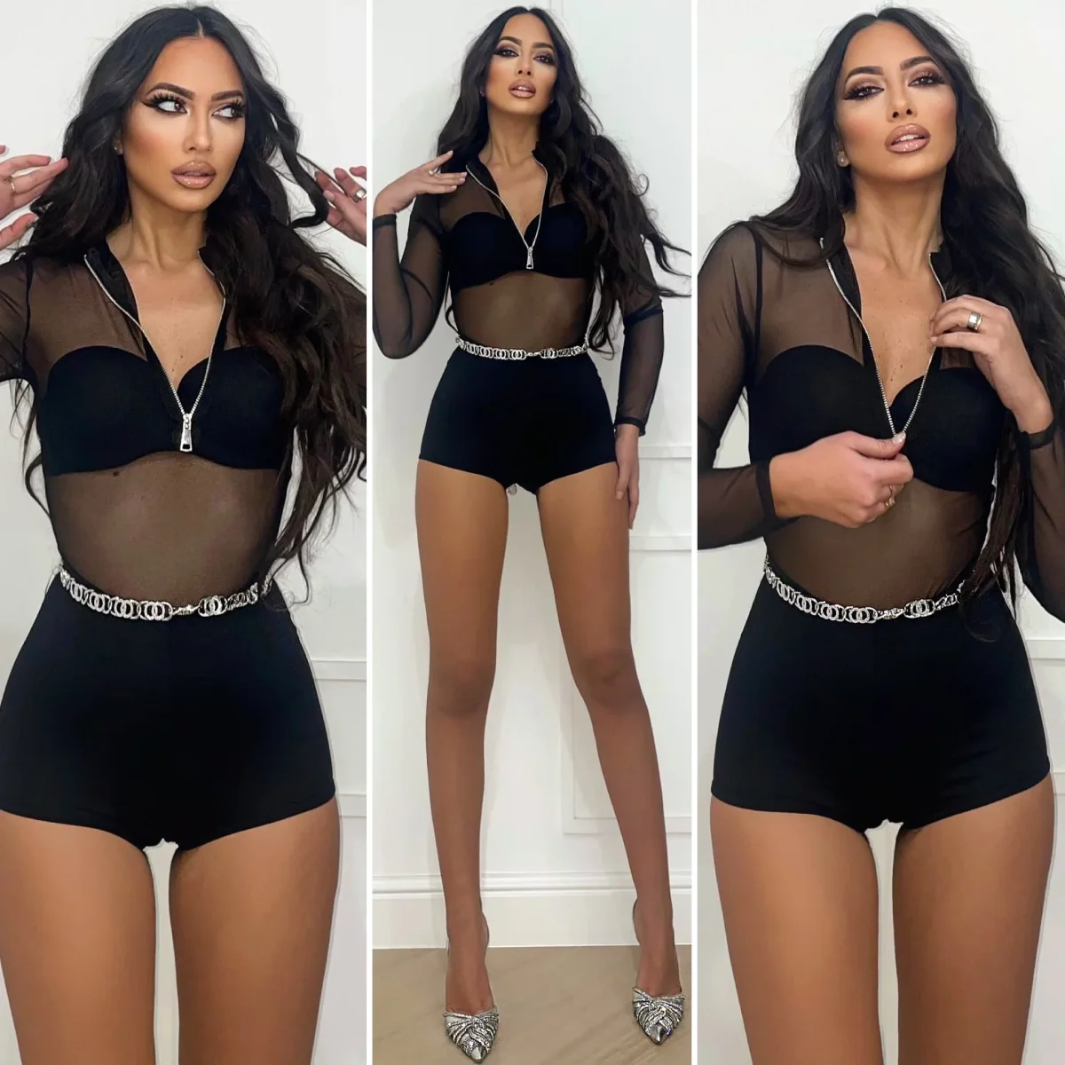 Set due pezzi venduti singolarmente composto da body in velo trasparente con zip sul davanti. E short in lycra aderente