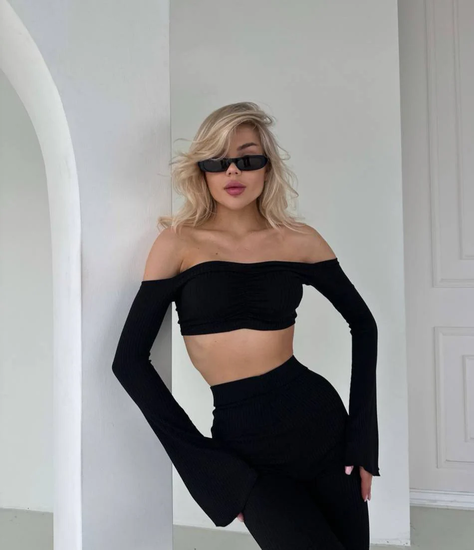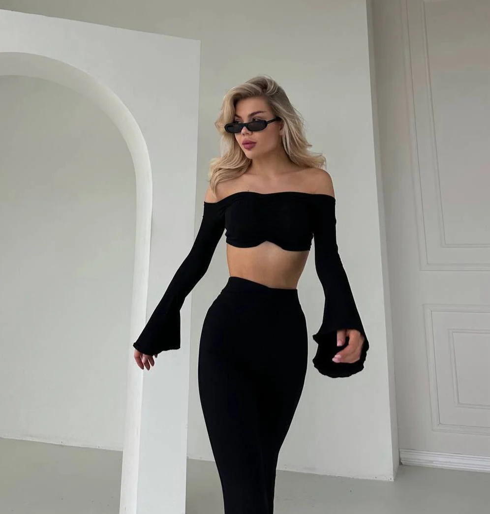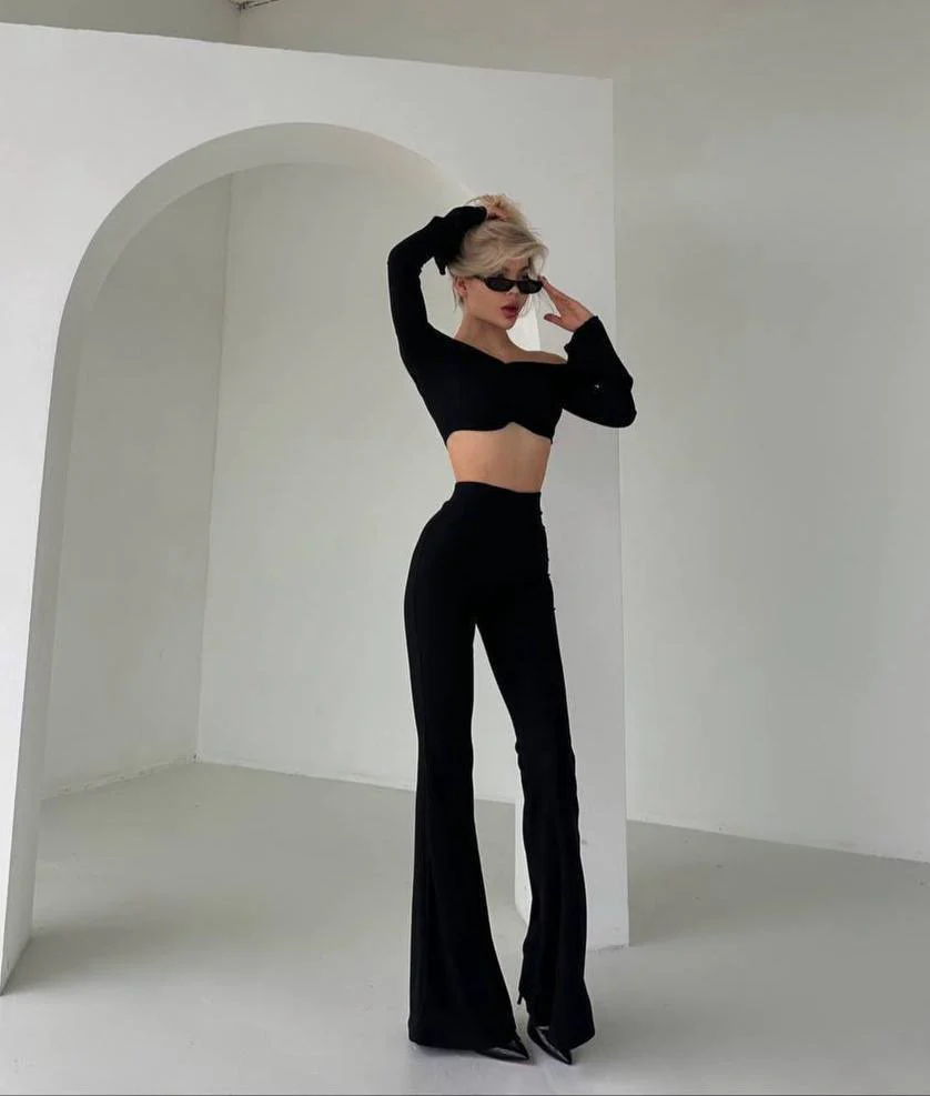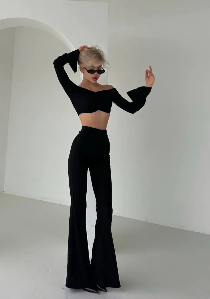 Due pezzi venduti singolarmente composti da top nero elasticizzato crop e pantalone a palazzo con elastico in vita . Tessuto 100% viscosa