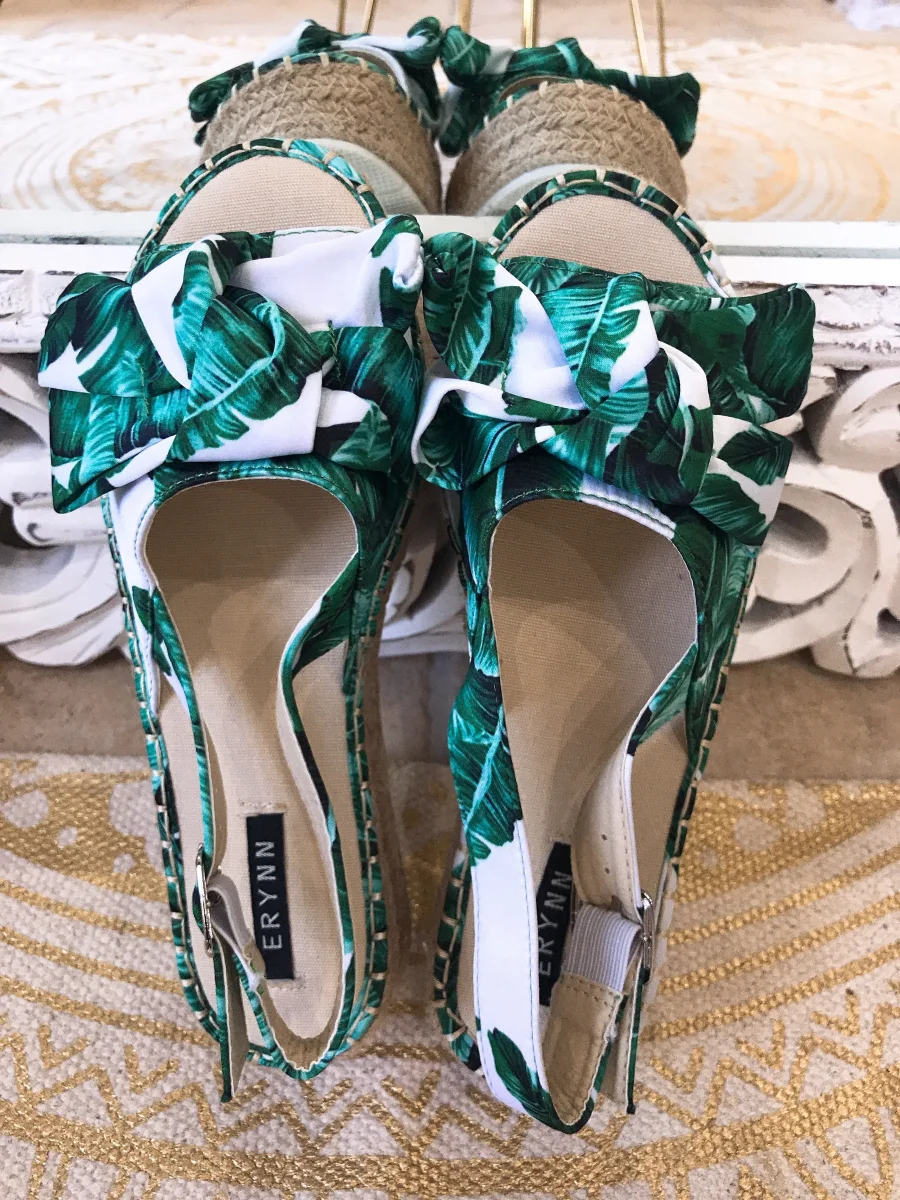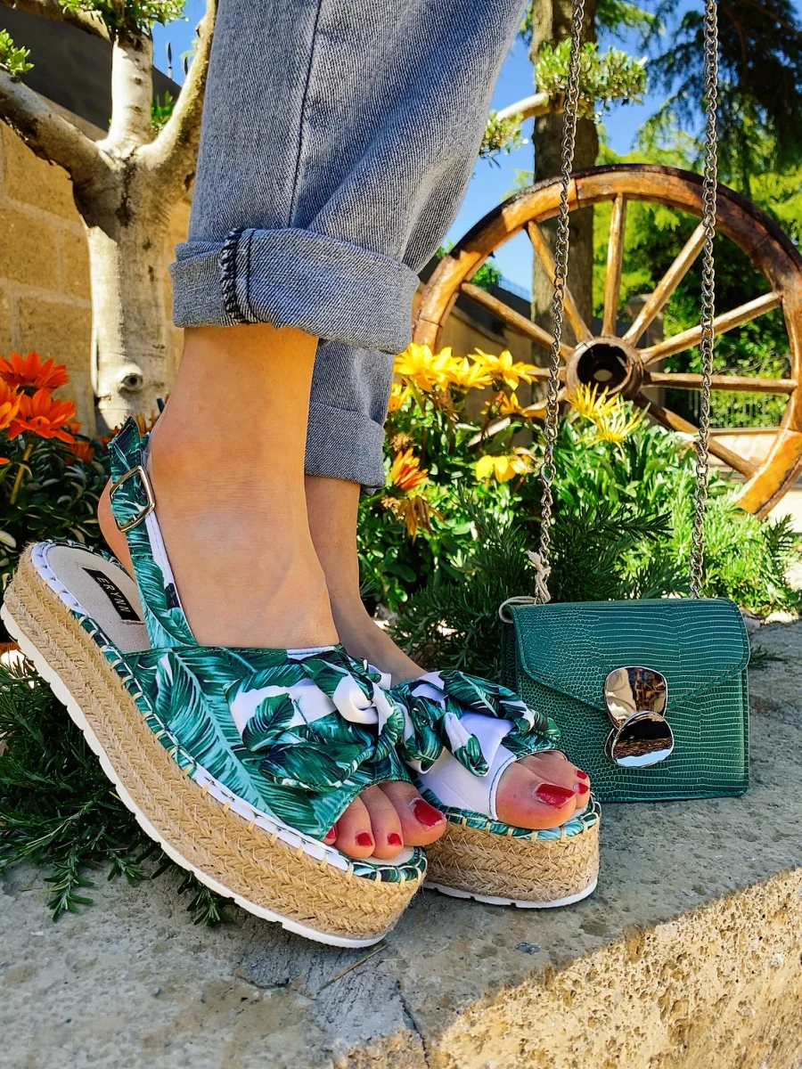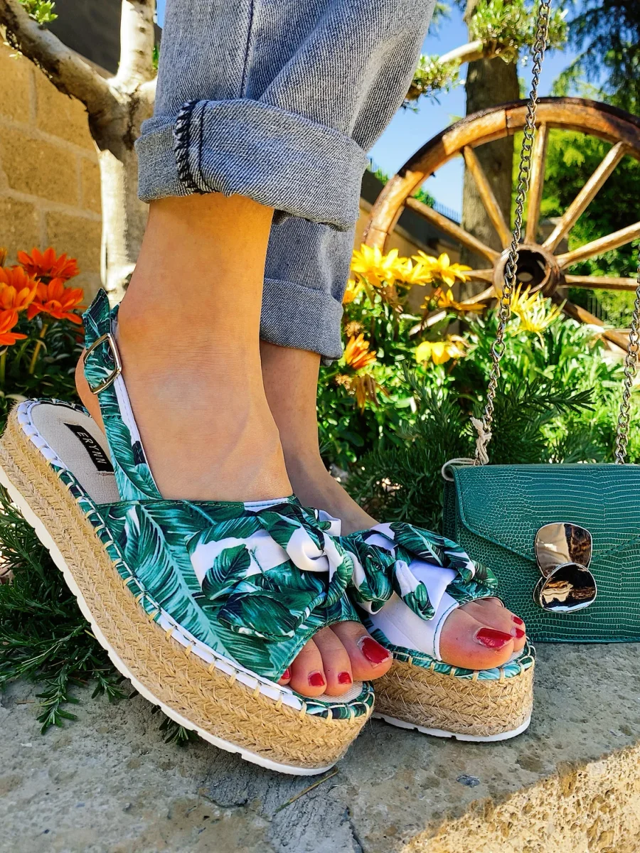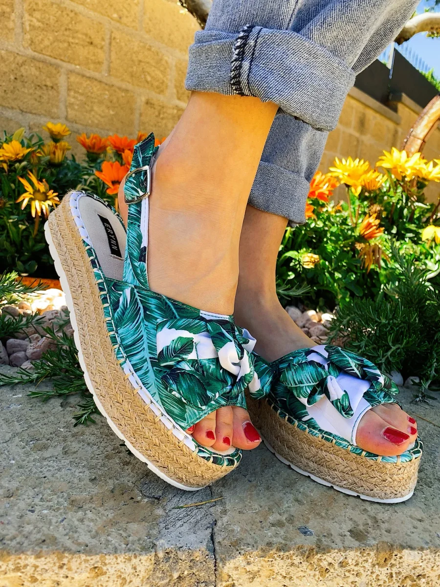 Espadrillas aperte sul tallone e con fiocco sul davanti. Stampa in base verde e bianca