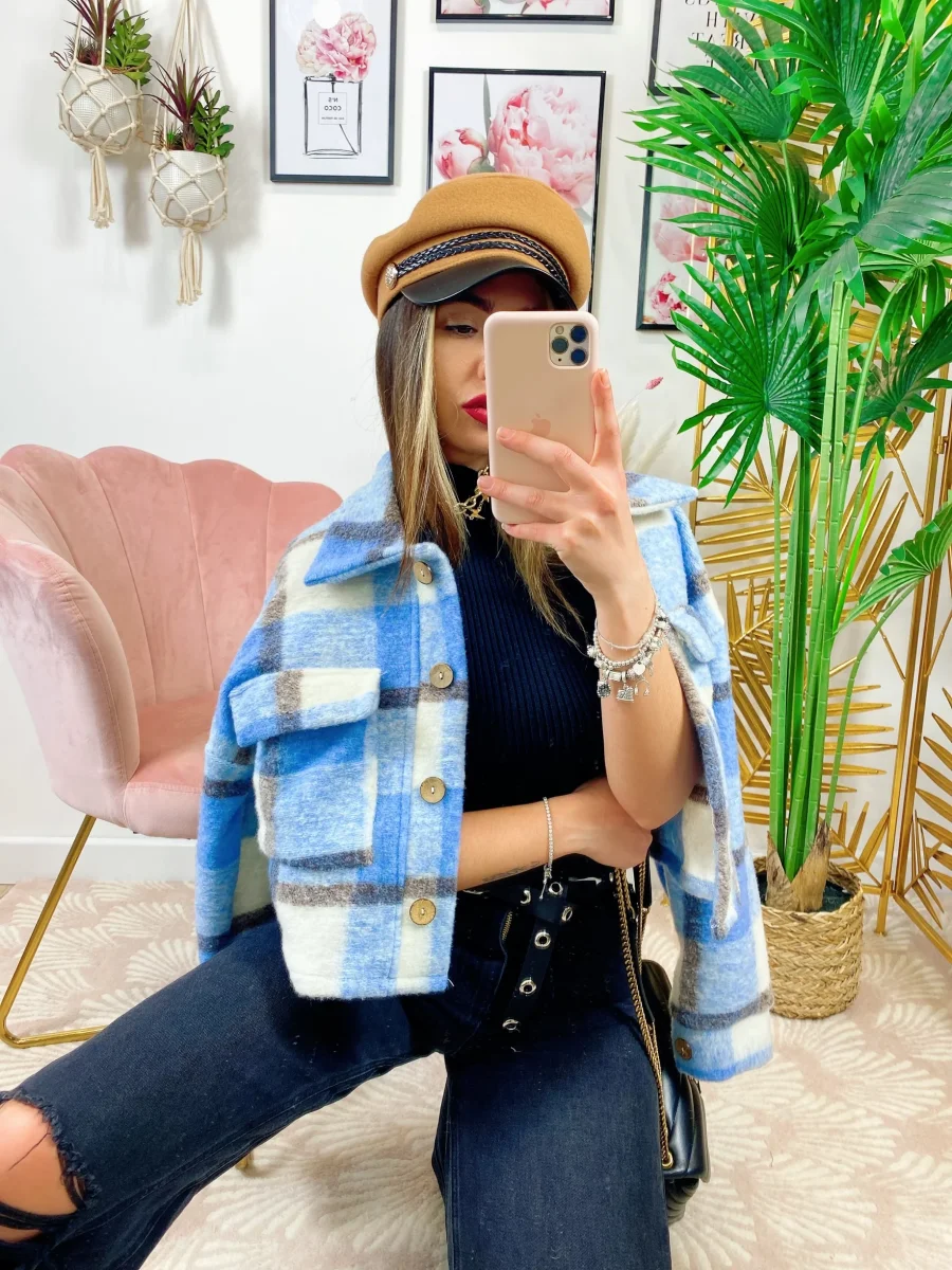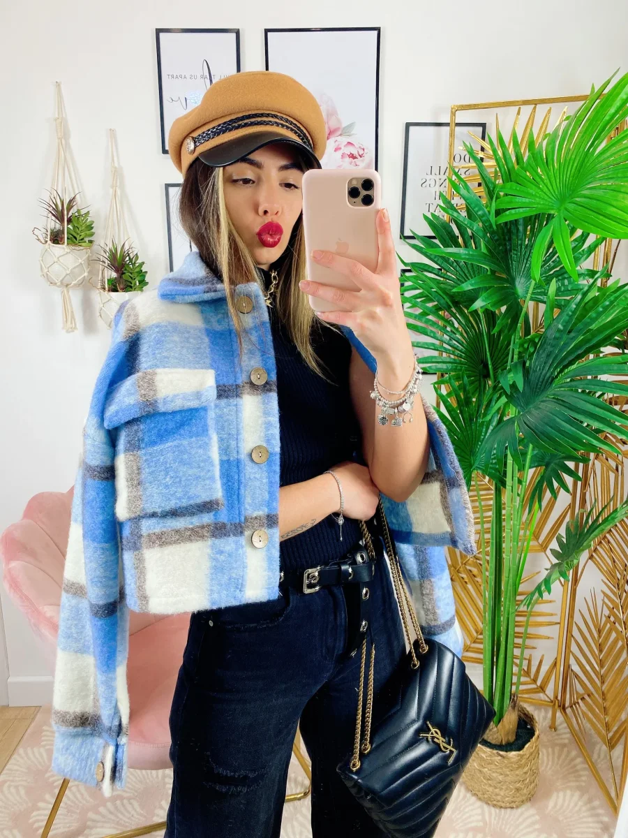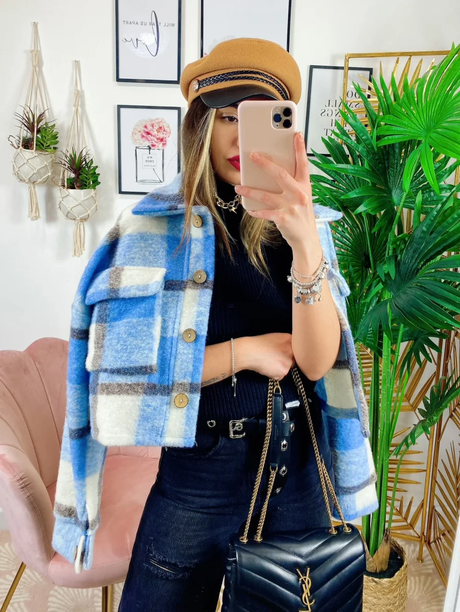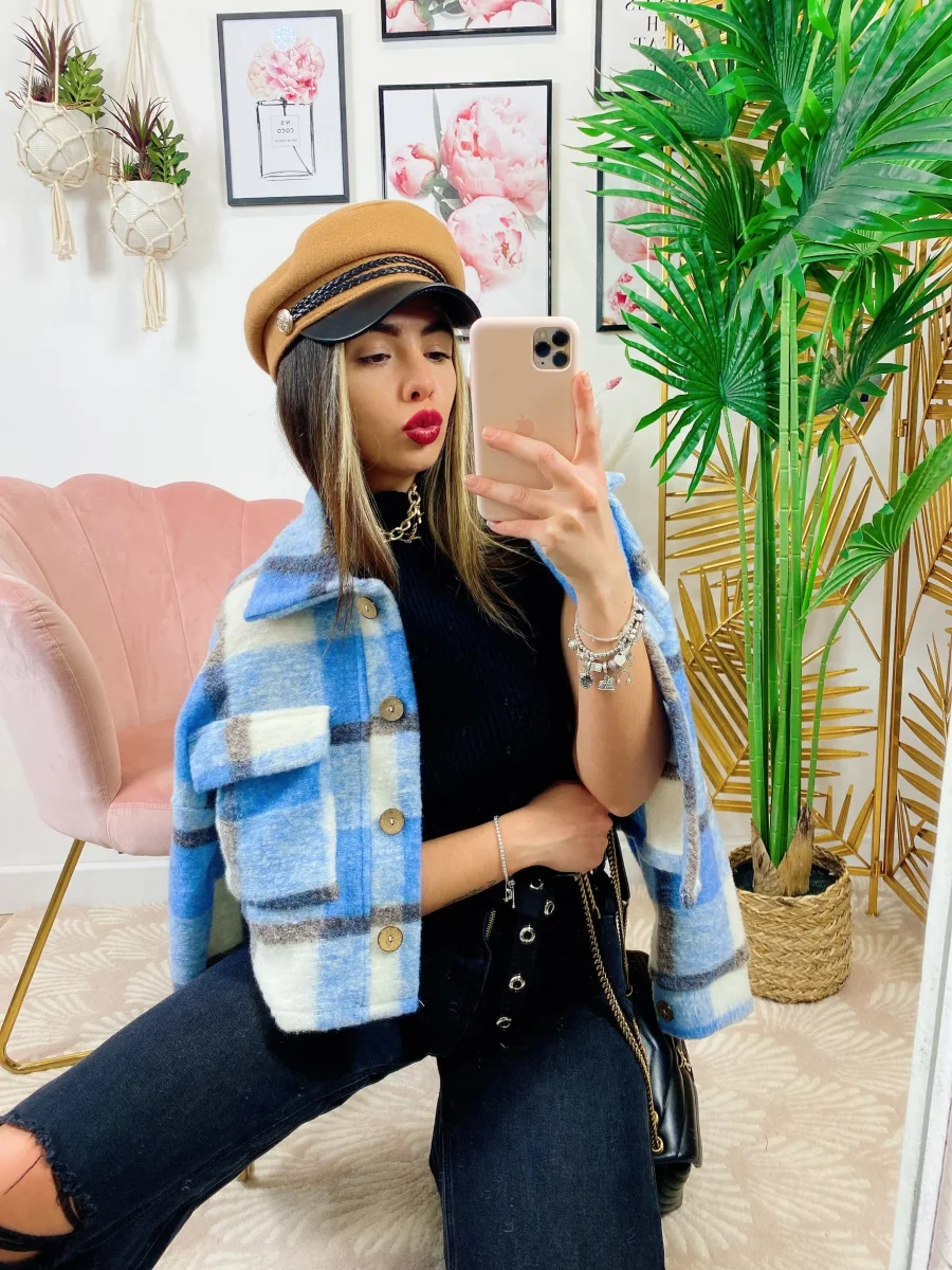 Giacca a quadri celeste dettagli neri Con