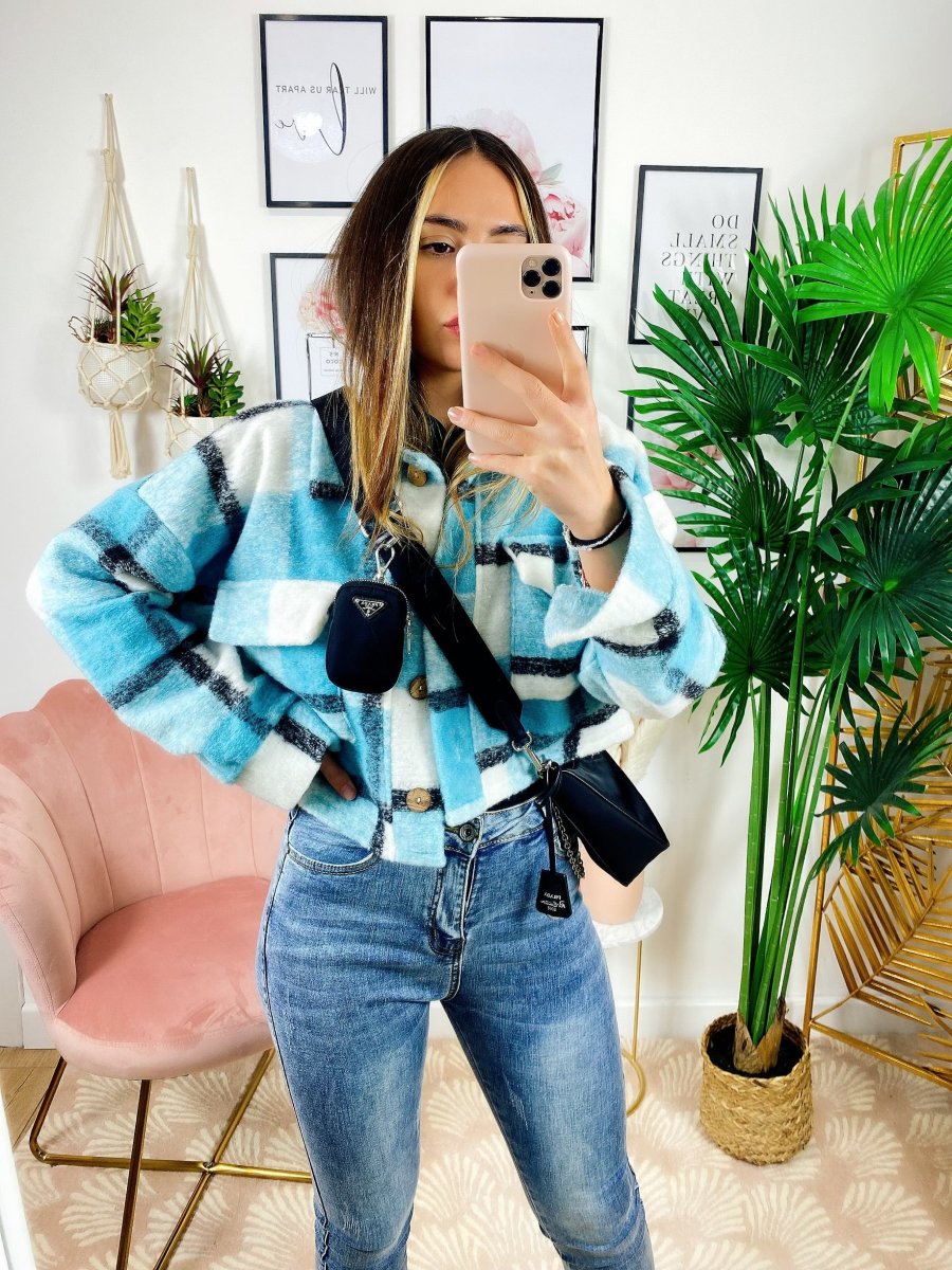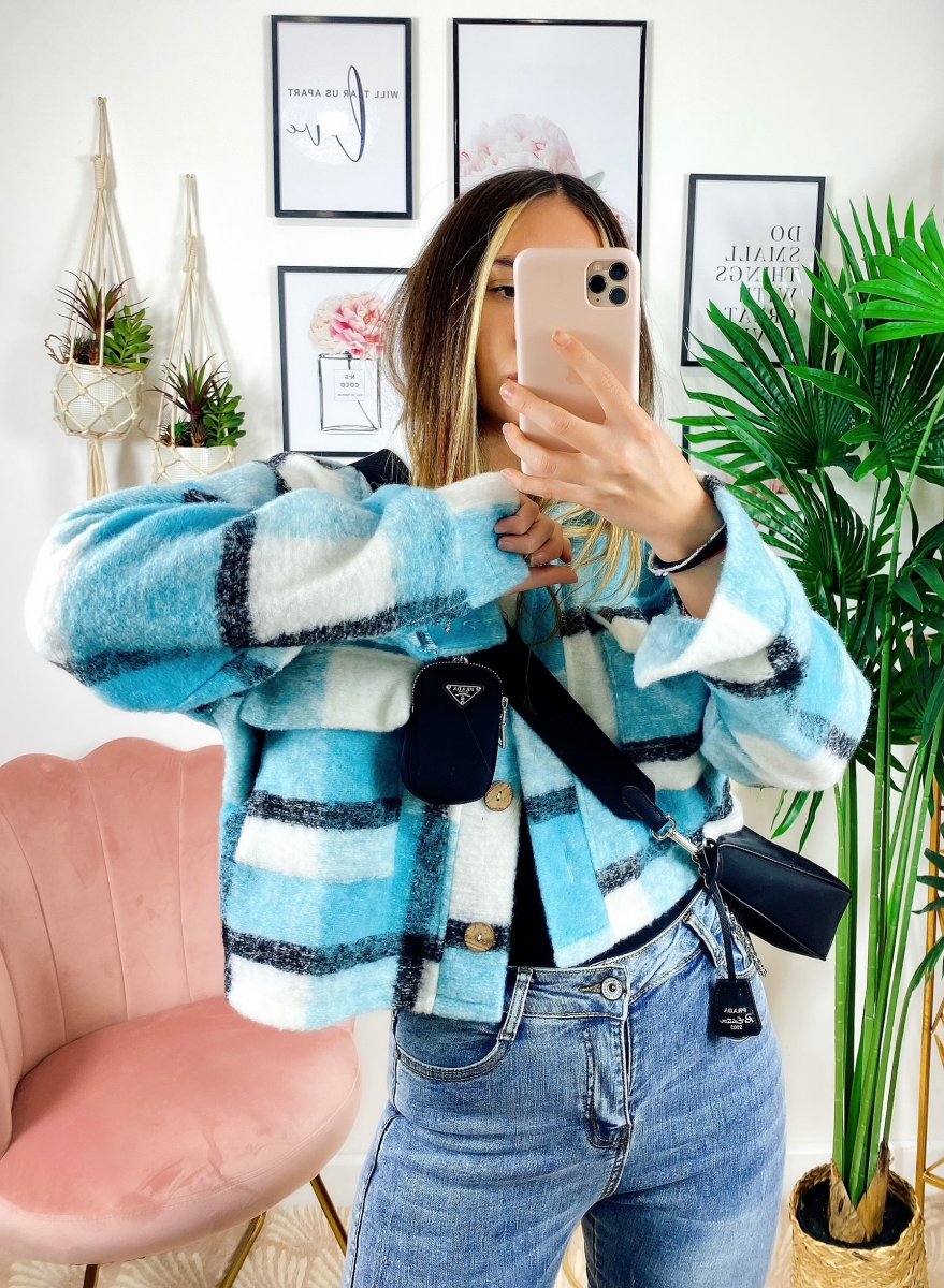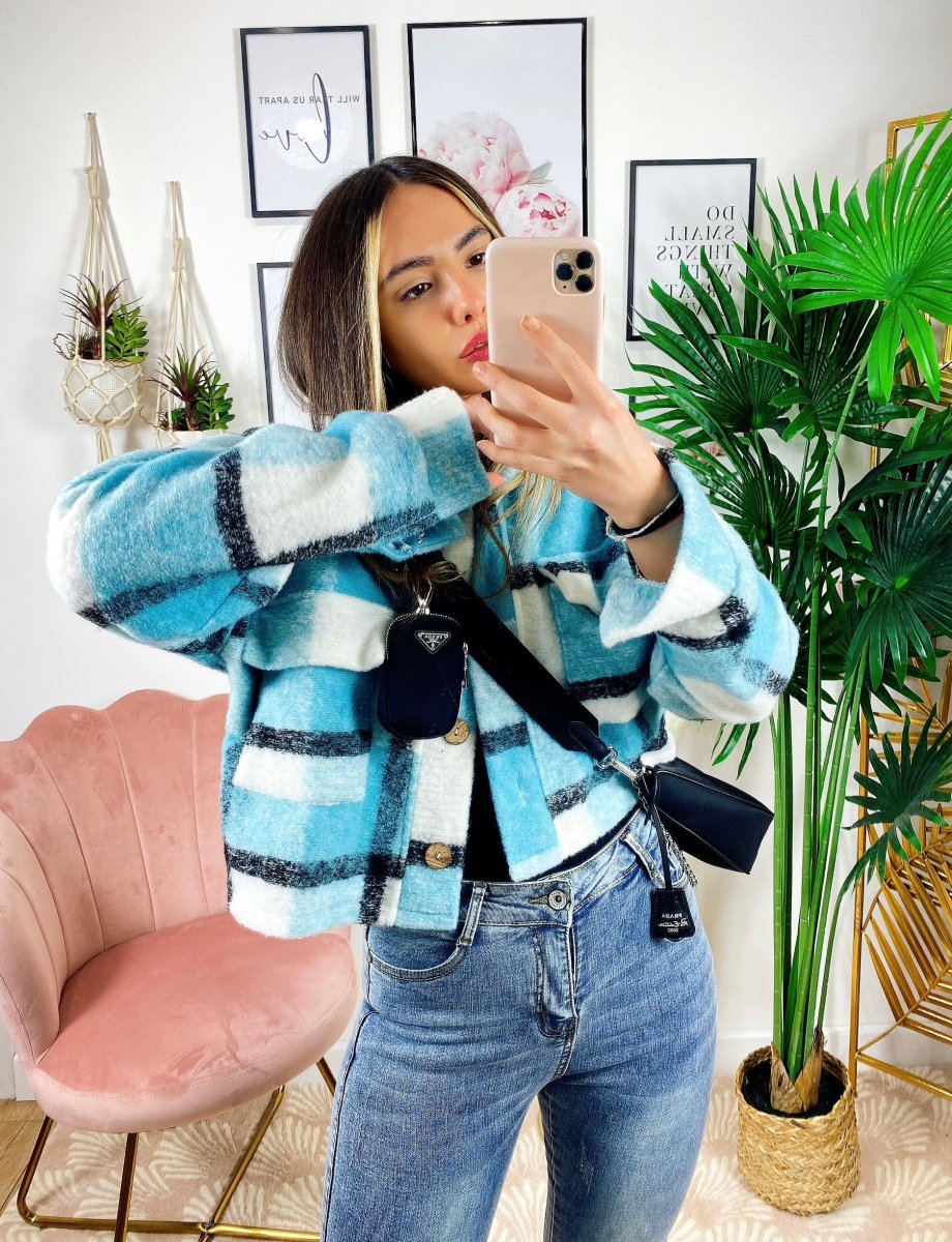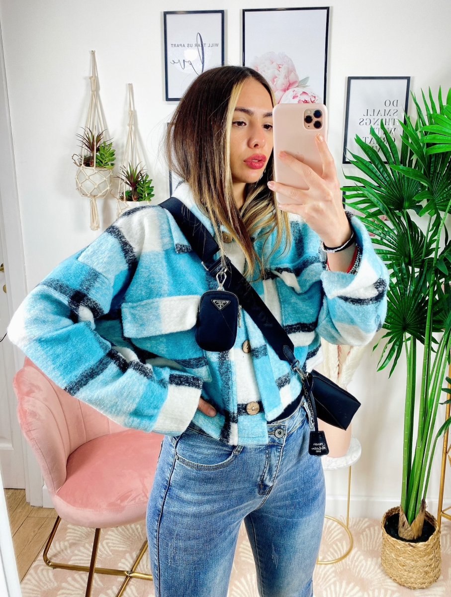 Giacca a quadri Celeste Con bottoni e tasche davanti.