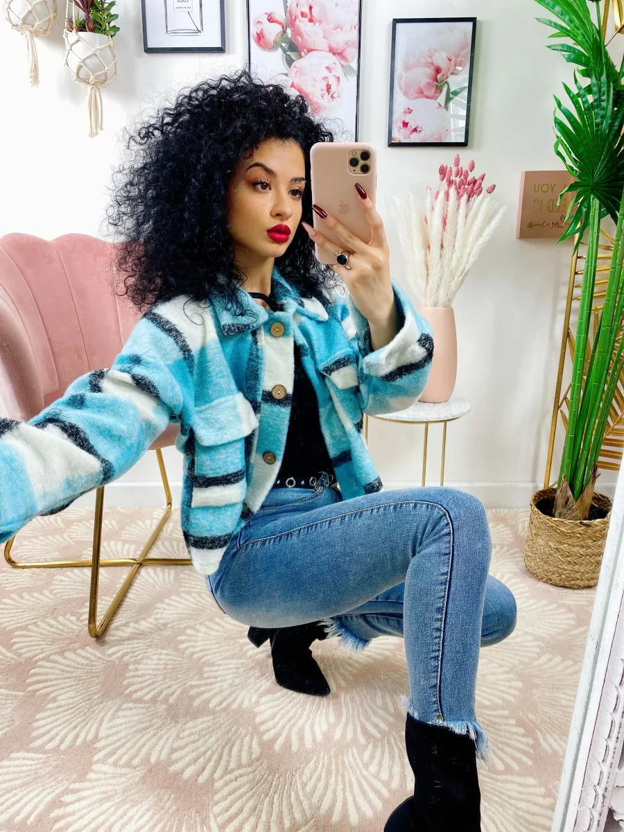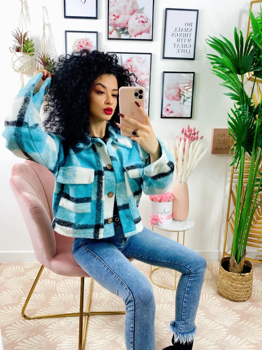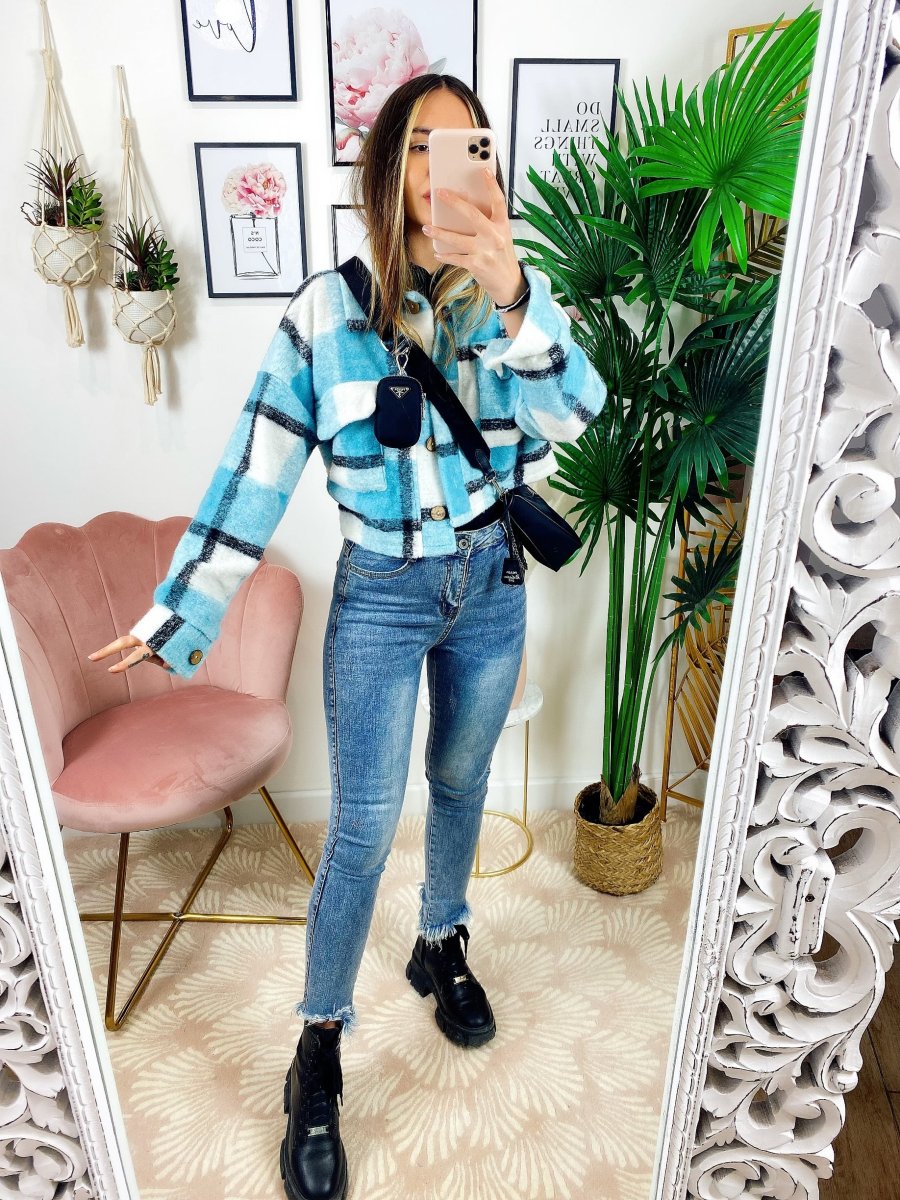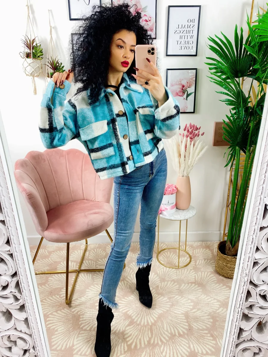 Giacca a quadri Celeste Con bottoni e tasche davanti.