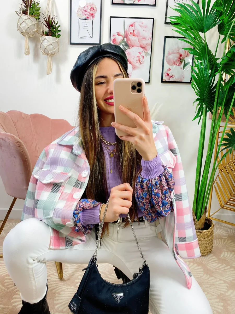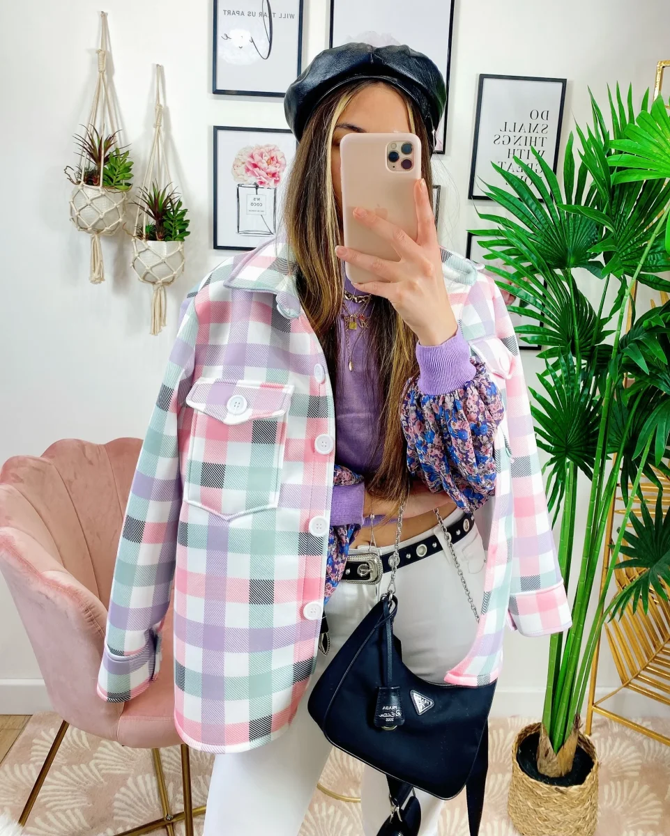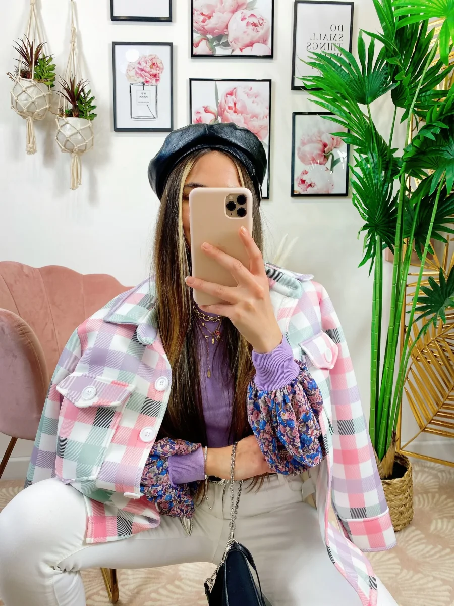Giacca a quadri nera e fucsia Con bottoni e tasche davanti.