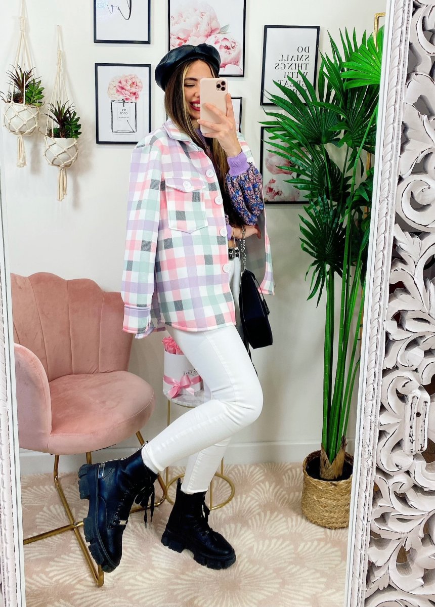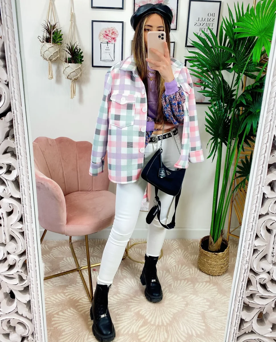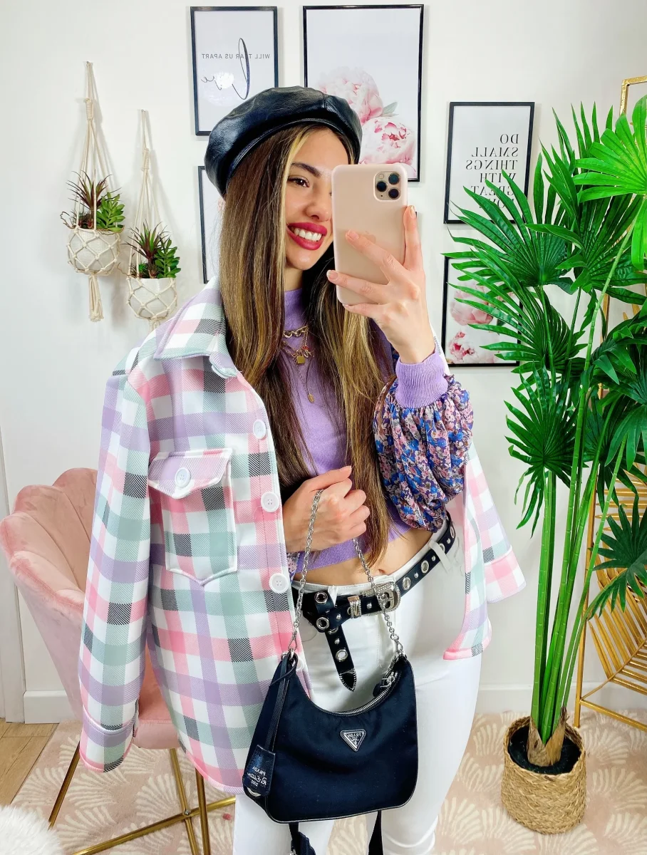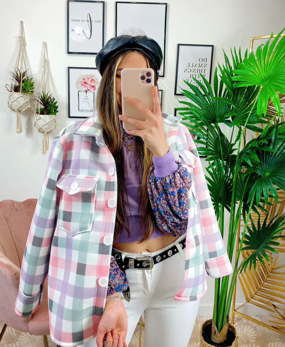 Giacca a quadri nera e fucsia Con bottoni e tasche davanti.