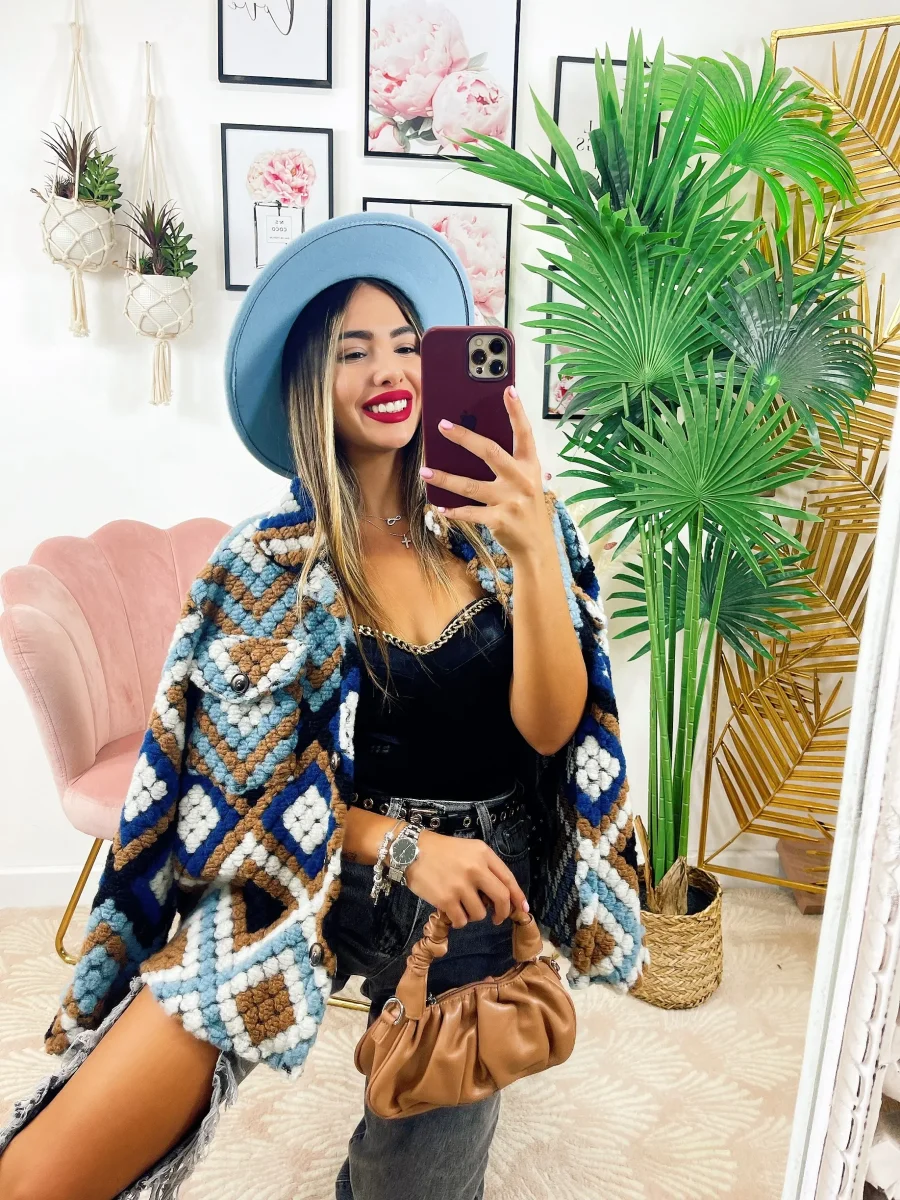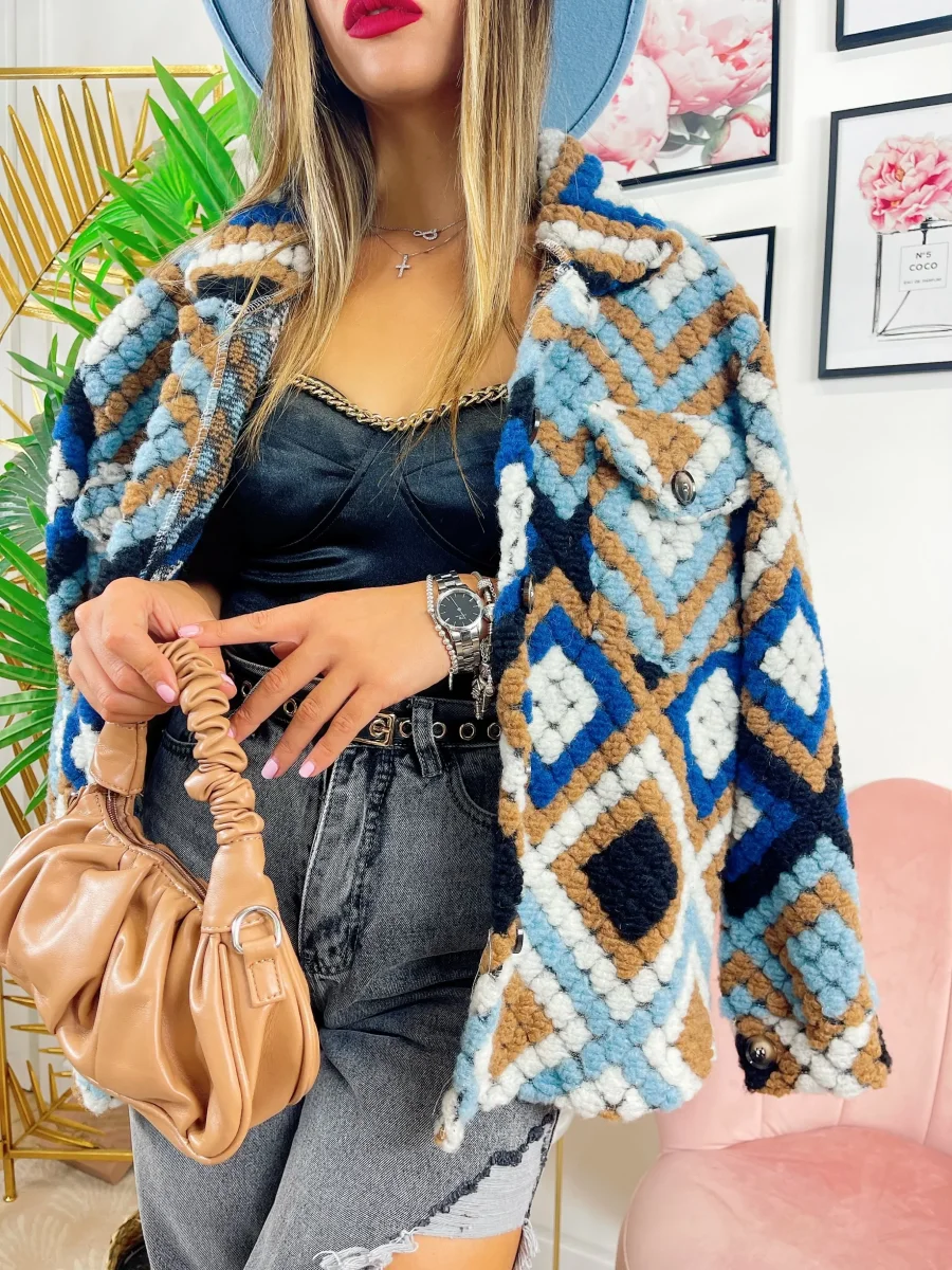 Giacca morbida e pesante a trama rombi azzurro celeste e Camel.