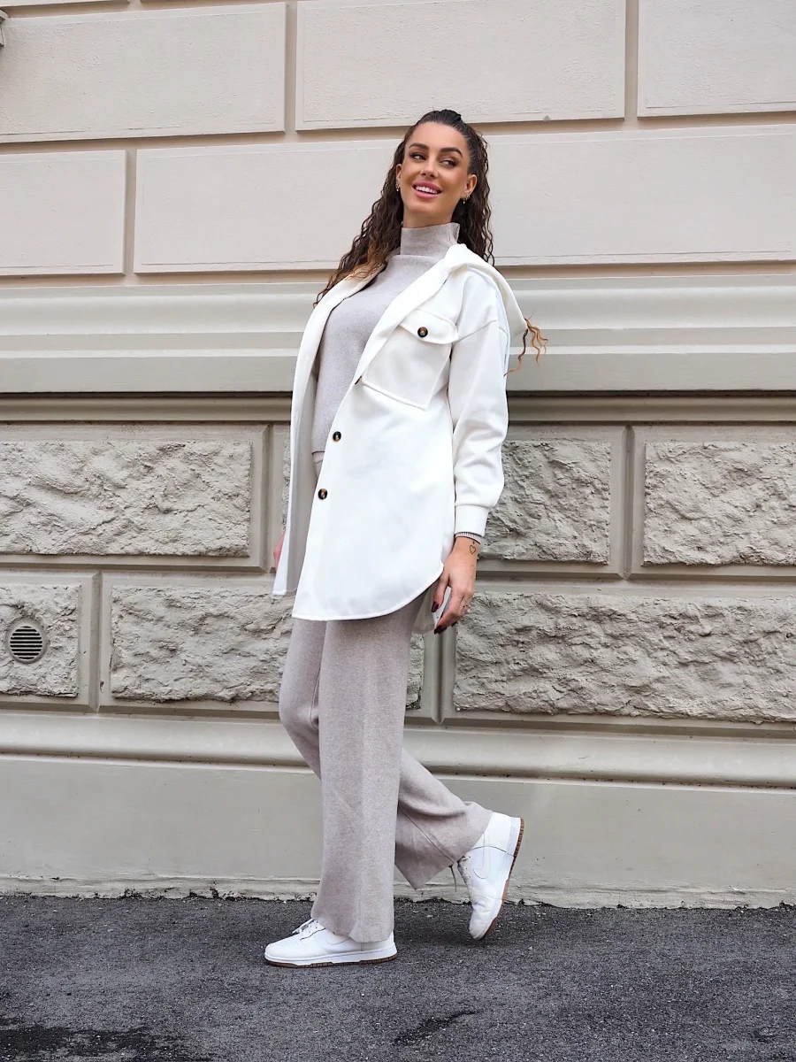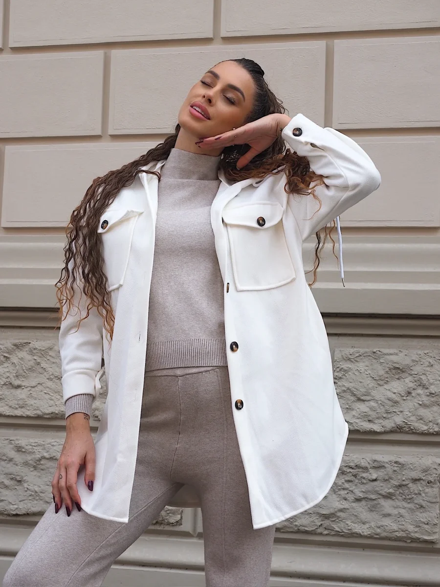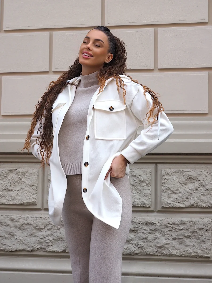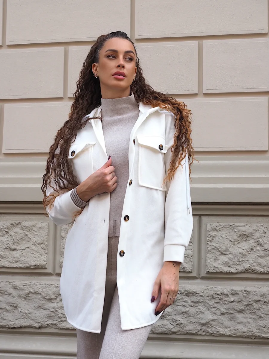 Giacca in lana con cappuccio e bottoni in dettaglio. Vestibilità morbida